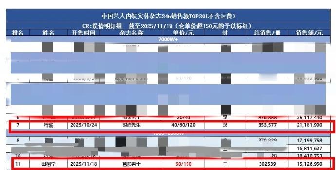 梓渝、田栩宁最新24h杂志战报梓渝《时尚先生》总榜top7田栩宁《芭莎男士》未进前十