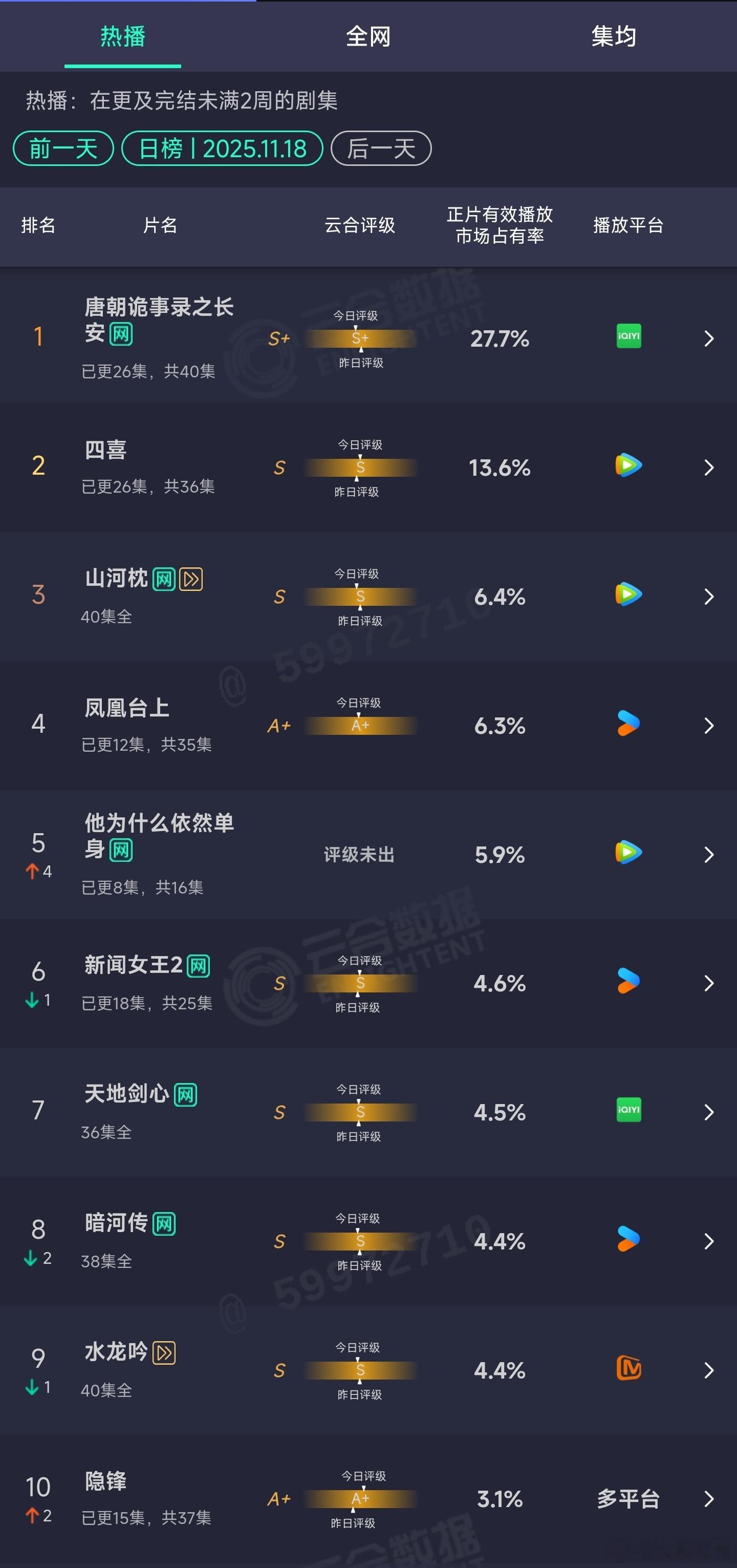11.18云合估算:唐诡3两连跌。太惨了,前10有8个1000万及以下
