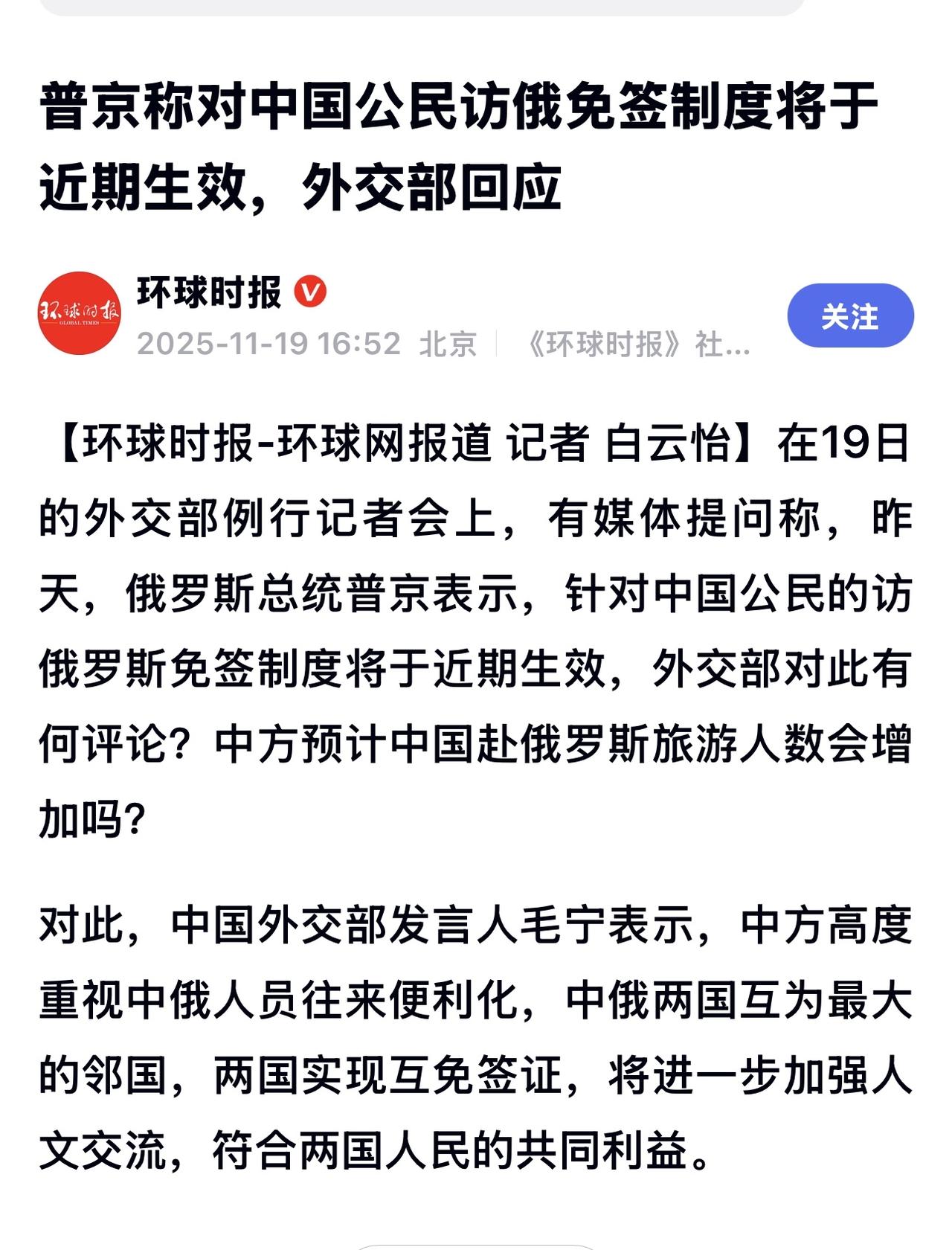 此前,中国官方宣布,从9月15日起对持俄罗斯普通护照的公民试行一年免签政策。 航班管家数据显示,中俄两国航班量恢复至2019年的94.9%,其中中国航司占比超52%、俄罗斯航司占比超47%。