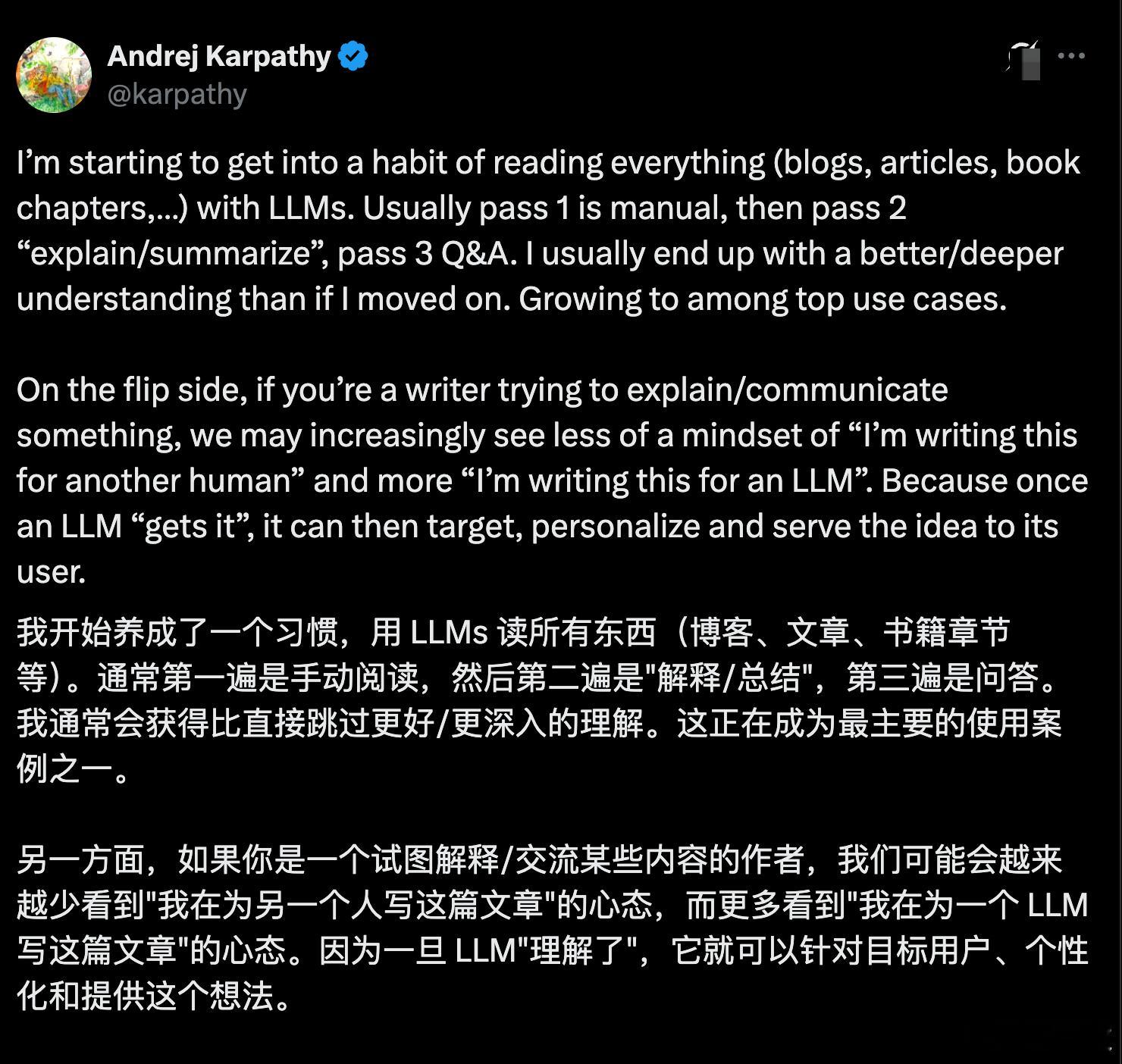 AI大神卡帕西分享了他的阅读方法,还顺手开源了一个小工具。他现在看书、看博客都要拉着LLM一起,并总结了一套三遍阅读法。第一遍自己先读,第二遍让AI解释和总结,第三遍针对不懂的地方向AI提问。他说这样读下来,理解深度远超以前那种读完就过的模式。他还预言,以后作者写文章,不再是优先考虑人类读者,而是写给LLM看的。这样更方便AI读懂核心逻辑,并根据每个读者的背景,个性化地讲给你听。为了配合这套流程,他发布了名为reader3的项目。👉github.com/karpathy/reader3/这是一个极简的EPUB电子书阅读器,功能非常单纯,就是方便你按章节把内容复制粘贴给LLM,让AI陪你一起读。据卡帕西说,这个项目不会再维护,而且90%的代码都是靠VibeCoding(让AI写)完成的。如果你想要新功能,直接把代码丢给AI让它帮你改就行。这个工具搭配三段式阅读法,相信会让你对“阅读”这件事的体验更上一层楼。