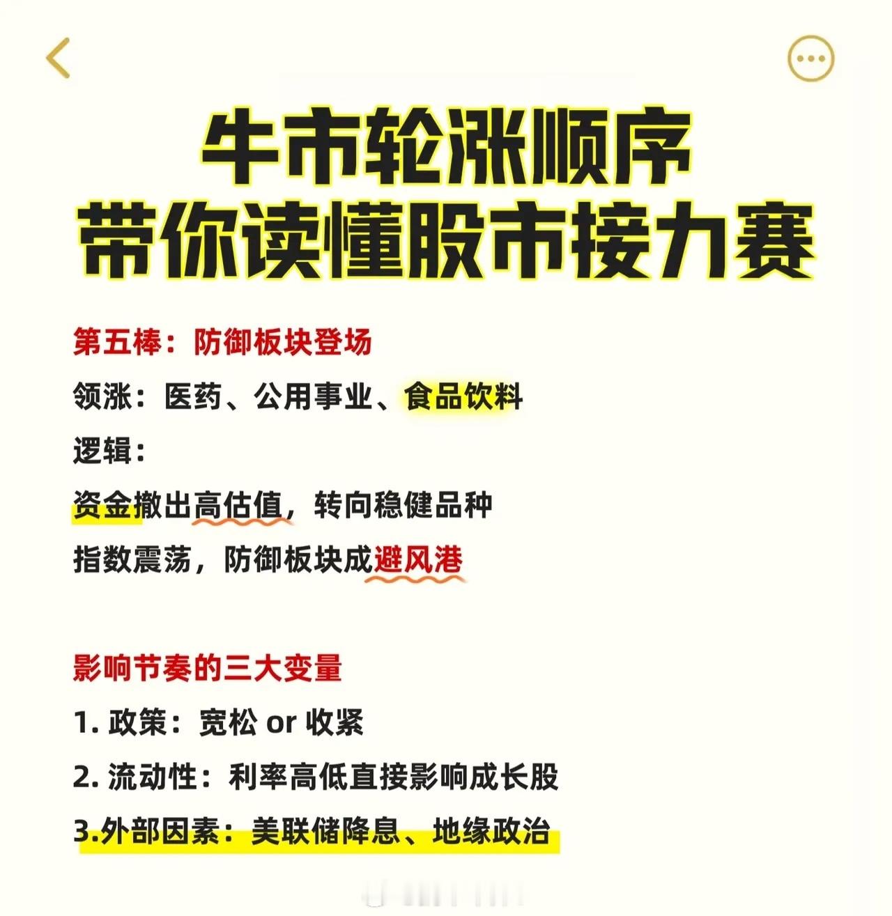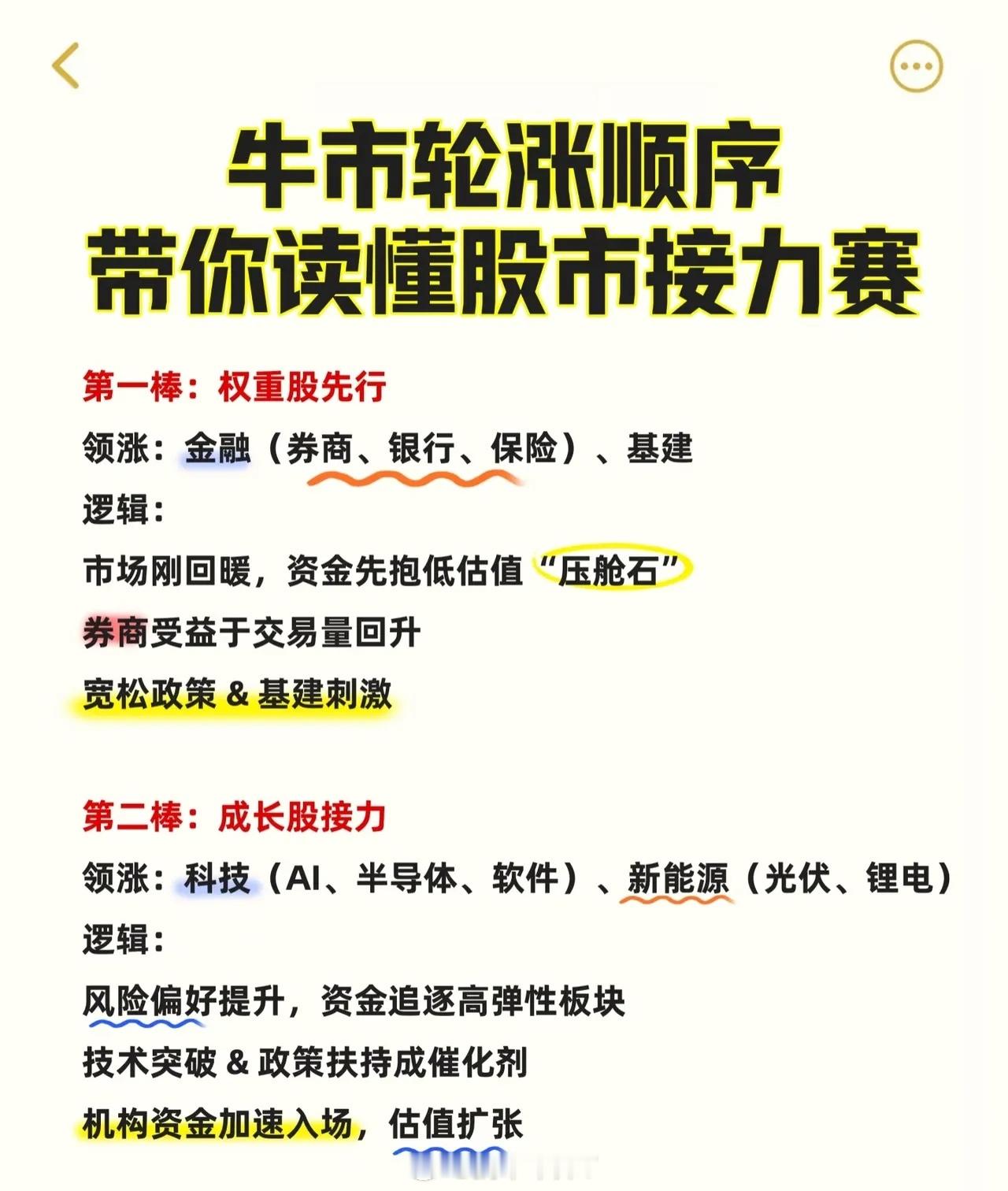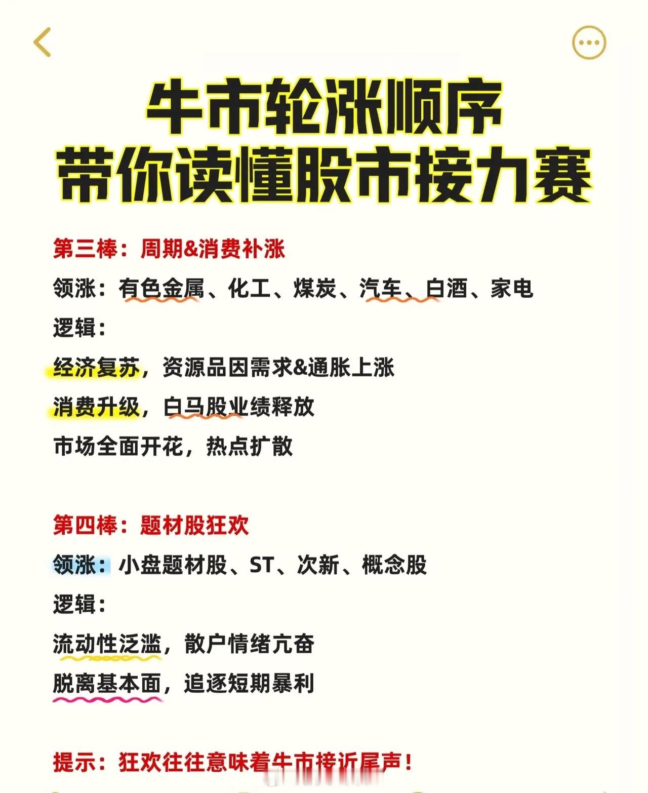 牛市轮涨顺序可总结为以下五个阶段及关键逻辑,同时需关注影响节奏的变量:第一棒:权重股先行市场刚回暖时,资金优先涌入低估值"压舱石"。领涨板块为金融(券商、银行、保险)和基建,其中券商受益于交易量回升,宽松政策与基建刺激是核心驱动力。第二棒:成长股接力随着风险偏好提升,资金转向高弹性板块。科技(AI、半导体、软件)和新能源(光伏、锂电)领涨,催化剂包括技术突破、政策扶持及机构资金加速入场带来的估值扩张。第三棒:周期&消费补涨经济复苏阶段,资源品因需求和通胀上涨(如有色金属、化工、煤炭),汽车、白酒、家电等消费板块因消费升级释放业绩。市场进入全面开花阶段,热点扩散明显。第四棒:题材股狂欢流动性泛滥下,散户情绪推高小盘题材股、ST股、次新股及概念股,资金脱离基本面追逐短期暴利。此阶段常伴随市场情绪过热,红色警示强调"狂欢往往预示牛市接近尾声"。第五棒:防御板块登场当指数震荡或市场风险上升时,资金转向医药、公用事业、食品饮料等稳健品种避险。影响牛市节奏的三大变量:1. 政策导向(宽松或收紧);2. 流动性环境(利率高低直接影响成长股估值);3. 外部因素(如美联储降息、地缘政治等)。整体呈现从低估值权重→高成长赛道→经济复苏受益板块→投机性题材→防御资产的轮动逻辑,各阶段转换受资金风险偏好、宏观环境及政策变化驱动。