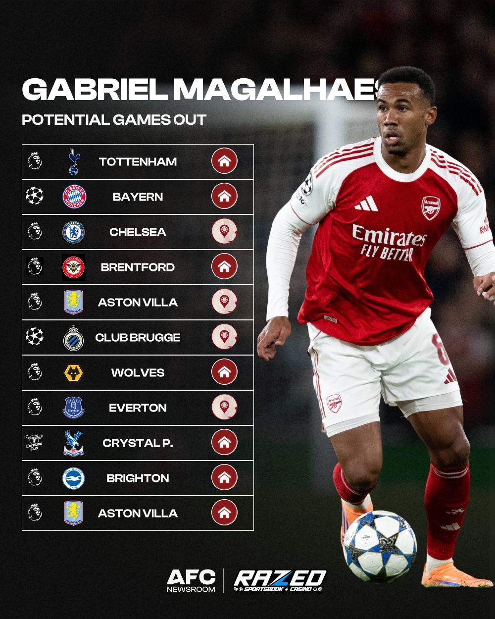 如果加布里埃尔因伤缺席一到两个月,那么他可能会缺席以下比赛