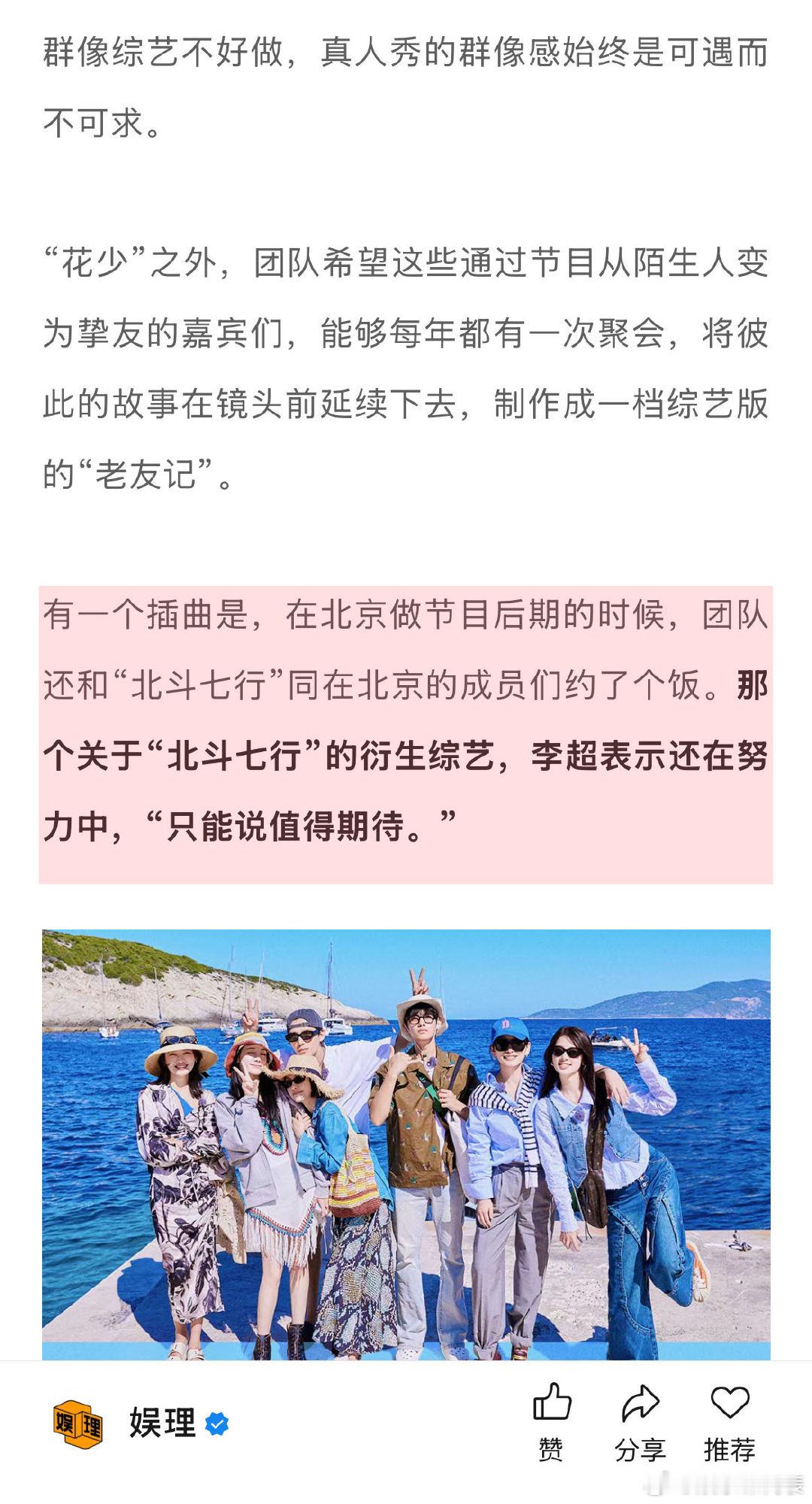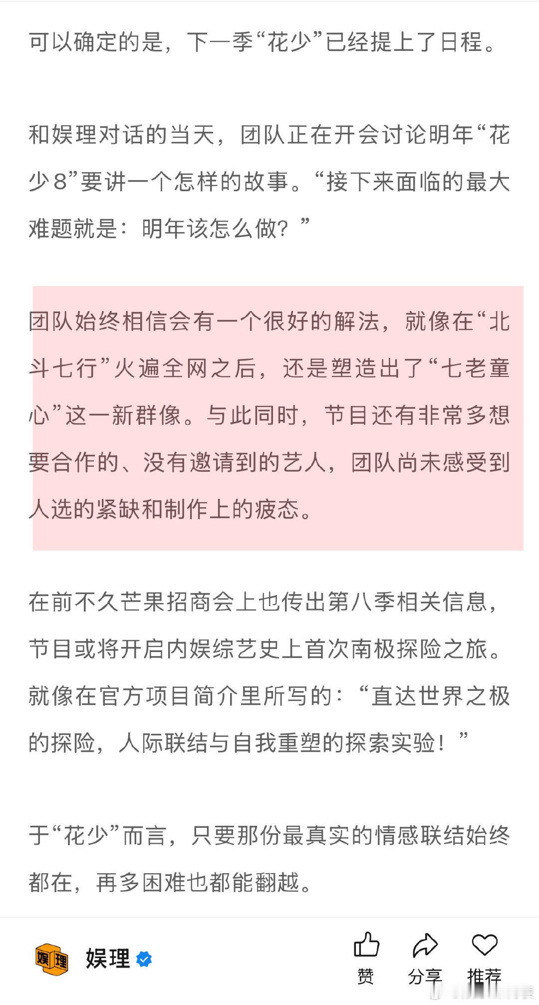 据 了解,下一季“花少”已经提上了日程。团队已在讨论明年“花少8”要讲一个怎样的故事。“接下来面临的最大难题就是:明年该怎么做?”团队始终相信会有一个很好的解法,就像在“北斗七行”火遍全网之后,还是塑造出了“七老童心”这一新群像…