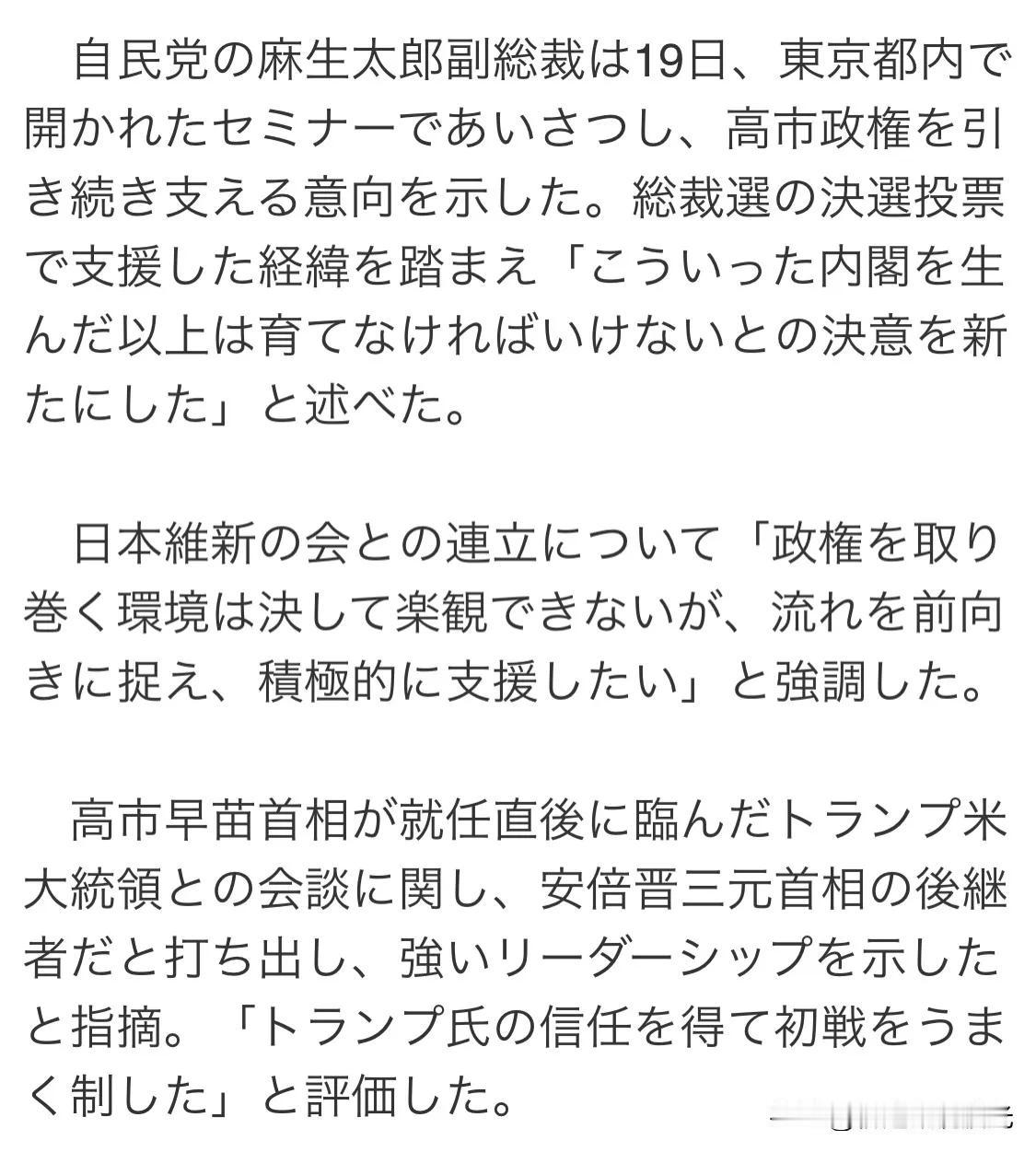 我有预感,日本估计要变天了! 最近,日本共同通信社的一则报道引发不少讨论——自民党副总裁麻生太郎公开为高市早苗站台,有网友猜测这或许意味着相关政治格局即将发生变化。 从公开信息来看,麻生太郎作为日本政坛资深人物,此次站台行为属于正常的政党内部互动。 日本自民党内部向来有资深成员为党内同僚背书的传统,这类站台操作更多是政党内部资源协调的一种表现,不必过度解读。 不过,网友之所以会联想到“下台”相关猜测,也和日本政坛的运作特点有关。在多党竞争的背景下,政治人物的公开动向往往会被外界赋予多重解读,尤其是资深大佬的站台行为,容易被和派系博弈、权力调整等话题关联起来。 但客观来说,仅凭一次站台就推断“快下台”并不严谨。日本的政治进程有其自身的规则和节奏,任何权力变动都需要结合党内选举、民意支持率等多重因素综合判断。目前并没有权威信息证实相关变动即将发生,各类猜测仍停留在舆论讨论层面。 对于这类国际政坛动态,保持理性看待很重要。政党内部的互动本是常态,过度放大单一事件的影响,反而容易偏离事实本质。后续不妨关注日本官方发布的信息,才能更准确地了解其政坛的真实走向。 对此你怎么看?欢迎评论区留言!