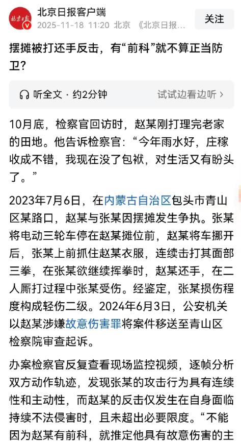11月18日报道,内蒙古包头,刑满释放人员赵某摆摊时和张某发生争执,张某抓住赵某的衣领打了他三拳,欲再打时赵某还手致其受了伤,案发后民警认为赵某涉嫌故意伤害罪,将他移交给了检方审查起诉。赵某不服:难道就因为我有前科,就不算正当防卫了吗? 2023年7月6日,赵某为了踏实过日子,在小区附近摆了个小吃摊维持生计,收摊时,因摊位占地问题,他和隔壁摊主张某发生口角。 争执很快升级,张某情绪激动地冲上前,一把抓住赵某的衣领,对着他的脸部和胸口接连打了三拳,赵某被打得踉跄后退,还没站稳,张某攥着拳头又要继续殴打。 情急之下,赵某抬手反击,推搡中两人扭打在一起,最终张某摔倒在地,胳膊和额头轻微擦伤,经司法鉴定构成轻微伤。 围观群众见状赶紧拉开两人并报警,民警到场后调取了周边监控,询问了目击者,随后认定赵某涉嫌故意伤害罪,将案件移交给检察机关审查起诉。 这个结果让赵某难以接受,他反复向办案人员解释,自己出狱后一直规规矩矩,从没想过惹是生非,当时是张某先动手且没有停手的意思,自己还手纯粹是为了自保,怎么就成了故意伤害? “我有前科不代表我会主动挑事,更不代表我连保护自己的权利都没有了!” 赵某的辩解让案件陷入争议。 消息传到网上后,网友们迅速分成两派,支持赵某的人认为:“别人都动手打上门了,还手自保天经地义,总不能站着挨打吧?” 也有网友担心:“有前科会不会影响认定?别又搞‘谁受伤谁有理’那一套。” 还有懂法的网友搬出法律规定,强调正当防卫的认定与是否有前科无关,关键看是否符合法定条件。 正当防卫的核心是 “为了制止不法侵害”,认定时要立足防卫人当时的情境,不能事后苛求,张某先动手抓衣领打人,属于正在进行的不法侵害,赵某在对方欲继续施暴时反击,从起因和时间上符合正当防卫的前提,且张某仅构成轻微伤,未造成重大损害,不存在防卫过当的情形。 检察机关审查时,重点核查了完整监控录像和多名目击者证言,监控清晰显示张某先发起攻击,三拳过后仍有继续殴打动作,赵某的反击力度并未超出制止侵害的必要限度,同时查明赵某出狱后无再犯罪记录,此次确系自保而非主动挑衅。 最终,检方依据事实和法律,作出了不起诉决定,明确赵某的行为属于正当防卫,不负刑事责任。 这个结果让赵某松了口气,也得到了网友们的普遍认可:“这才是‘法不能向不法让步’的法治精神!” 对于刑满释放人员来说,他们回归社会后更需要公平的法律对待,这样才能更好地融入生活。 赵某摆摊谋生本是踏实过日子的表现,面对不法侵害时的自保行为,理应得到法律支持。 而张某因琐事就动手打人,本身存在过错,不能因为自己受伤就反过来追责防卫者。 案子办完后,赵某不再摆摊,回老家务农,检察官在笔记里写道:“办案就像种地,种下法治的种子,才能让群众信任司法。” 法律保护每个公民的合法权益,无论身份如何,遇到不法侵害时都有权利正当防卫,同时也警示大家,遇事要冷静克制,动手打人不仅解决不了问题,还可能承担法律责任。 希望这样的判决能让更多人明白,法律面前人人平等,公平正义不会因为过往经历而打折。 对此你怎么看? 信源:环球网