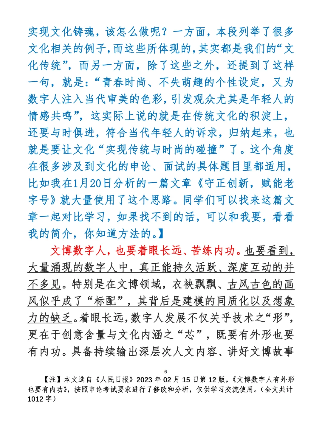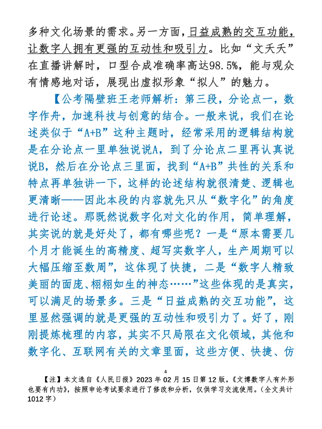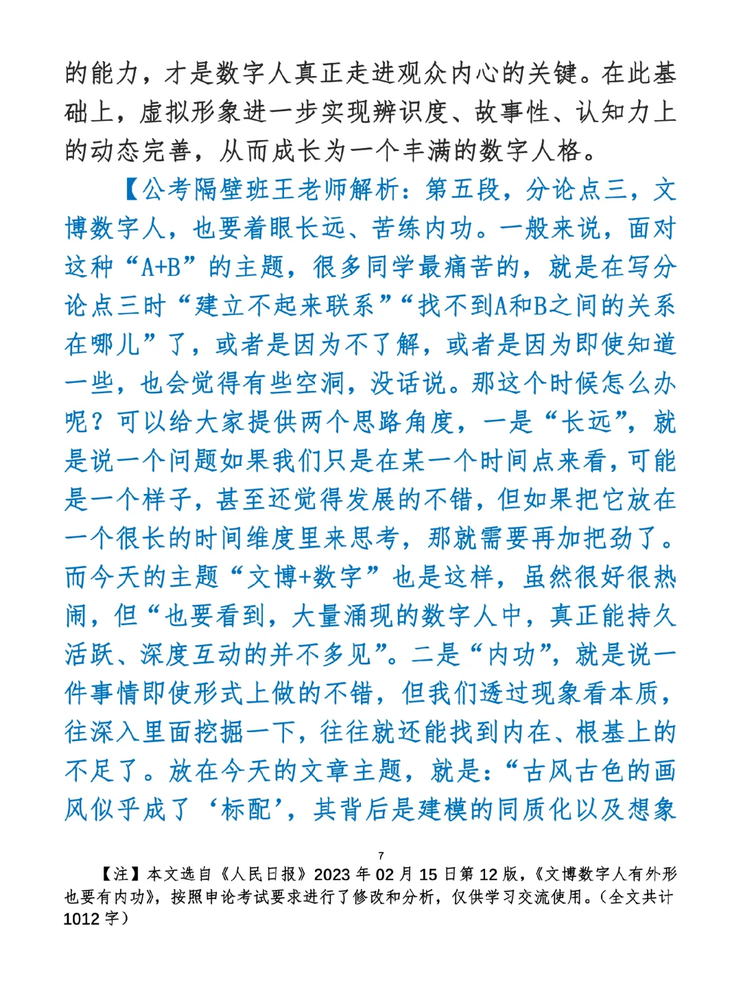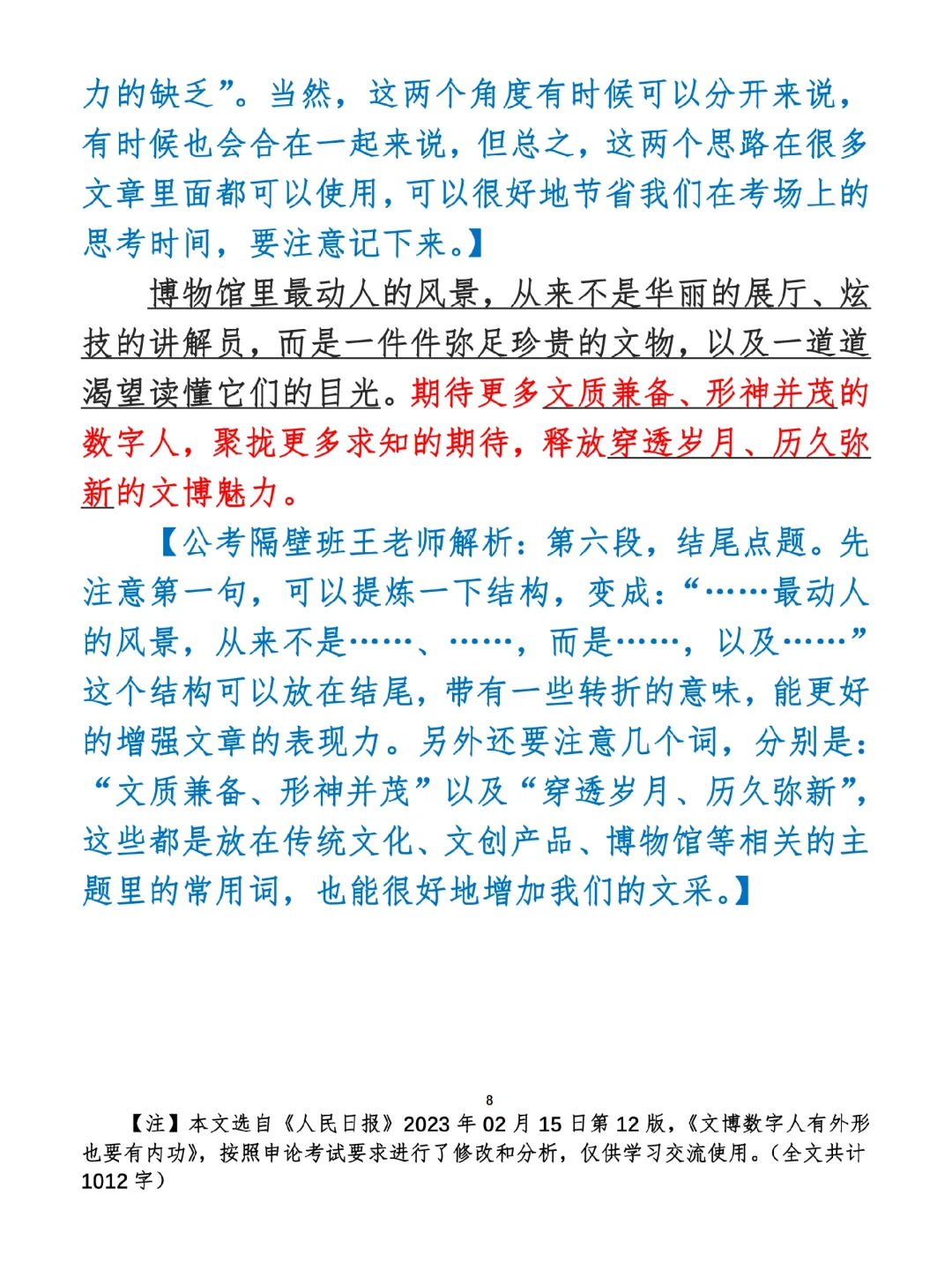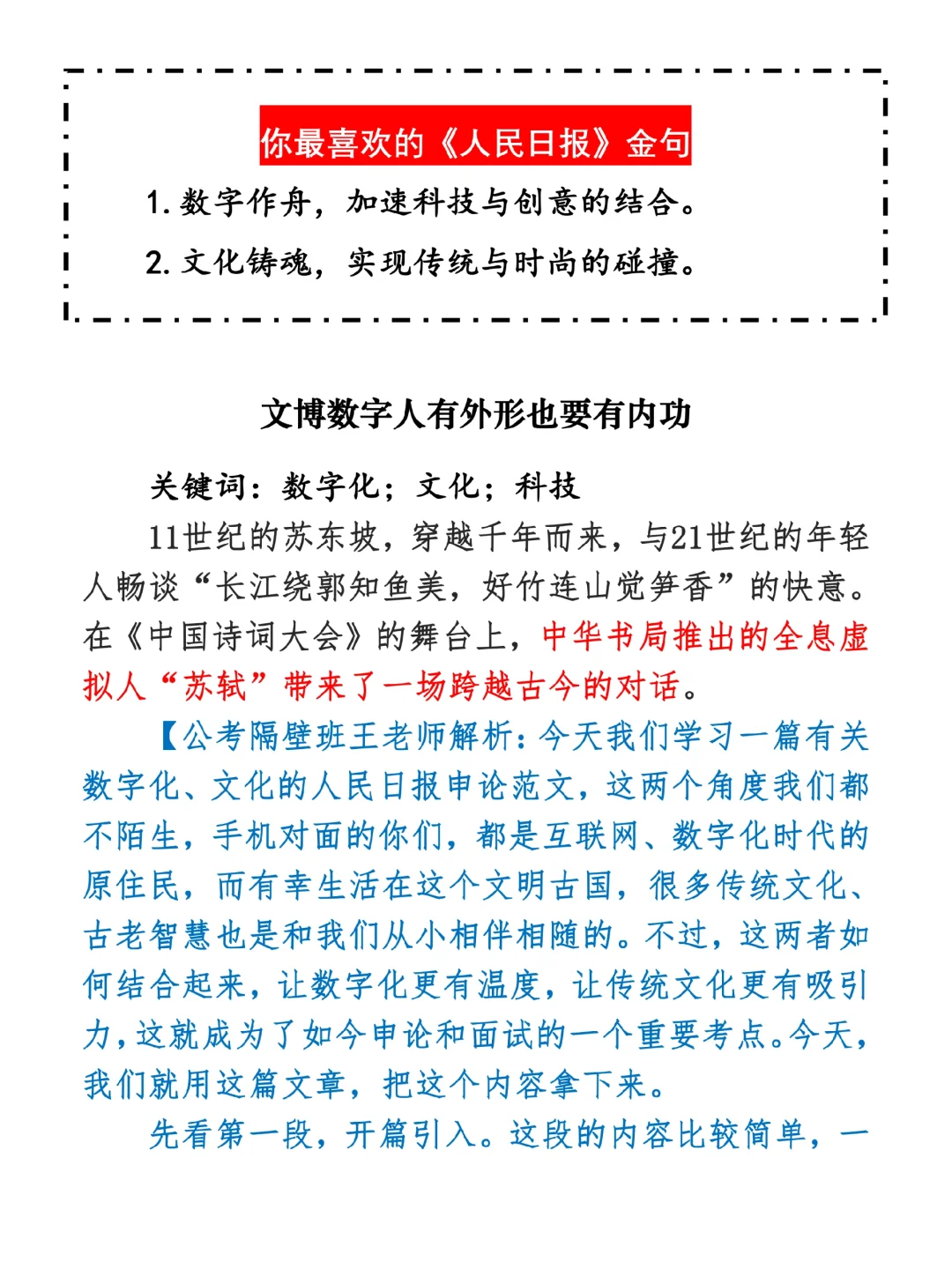 今日打卡作业: 1. 选一句你最喜欢的金句 2. 抄写全文红字+划线部分内容 3. 写完后在留言区打卡 ⭐️ ⭐️ ⭐️ ⭐️ ⭐️ ⭐️ 如何抄写:每天的抄写文章以图片形式发在“公考隔壁班王老师”账号,红色字是重点句和结构句,黑色字是正文,蓝色字是解析,大家抄写时不必抄蓝色字。建议先通读全文(包括蓝色解析部分),做到心中有数再开始抄写,效果会更好。 关于文章:抄写文章来源于人民日报,但每篇文章我都根据申论考试要求进行了修改,主要集中在四个方面:一是重写或修改开头、结尾;二是统一段首句句式结构;三是调整段落字数,使文章结构更均衡;四是简化复杂长难句,使之更具可模仿性。每篇文章修改幅度不同,无论修改多少,都是基于申论考试要求,毫无对人民日报文章品评之意。(此处致敬人民日报) 关于解析:我会在文章每段后面加一段蓝色字的解析,是我自己在抄写时的感悟,篇幅时间有限,不能面面俱到,但求重点突出。如果你有其他感悟,也希望能在评论里分享,我们相互学习、共同进步。 ⭐️ ⭐️ ⭐️ ⭐️ ⭐️ ⭐️ 这里是公考隔壁班王老师独创的“每天半小时・申论80分”抄写团,欢迎加入我们!