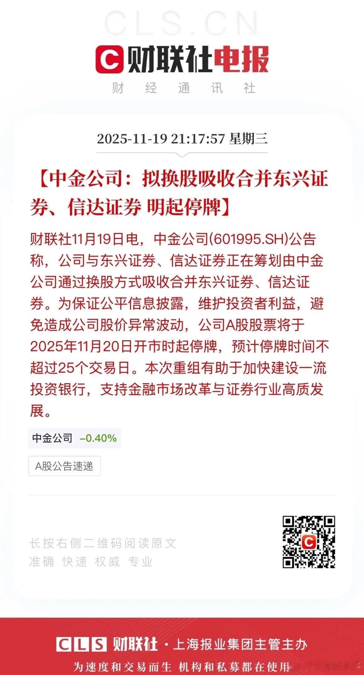 证券明天要暴涨?这么炸裂的消息,中金要合并东兴和信达,大鱼吃小鱼,小鱼吃虾米的节奏了建设金融强国的步伐一步都没停歇,三大证券合并为一家,真的炸裂的消息,明天开始停牌,预期停牌时间不超过25个交易日。