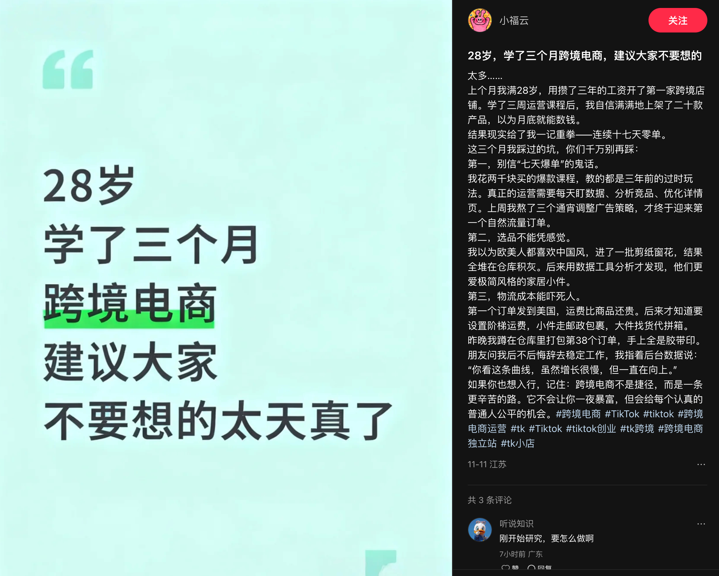 我不想上班,我就喜欢看你们上班~好像朋友都说跨境 tiktok 的海外平台有得赚朋友偷偷告诉我的,我偷偷告诉大家~希望大家出海卷国内已经卷到天花板了所有零售端的公司都得用力卷才能好过一点。但是话说回来。我的观点是:TikTok 店铺的入局门槛远比想象中高。网上到处都是 TikTok 跨境电商轻松月入过万的消息,可真当自己上手,才知道这水有多深。想做 TikTok 跨境电商的,大多是失业或打算转行的朋友,手头本就不宽裕,有几个人能烧得起钱去投流,又有多少人真正懂投流技巧?个体朋友很难烧的起这个资本。做跨境不一定赚钱的,但教人做跨境很赚钱,喊你来做跨进也能赚点