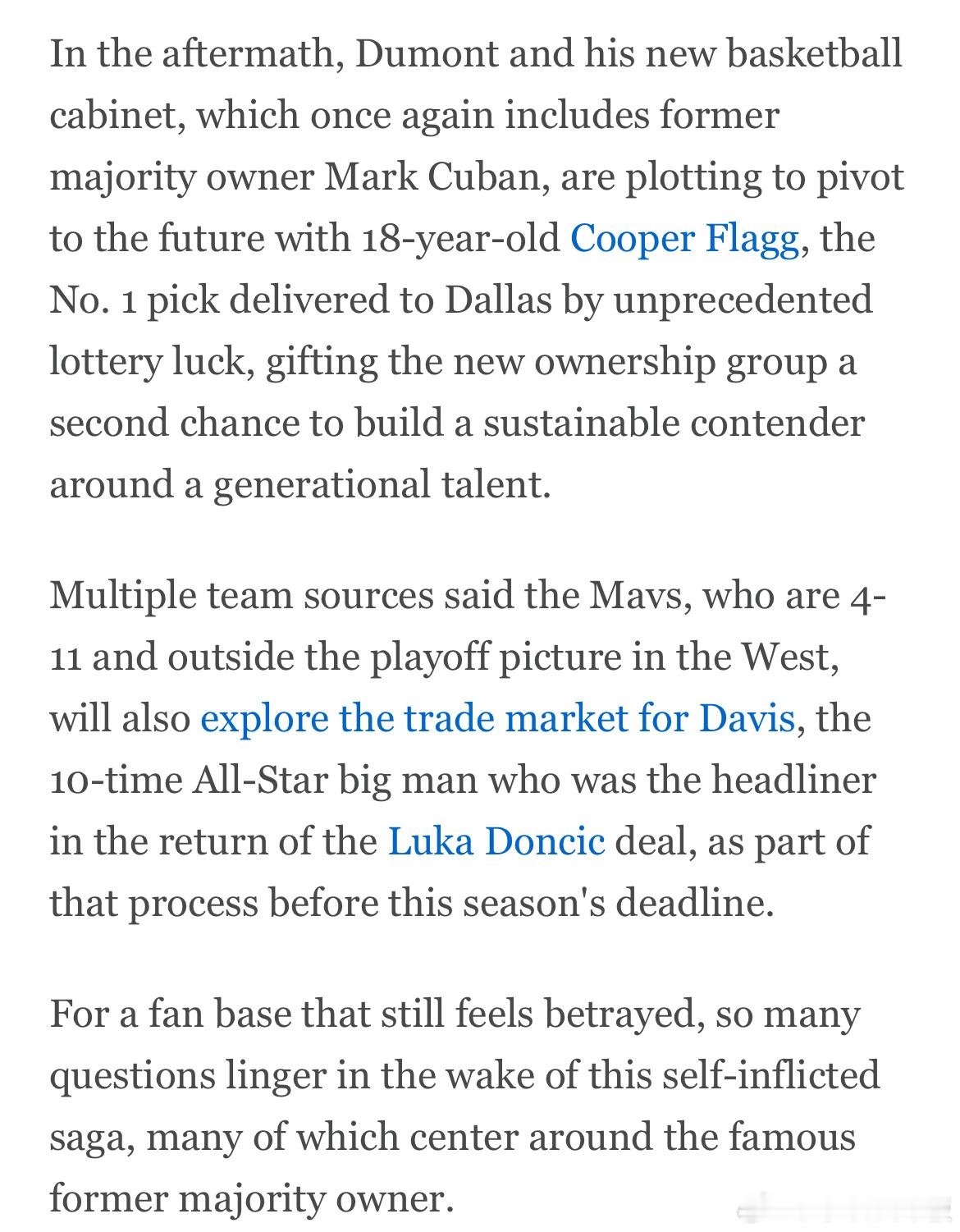 Tim MacMahon:消息人士透露,独行侠将在交易截止日前探索安东尼-戴维斯的交易市场。