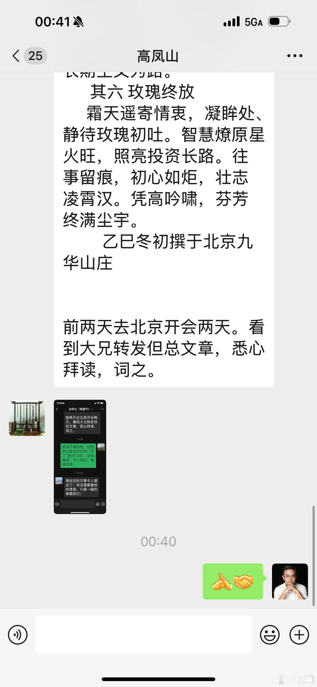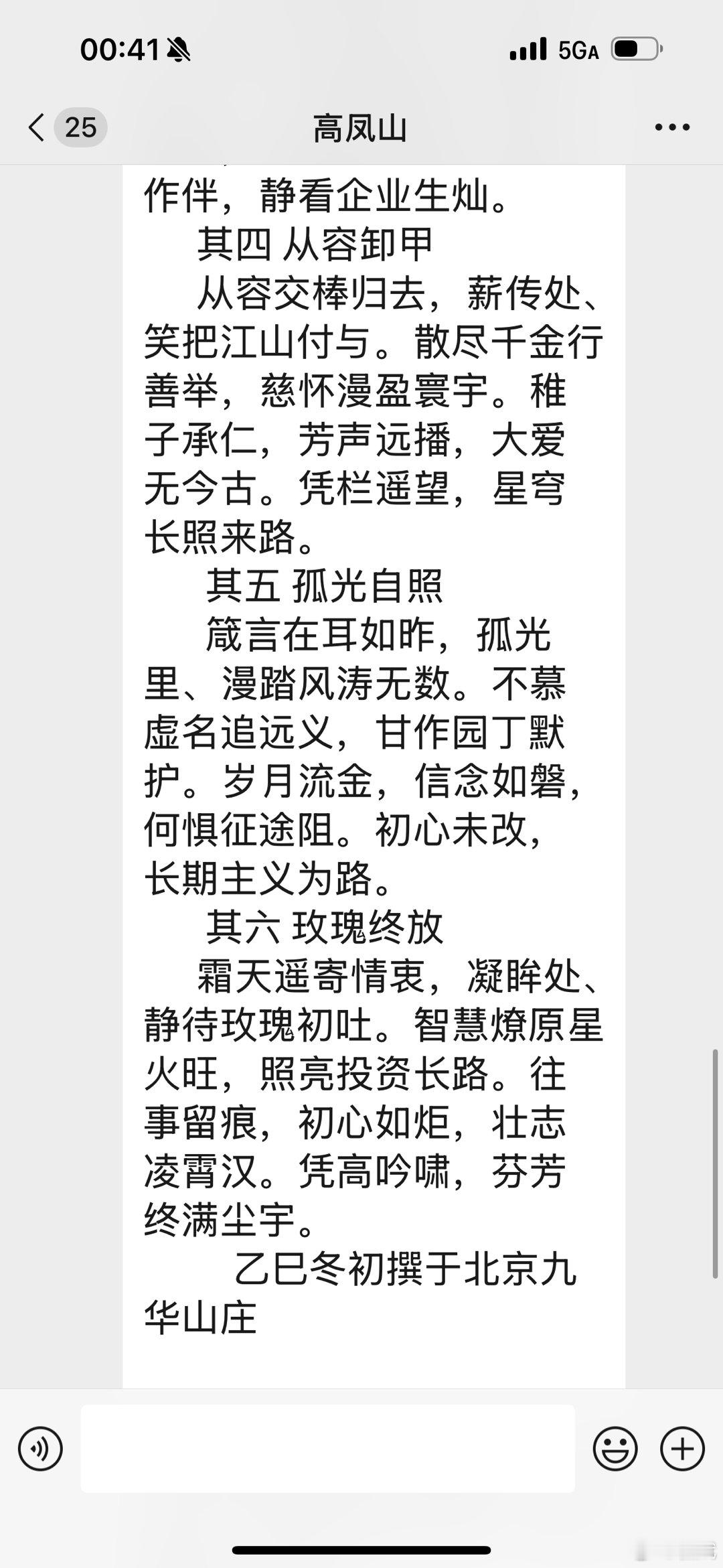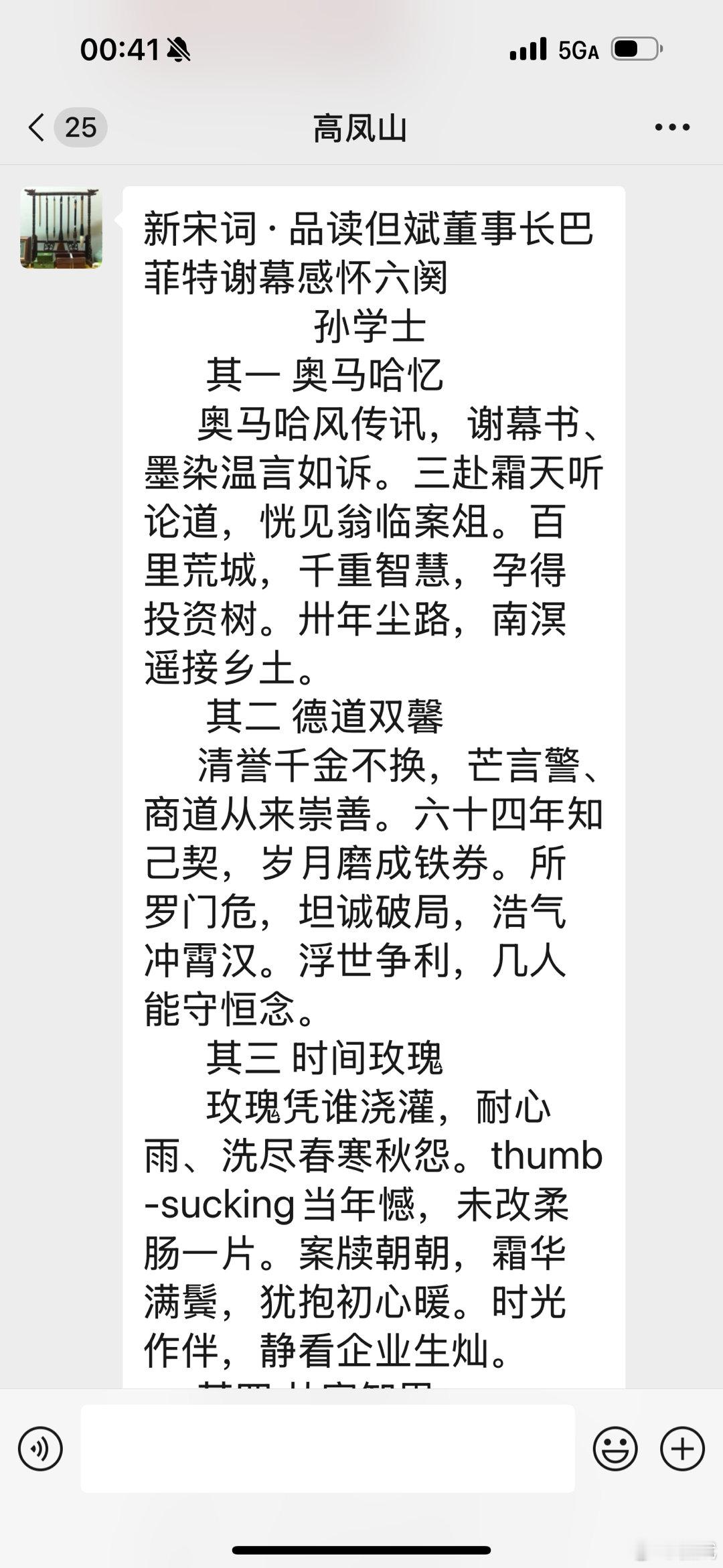 刚收到恩师高凤山老师的微信,感谢韩爱平先生!新宋词·品读但斌董事长巴菲特谢幕感怀六阕 孙学士 其一 奥马哈忆 奥马哈风传讯,谢幕书、墨染温言如诉。三赴霜天听论道,恍见翁临案俎。百里荒城,千重智慧,孕得投资树。卅年尘路,南溟遥接乡土。 其二 德道双馨 清誉千金不换,芒言警、商道从来崇善。六十四年知己契,岁月磨成铁券。所罗门危,坦诚破局,浩气冲霄汉。浮世争利,几人能守恒念。 其三 时间玫瑰 玫瑰凭谁浇灌,耐心雨、洗尽春寒秋怨。thumb-sucking当年憾,未改柔肠一片。案牍朝朝,霜华满鬓,犹抱初心暖。时光作伴,静看企业生灿。 其四 从容卸甲 从容交棒归去,薪传处、笑把江山付与。散尽千金行善举,慈怀漫盈寰宇。稚子承仁,芳声远播,大爱无今古。凭栏遥望,星穹长照来路。 其五 孤光自照 箴言在耳如昨,孤光里、漫踏风涛无数。不慕虚名追远义,甘作园丁默护。岁月流金,信念如磐,何惧征途阻。初心未改,长期主义为路。 其六 玫瑰终放 霜天遥寄情衷,凝眸处、静待玫瑰初吐。智慧燎原星火旺,照亮投资长路。往事留痕,初心如炬,壮志凌霄汉。凭高吟啸,芬芳终满尘宇。 乙巳冬初撰于北京九华山庄前两天去北京开会两天。看到大兄转发但总文章,悉心拜读,词之。