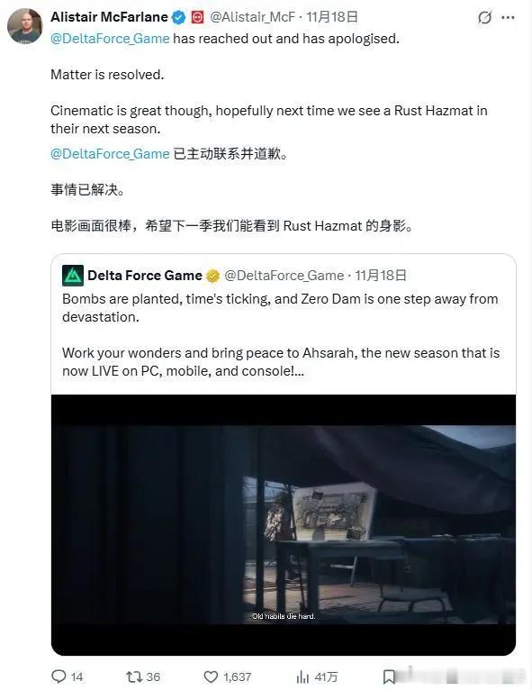 《三角洲行动》的天美工作室新赛季宣传片疑似抄袭Facepunch工作室作品《腐蚀》中的C4炸药的3D模型游戏素材。事件舆论曝光后,天美发布道歉声明。