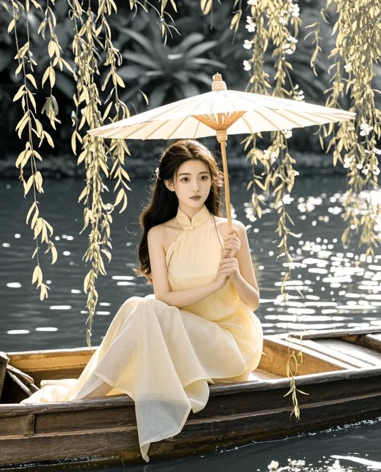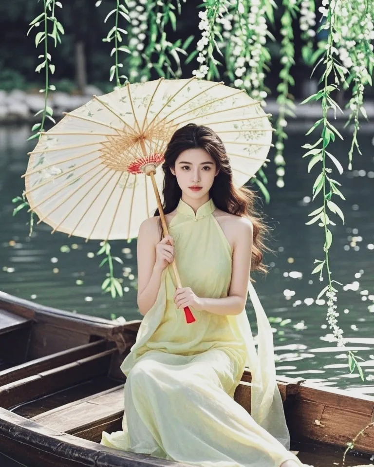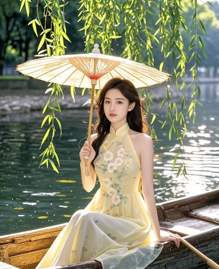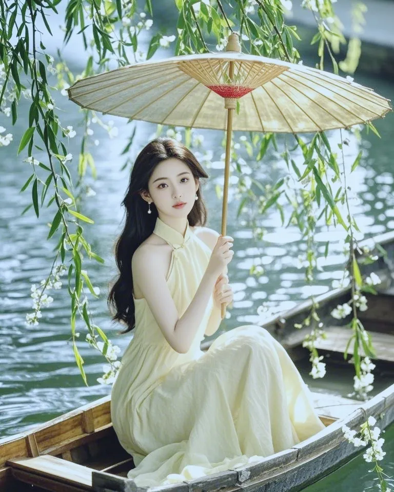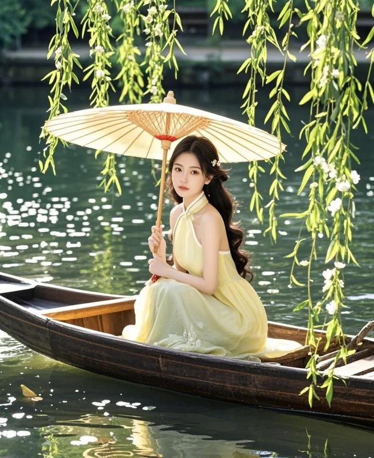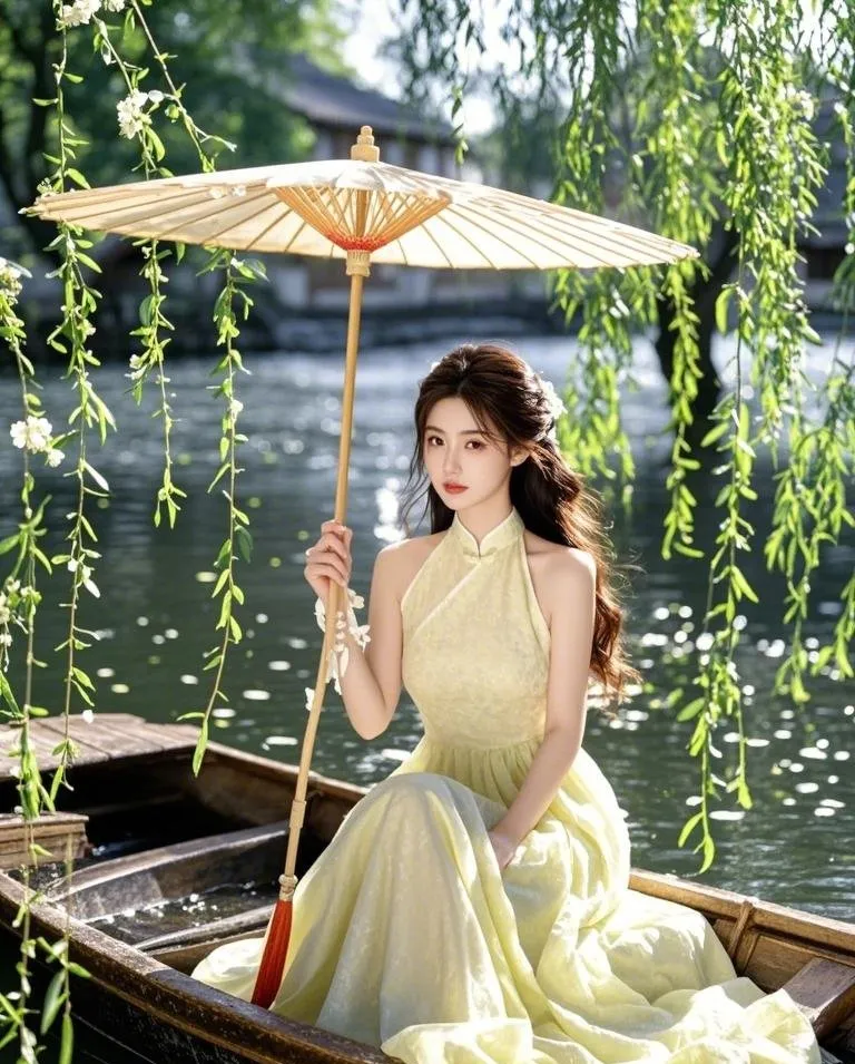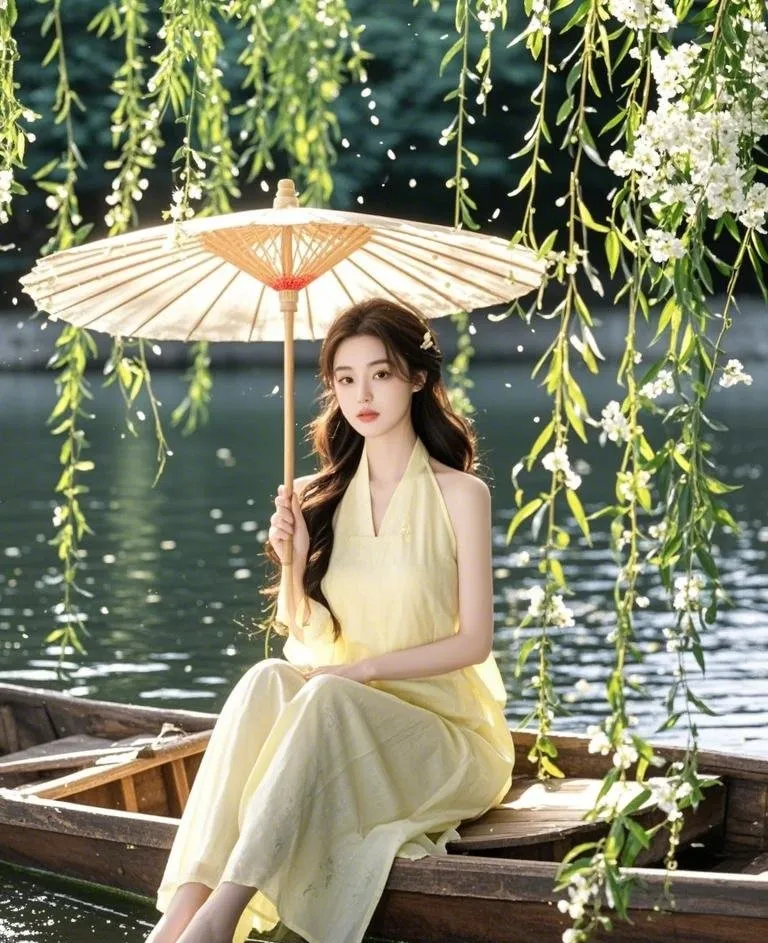 美女穿着鹅黄色新中式挂脖长裙,微卷长发,坐在小船上在河上行驶,撑着油纸伞,河岸边有柳树,柳叶纷飞,小白花, 国风,复古年代美婕客照分享 森林仙境少女 来一组写真大片 甜美的模板 写真精选展示