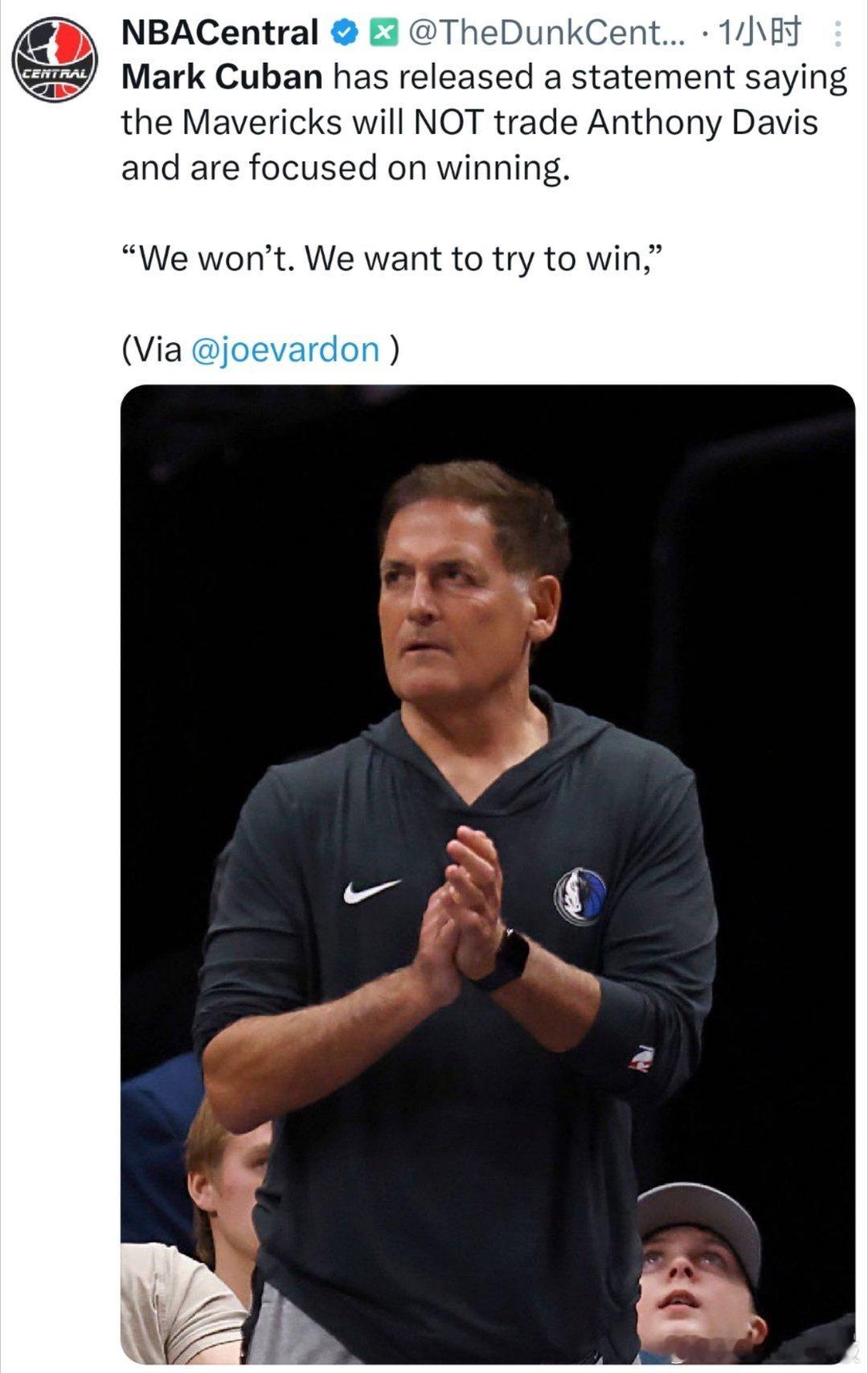 Joe Vardon: 马克-库班明确表示,球队不会交易浓眉,他们将专注于赢球!在哈里森被解雇之后,库班已重新回到独行侠并参与领导层决策
