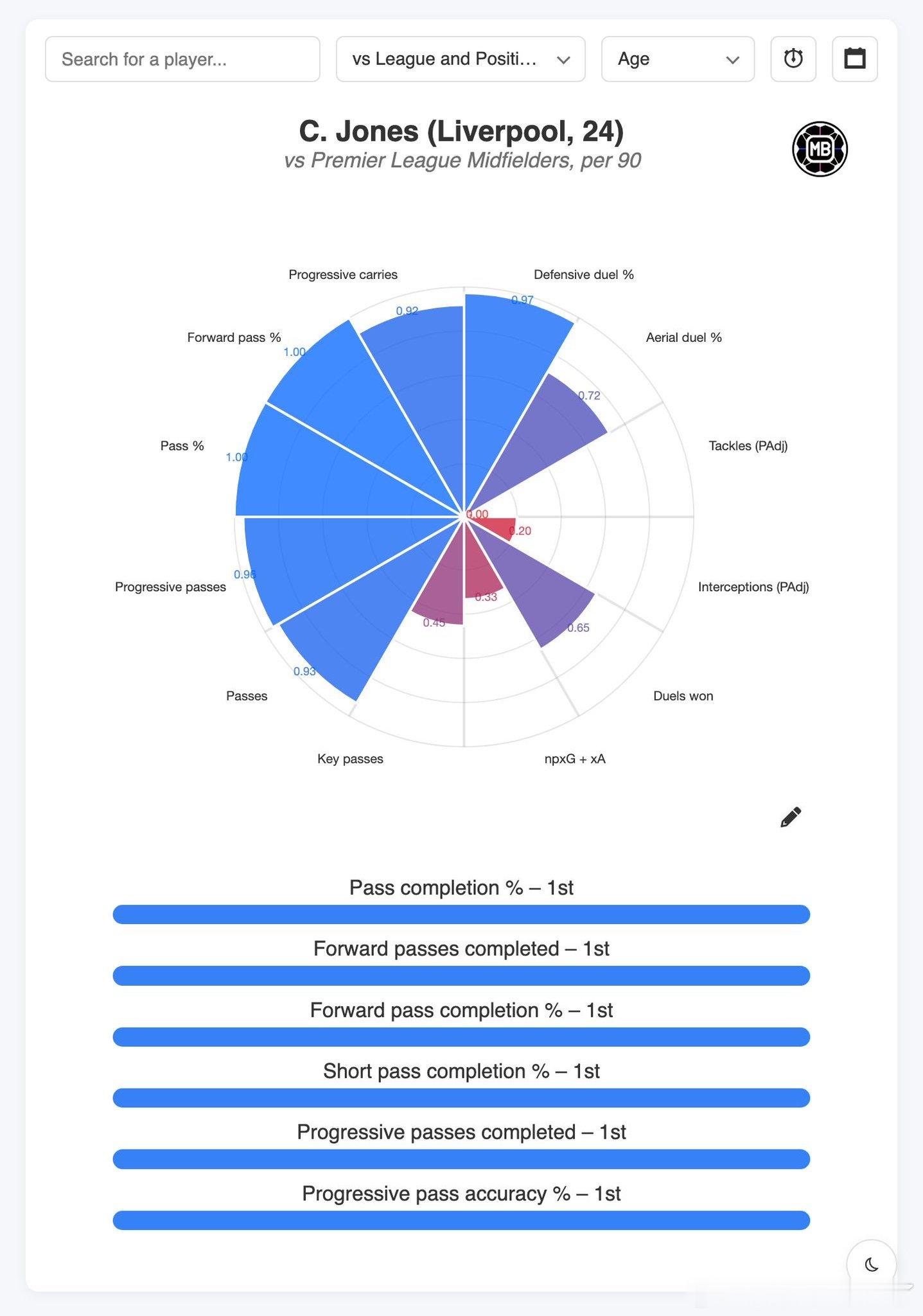 利物浦隐藏的数据之王?琼斯 vs 英超中场球员(每90分钟数据)🥇 传球成功率——第1🥇 成功向前传球次数——第1🥇 向前传球成功率——第1🥇 短传成功率——第1🥇 成功推进性传球次数——第1🥇 推进性传球准确率——第1🥇 成功传入进攻三区传球——第1🥇 向前进攻动作——第1