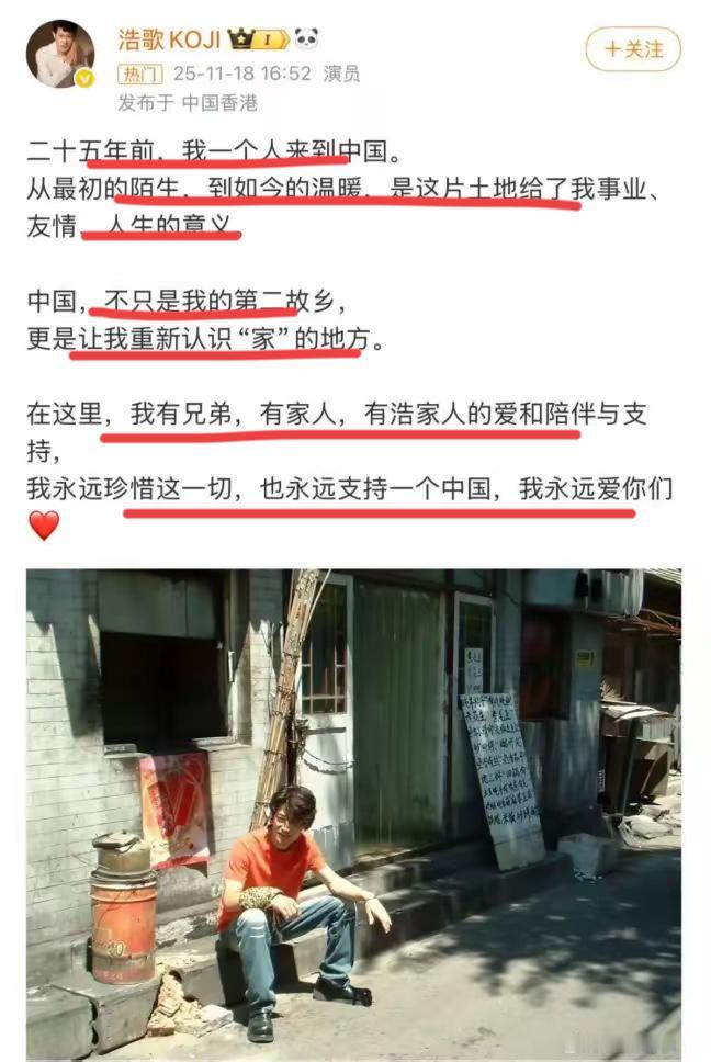 矢野浩二发文:中国不仅仅是第二故乡,她是我的家!25年前只身一人来到中国,这里是他事业起步的地方,他说,从陌生到温暖,他在这里实现了人生的理想,获得了友情,悟道了人生的意义! 他在这里有兄弟,友情,爱情,事业,他们都很支持他,爱护他! 他宣布,永远支持一个中国,永远珍惜这一切,永远爱你们!! 我看到有人赞同,也有人说,小心这样的表白,小心任何小日子!你觉得,他还算是小日子么,25年这么长时间,难道不会被我们的文化感化,同化么??你有何看法呢?