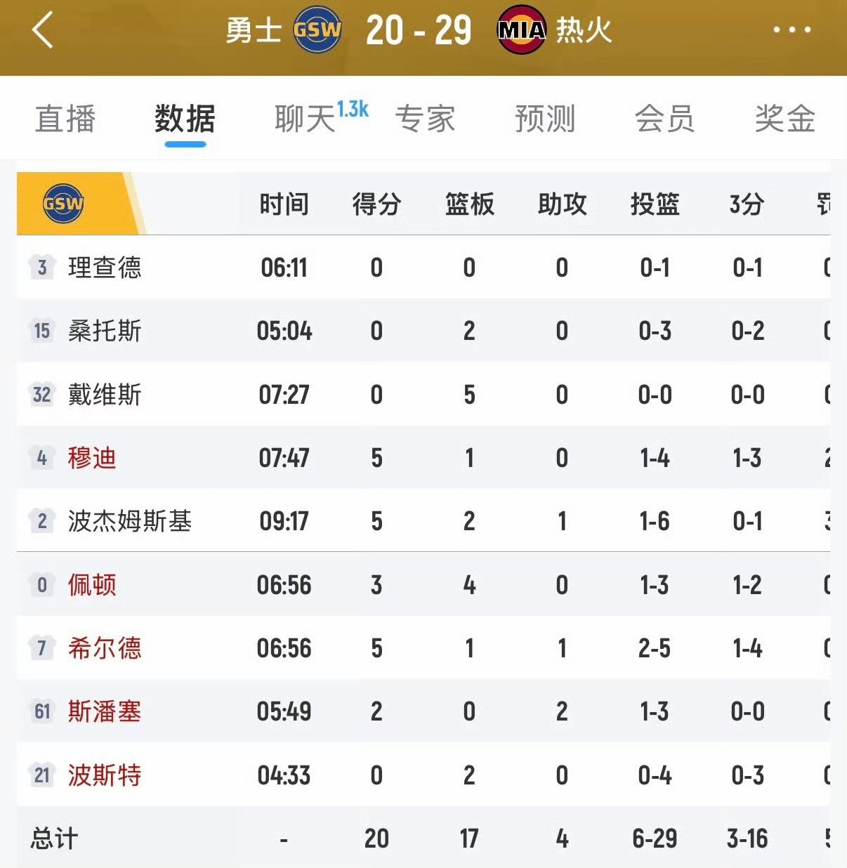 勇士这背靠背赛程直接难度拉满,17场比赛,5场背靠背,战绩领跑联盟,排名第二的球队仅有3场,这是给勇士老头团上难度。 库里巴特勒直接轮休。勇士阵容奇葩,首发有3个二轮秀。前7分钟都没有运动战得分。 首节勇士20-29落后热火,现在都好起来了,比分慢慢在缩小。