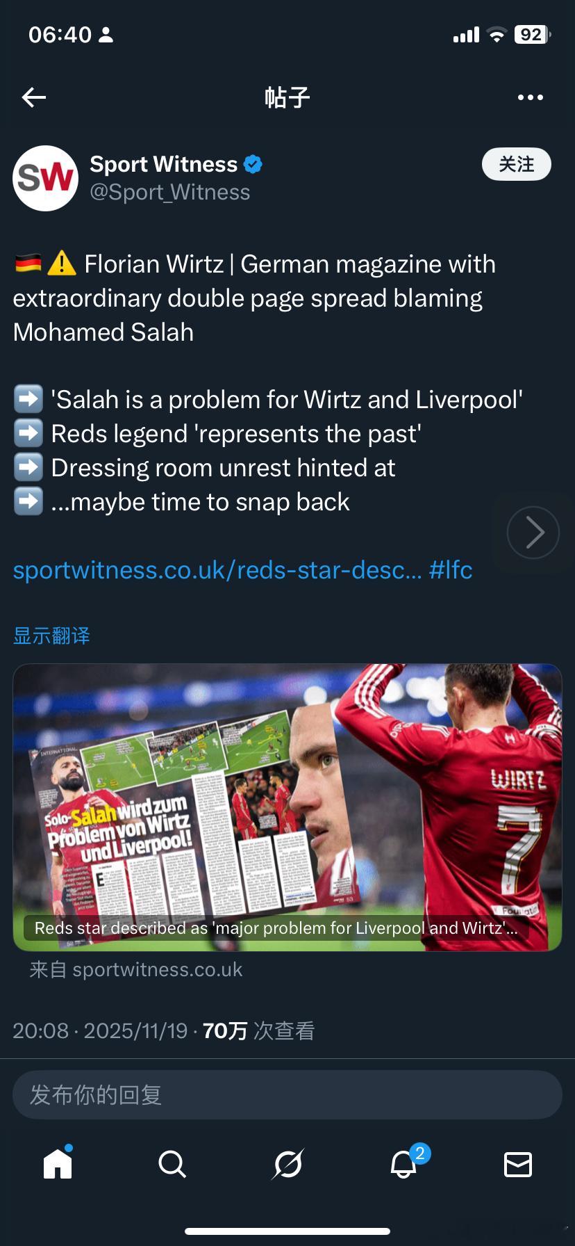 德国媒体开始挑拨维尔茨和萨拉赫关系德国杂志以惊人双版报道矛头直指萨拉赫和维尔茨关系➡️ 毒舌标题:"萨拉赫已成维尔茨与利物浦的绊脚石"萨拉赫正"日益成为利物浦与维尔茨之间的严重问题"。"值得注意的是,他完全冷落了维尔茨,也未能激活其他夏窗新援——这些总价接近五亿欧元的引援集体黯淡无光。萨拉赫本赛季送出三次助攻且全部转化为进球,但受益者均是效力球队更久的旧将。"➡️ 萨拉赫被讽"代表过去式"➡️ 隐晦暗示更衣室暗流涌动➡️ ...或许该是时候迎头痛击