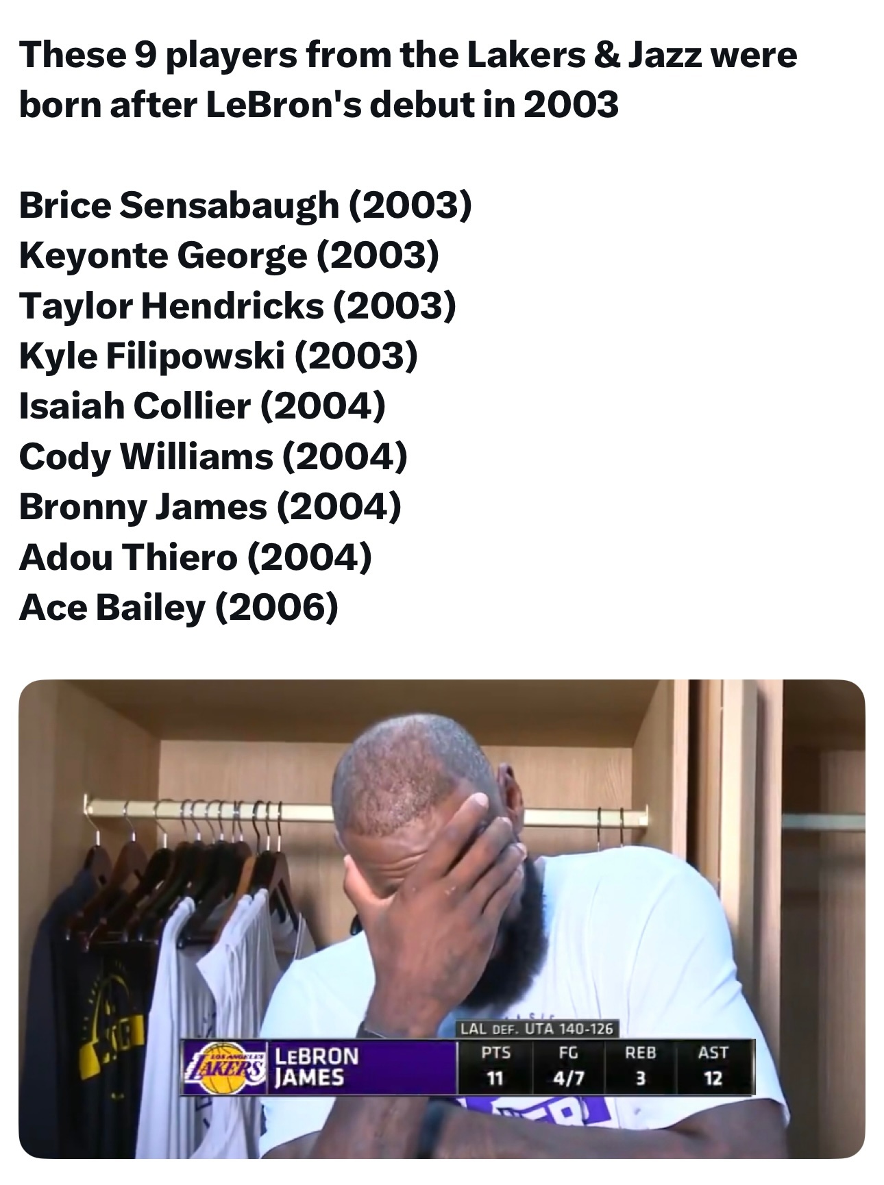 昨天爵士和湖人的比赛中有9名球员的出生日期在詹姆斯生涯首战之后……爵士:森萨鲍、乔治、亨德里克斯、菲利波夫斯基、科利尔、科迪威廉姆斯、贝利湖人:布朗尼、蒂耶罗