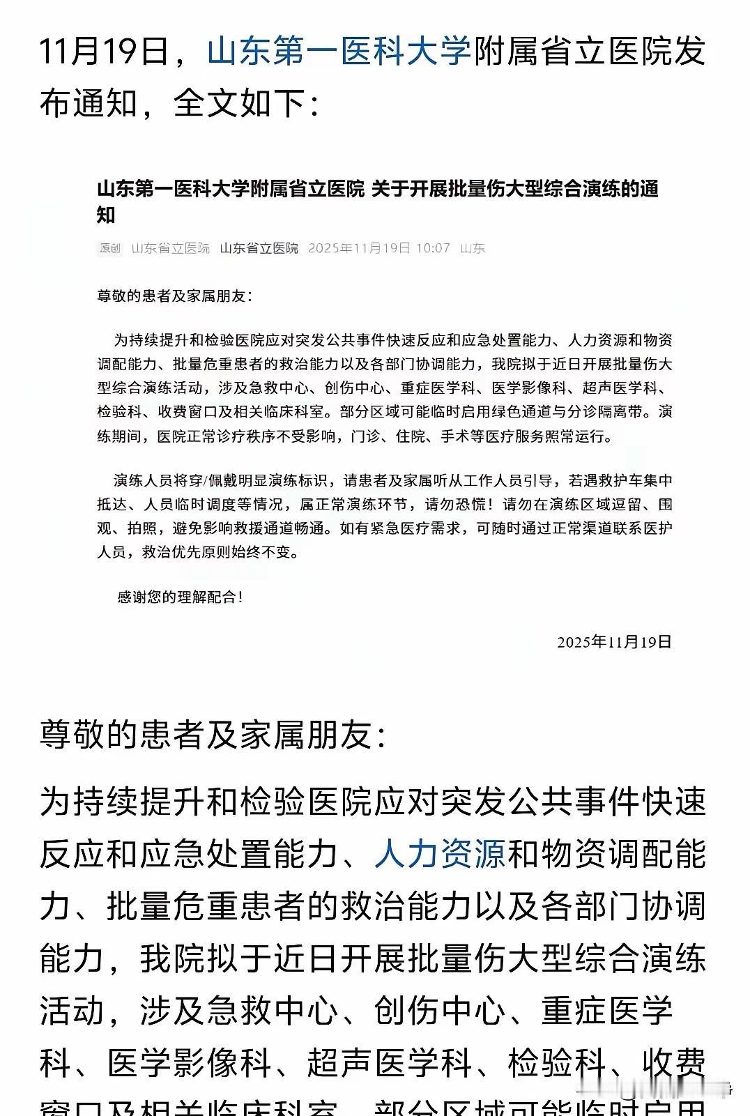 火药味已经越来越浓了,现在不光是黄海和东海进行军事演习。 就连山东省都开始进行野战急救演练。 山东省第一医科大学附属省医院。 下达了一份通告。 11月19号全院开始进行大型批量伤综合研。 听听朋友们听听什么叫做批量伤啊。 干什么事情会批量的受伤呢? 除了战争之外,有什么事情会出现批量受伤的情况呢? 所以说国家上上下下已经开始在进行各种战争前的准备。 既然日本人头铁,那咱们这次就打一打铁。 只要把脚盆鸡干躺下了。 那么台湾不用打自然也就回归了。 是上上之策! 下一步应该就是日本海进行军事演习。 再下一步应该是日本列岛的东侧太平洋地区进行实弹军事演习。 后期咱们可以进行封闭商路军事演习。 就在公海上扣你们的船。 我倒是要看看你会不会先开第1枪。
