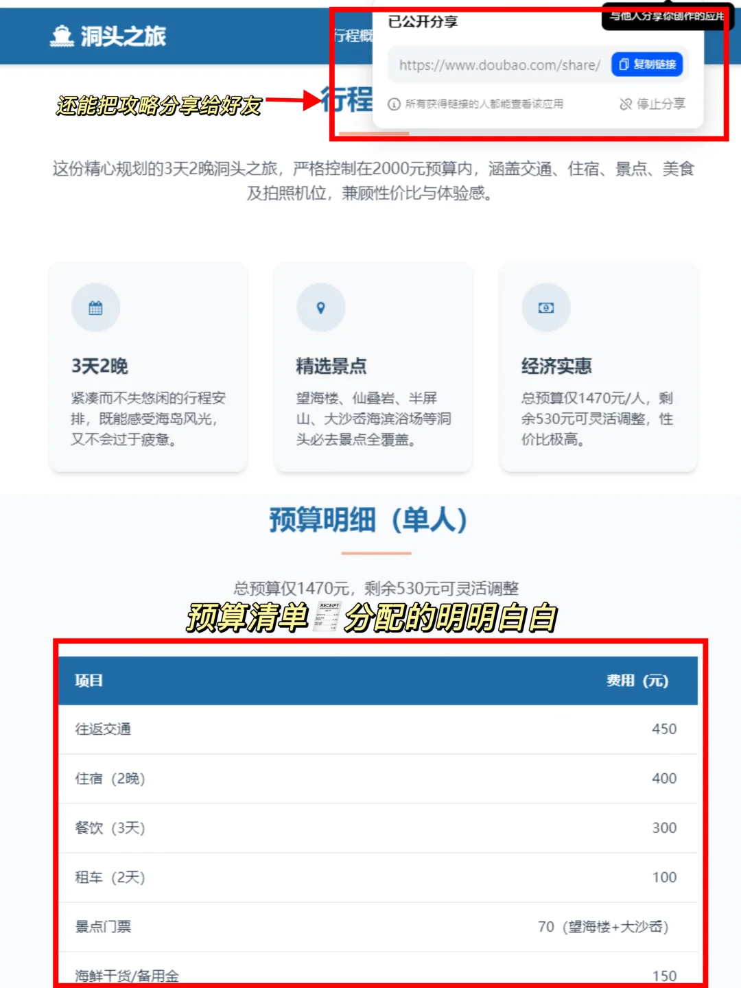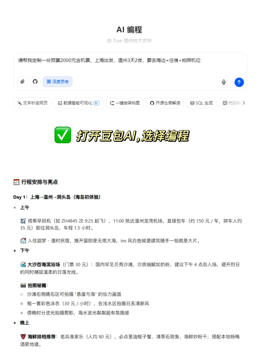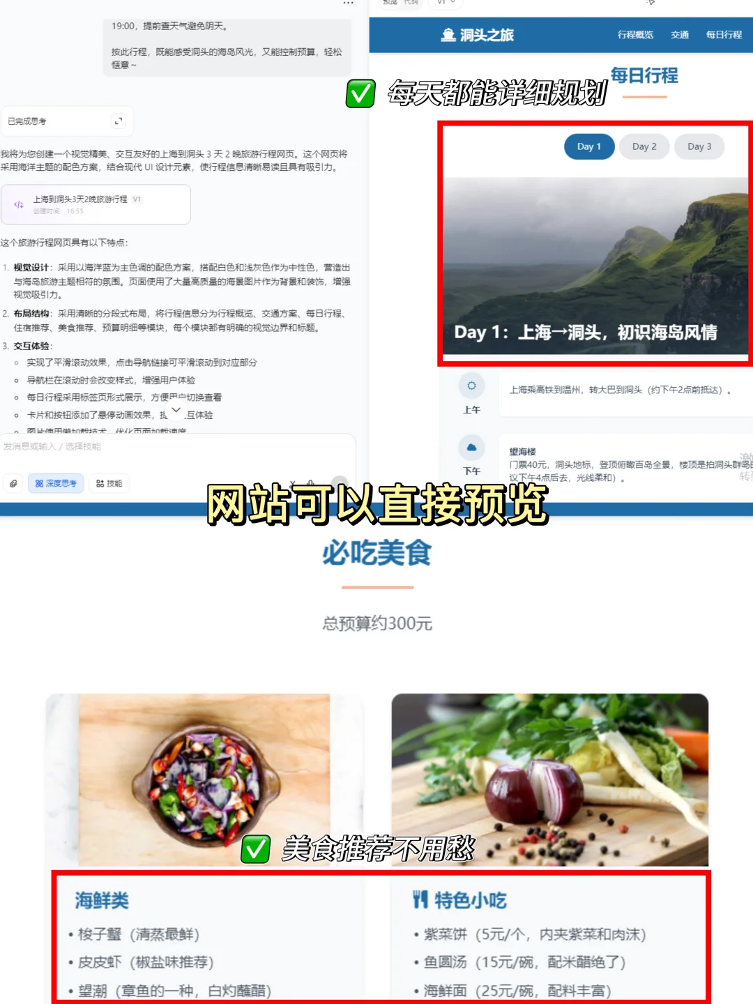 帮我生成洞头3日游 景点可视化,他就会给你Ai出上午和下午要去的景点,这时候你只要搭配好衣服去拍照打卡,懒人必备哈!