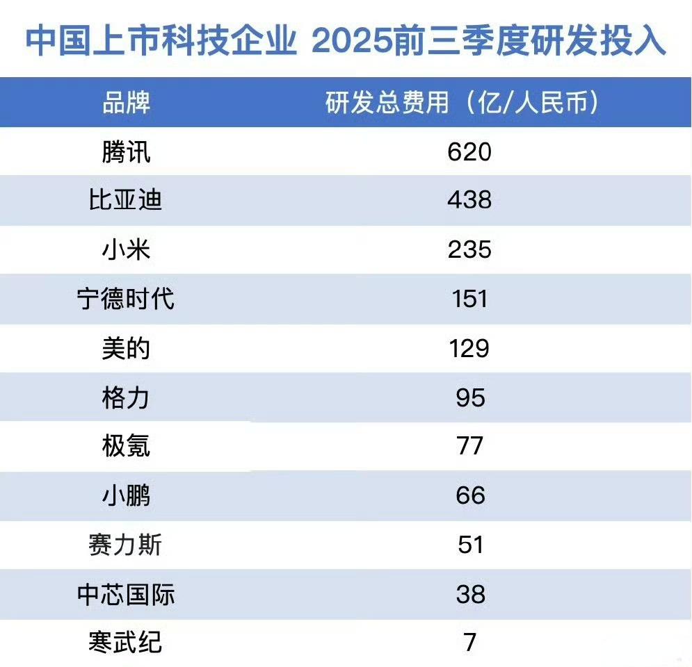 上市科技企业,小米的研发投入排第三! 在中国上市科技企业中仅次于腾讯和比亚迪,为什么没有华为,因为华为没有上市。 同样的这份榜单也不含有传统企业, 比如说中国移动、中国石油等巨头。如果放眼到全国来看,其实超过10亿研发经费企业还是非常多的,很多企业的研发经费都非常的充裕,这是因为企业的规模到了一定程度之后,必须迫使自己提高研发。 各位是怎么看的?欢迎评论区留言。
