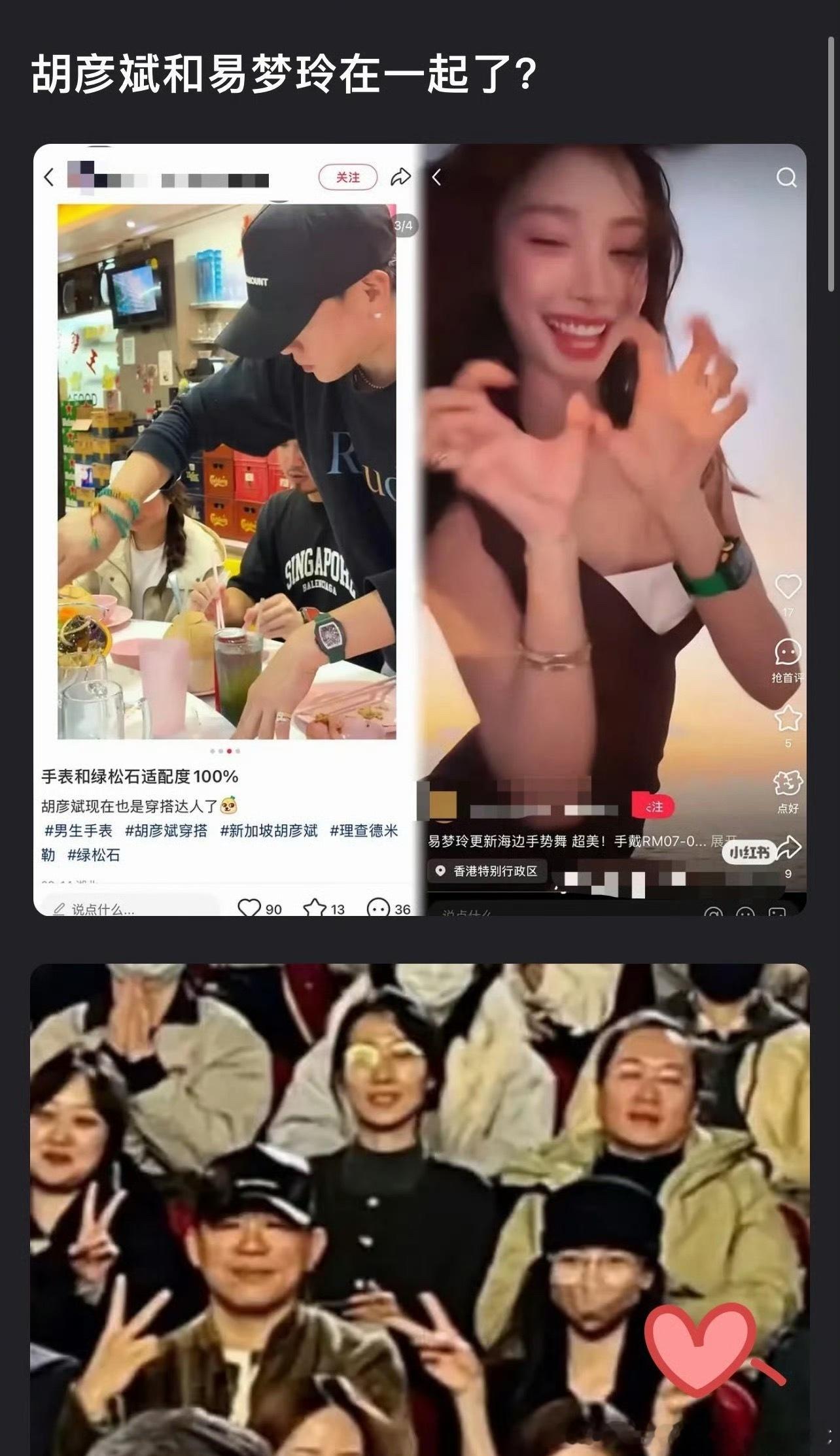 胡彦斌易梦玲目前被拍到的同框记录有: 9.1 两人共同出现在郝蕾的训练营10.22 网友在易梦玲话剧《诛》现场偶遇胡彦斌11.14 胡彦斌去支持张一山话剧《一地鸡毛》,被网友扒出坐在旁边的黑色帽子美女是易梦玲。还有现在的马尔代夫接吻照