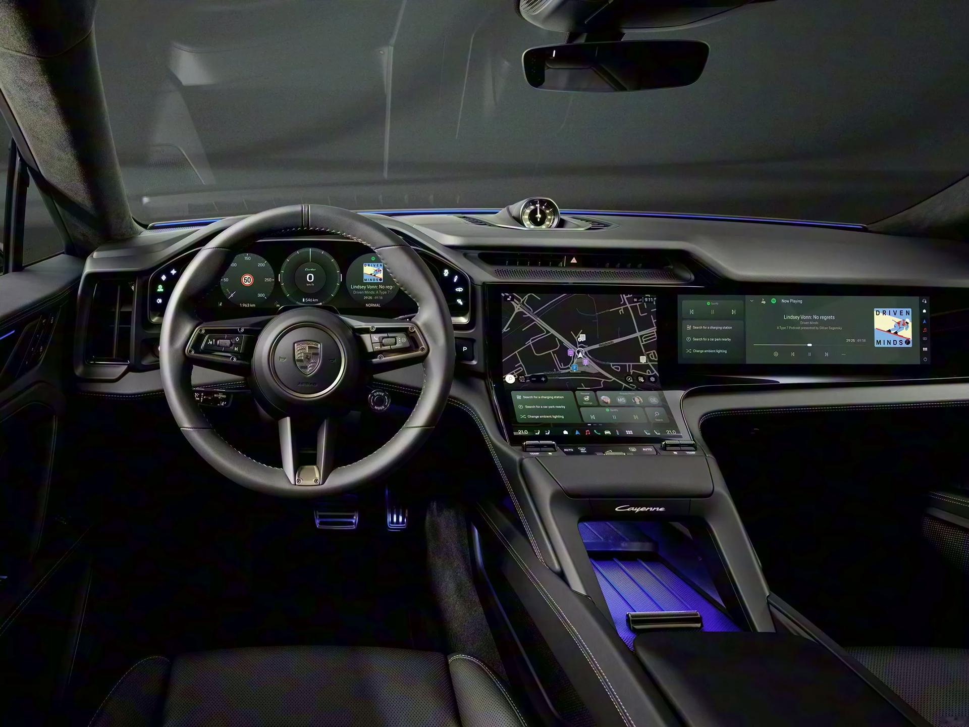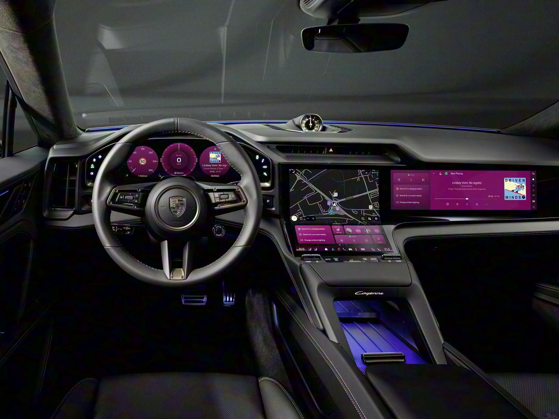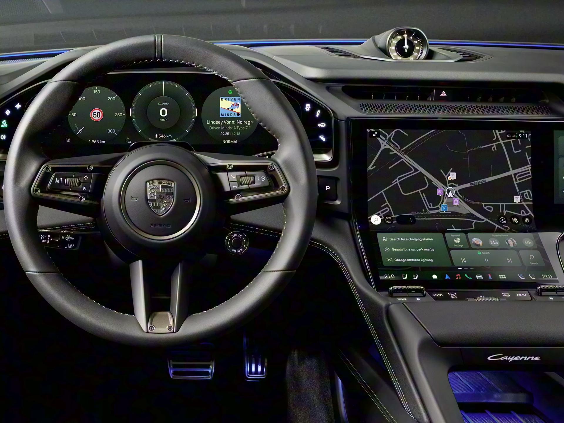 基于PPE平台,全新保时捷Cayenne Electric保时捷卡宴纯电动,标配800V平台、前后双电机四驱以及113kWh(净容量108kWh)电池组。此次公布了Electric与Turbo Electric两个规格版本,新车将于2026年夏末开启交付。值得一提的是,新车将与第三代Cayenne同堂销售。外观采用了保时捷最新的设计语言,封闭式前脸设计,前大灯组采用了不规则形状,与Taycan有着异曲同工之处。车身侧面来看,新车整体造型让新车看上去更加动感。车身尺寸方面,新车长宽高分别为4985/1980/1674毫米,轴距为3023毫米,相比现款燃油版车型增加了130毫米。新车后包围两侧拥有两个半隐藏式的可伸缩导流板,可以在相应的时速下减小车身阻力。内饰配备了14.25英寸OLED全数字仪表盘以及带有驾驶模式选择按键的三辐式多功能运动方向盘,并可选配87英寸的增强现实(AR)抬头显示系统;中控台配备名为“Flow Display”流动显示屏的12.25英寸触控屏幕,该屏幕将拥有一定的弯折角度;此外,新车还可以选装14.9英寸的副驾娱乐屏,整体布局构成了全新研发的保时捷驾驶体验系统(Porsche Driver Experience)。动力推出Electric与Turbo Electric两个版本:其中Electric配备前后双电机,最大功率408马力,弹射模式有10秒时间最大功率增至442马力,0-100m/h加速时间为4.8秒,最高时速230km/h。Turbo Electric版本的双电机标准综合功率为857马力,启动弹射模式后最大功率增至1156马力,最大扭矩可达1500牛·米,0-100km/h加速时间仅为2.5秒,四分之一英里加速时间仅为9.9秒;该车型还配备了“瞬时加速”(Push-to-Pass)功能,可以额外激活176马力的功率,也是10秒钟,可用于日常超车、提速等操作。此外,Turbo版本还搭载了源自赛车领域的后桥电机“直接油冷”技术,可以确保持续的高输出功率与效率。底盘方面,新车配备了双腔双阀空气悬架、后轮扭矩矢量控制系统和后桥限滑差速器,同时还标配后轮转向系统。