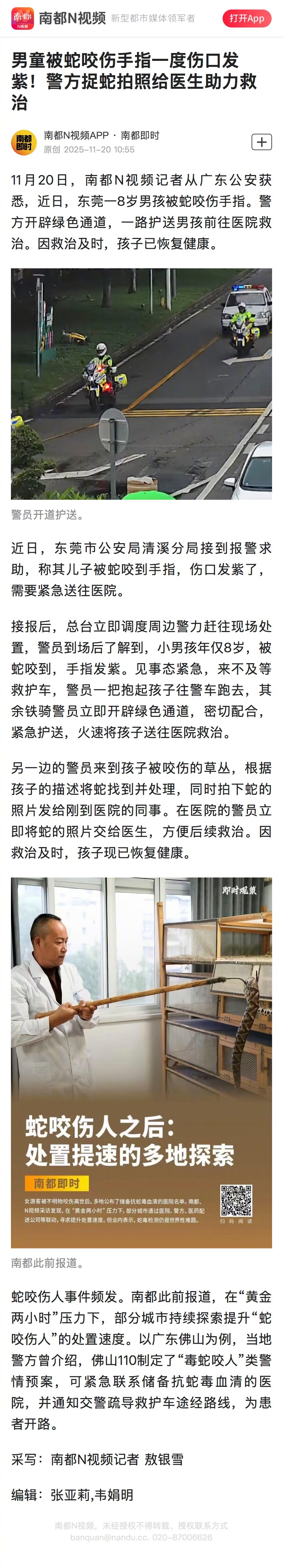 【男童被蛇咬伤手指一度伤口发紫!警方捉蛇拍照给医生助力救治】近日,东莞市公安局清溪分局接到报警求助,称其儿子被蛇咬到手指,伤口发紫了,需要紧急送往医院。接报后,总台立即调度周边警力赶往现场处置,警员到场后了解到,小男孩年仅8岁,被蛇咬到,手指发紫。见事态紧急,来不及等救护车,警员一把抱起孩子往警车跑去,其余铁骑警员立即开辟绿色通道,密切配合,紧急护送,火速将孩子送往医院救治。另一边的警员来到孩子被咬伤的草丛,根据孩子的描述将蛇找到并处理,同时拍下蛇的照片发给刚到医院的同事。在医院的警员立即将蛇的照片交给医生,方便后续救治。因救治及时,孩子现已恢复健康。南都N视频记者 敖银雪