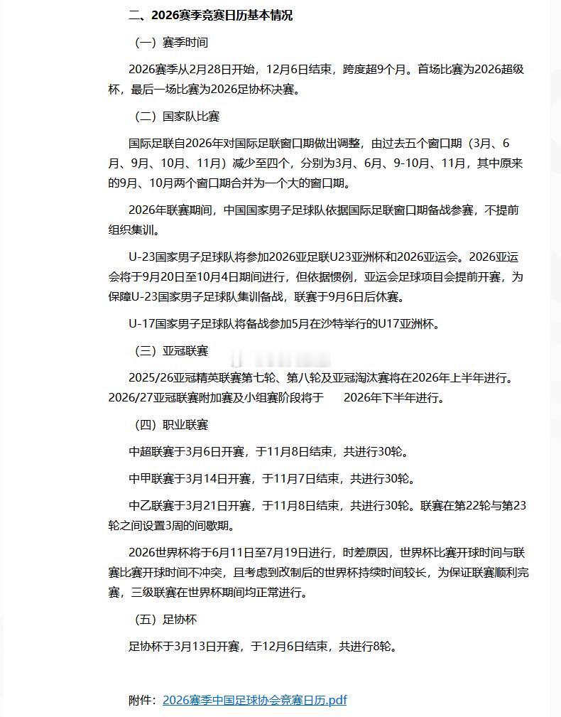 中国足协公布了2026的赛历。和津门虎相关的:2026中超联赛于3月6日开赛,于11月8日结束。2026足协杯于3月13日开赛,于12月6日结束,共进行8轮。世界杯期间,联赛正常进行。