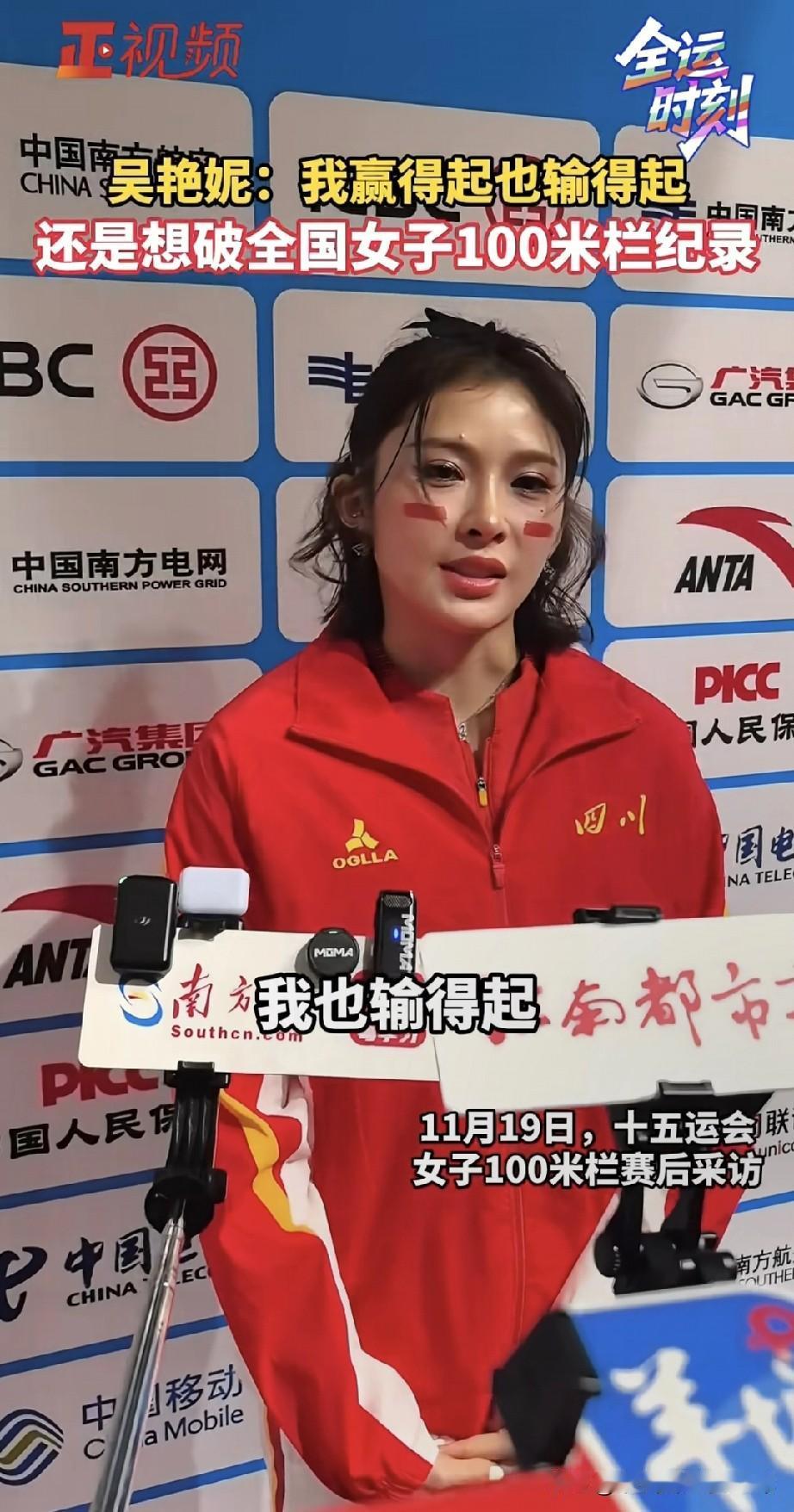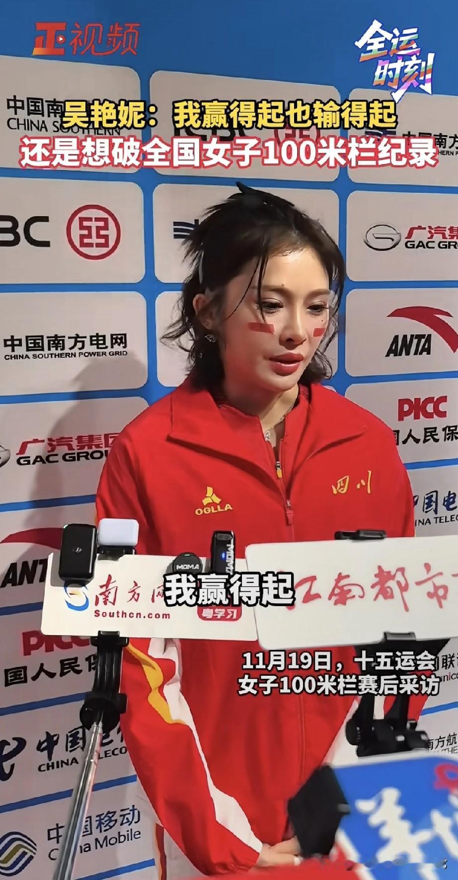 吴艳妮拿亚军红着眼眶喊永不放弃! 我赢得起也输得起 混采区的她攥着衣角,头发还沾着汗——刚拿了女子100米栏亚军,红着眼眶说“我不会因为第二就放弃破纪录的梦”。 有人刷“这才是体育精神,输了也顶天立地”,也有人呛“没拿金牌的热血是自我感动”。 你看她咬着牙说“要拼尽努力”的样子——是真的不服输,还是演给镜头看的人设? 现在吵翻了:“敢喊梦就是英雄”VS“没成绩的坚持是矫情”——你说,运动员输了比赛后的“热血发言”,到底是真性情还是流量密码?