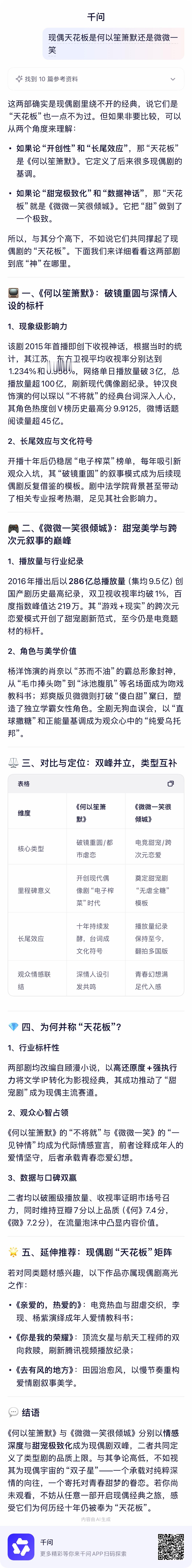关于问题现偶电视剧天花板是《何以笙箫默》还是《微微一笑很倾城》?以下文字版是ChatGPT给出的答案,图片是阿里千问给出的答案。如果从“现偶影响力+受众规模+投射出的时代情绪”这三项综合来看,《何以笙箫默》和《微微一笑很倾城》都能被称作现偶天花板,但两者代表的是两种完全不同的巅峰模式:⸻🌙 《何以笙箫默》:偏情绪向的天花板关键词:纯虐感、青春遗憾、都市纯爱情绪浓度极高。 • 2015年的现偶审美更喜欢“虐、深情、执念”这一套,《何以》正好踩中时代情绪。 • 钟汉良 & 唐嫣的角色氛围感极强,人物之间的情绪张力足够把观众代入。 • 台词、氛围、校园—都市跨越式的人设设计,都在之后被无数现偶模仿。 • 它的“经典性”更强,属于一代人的纯爱滤镜代表作。👉 如果讨论“纯爱情绪的天花板”,《何以》至今仍是无人撼动的模板。⸻☀️ 《微微一笑很倾城》:轻松甜爽天花板关键词:甜、轻喜、毫无虐点、时代感与互联网轻松氛围结合得最自然。 • 2016年播出时正好赶上网游文化巅峰,它把“甜+轻松+校园爽感”做到极致。 • 整部剧以“无虐甜宠”风格引领了之后五年的现偶流量审美。 • 杨洋 & 郑爽的CP感+“快乐糖水剧”的属性,使它成为难以复制的现偶爆款。 • 这类轻松现偶后来出了无数,但始终很难再出现这么干净纯粹的版本。👉 如果讨论“轻甜现偶的天花板”,《微微》无疑是最成功的。⸻✨结论:两部都是天花板,但分属两个不同赛道。 • 情绪向天花板:《何以笙箫默》 • 甜爽向天花板:《微微一笑很倾城`》如果一定要说“谁更像真正的天花板”? • 《何以》的情绪厚度更强、年代影响力更长。 • 《微微》的全民度更高、复播热度更持久。