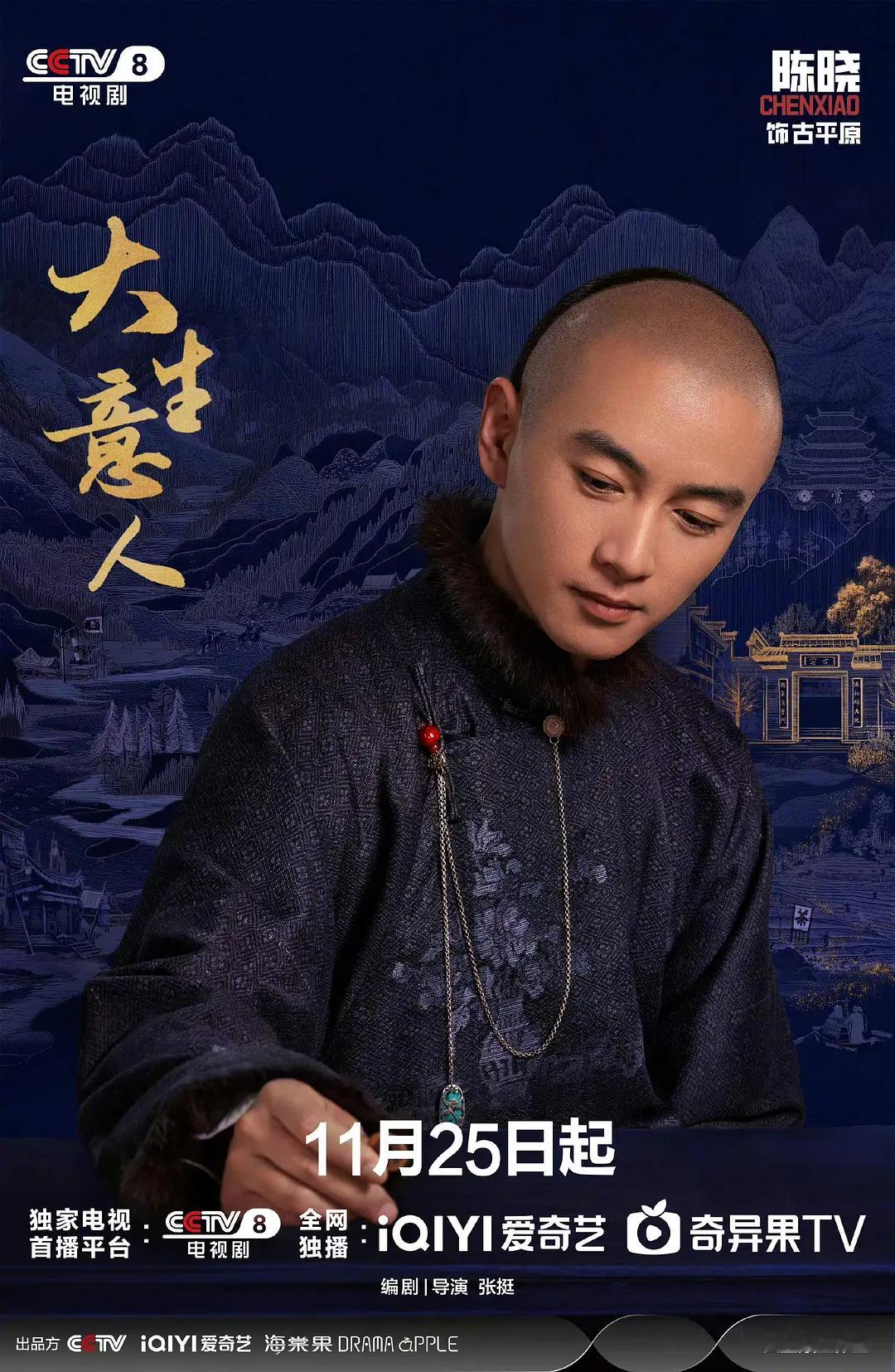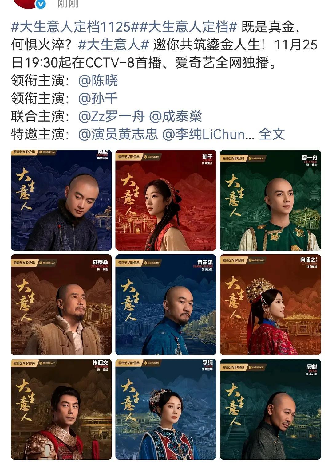《大生意人》定档11月25日开播,陈晓享受大男主换行待遇,孙千不适合古装,台词也很现代,不过看预告戏份应该不多,那个罗一舟戏份看预告感觉很多。