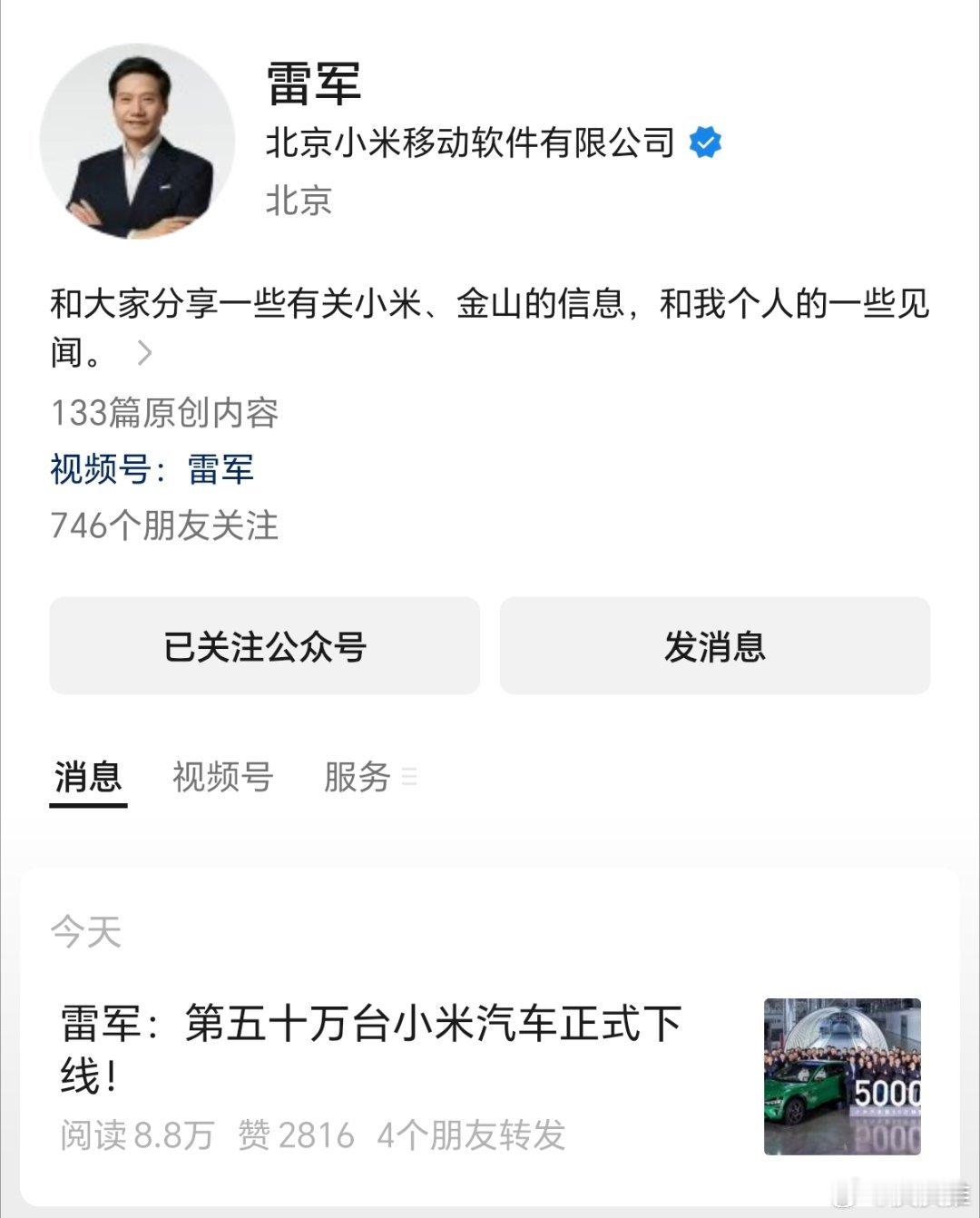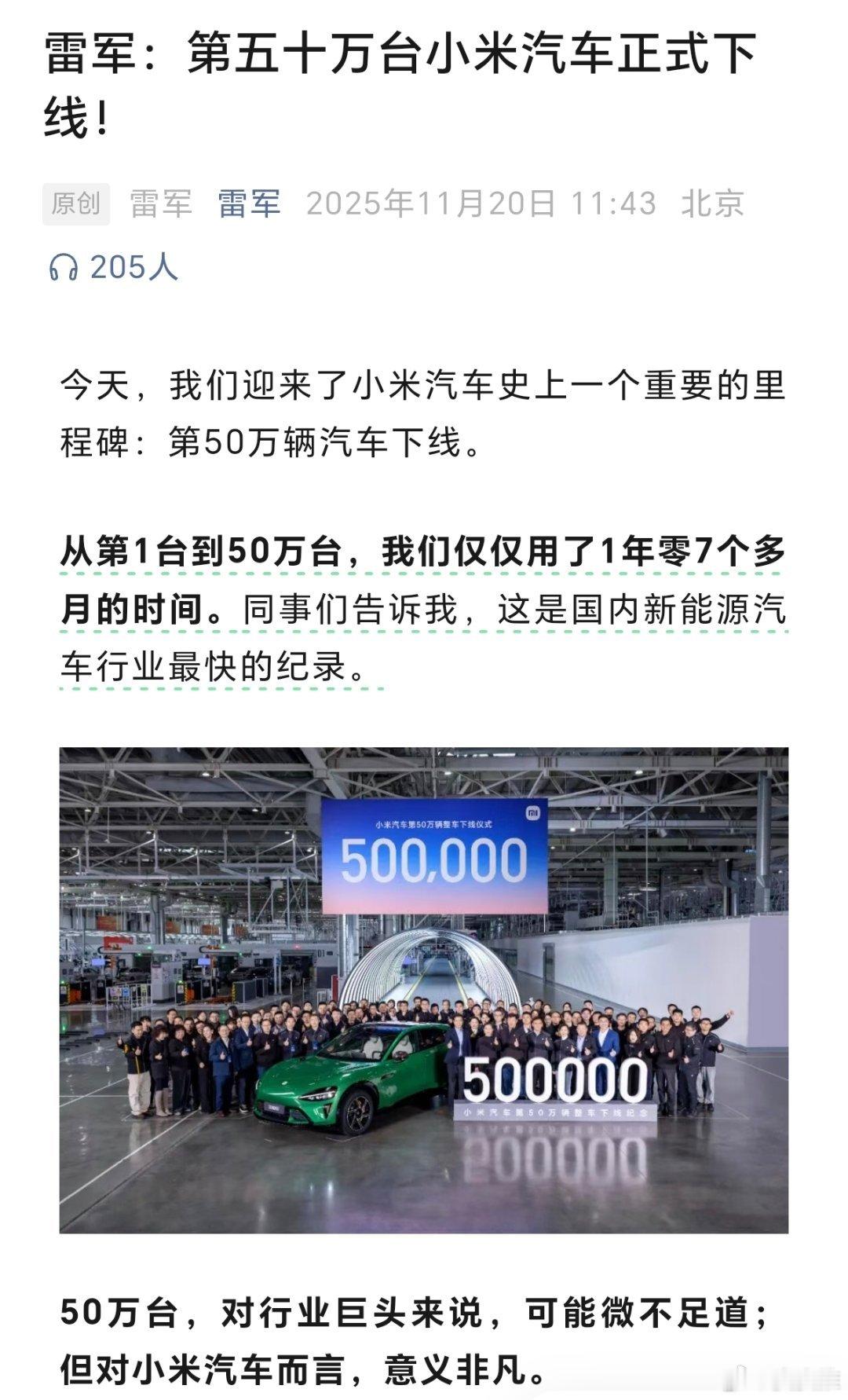 雷军重磅官宣:第五十万台小米汽车正式下线!这对于小米汽车和雷军而言,无疑是一个激动人心的时刻。尽管,网络上依然有不少刺耳的声音,但是,雷总依然砥砺前行,坚持把汽车安全放在第一位,小米汽车因而也取得了卓越的成绩,这也是有目共睹的。让我们一起祝贺雷总,祝小米汽车再创辉煌,也希望雷总早日再次成为中国首富。