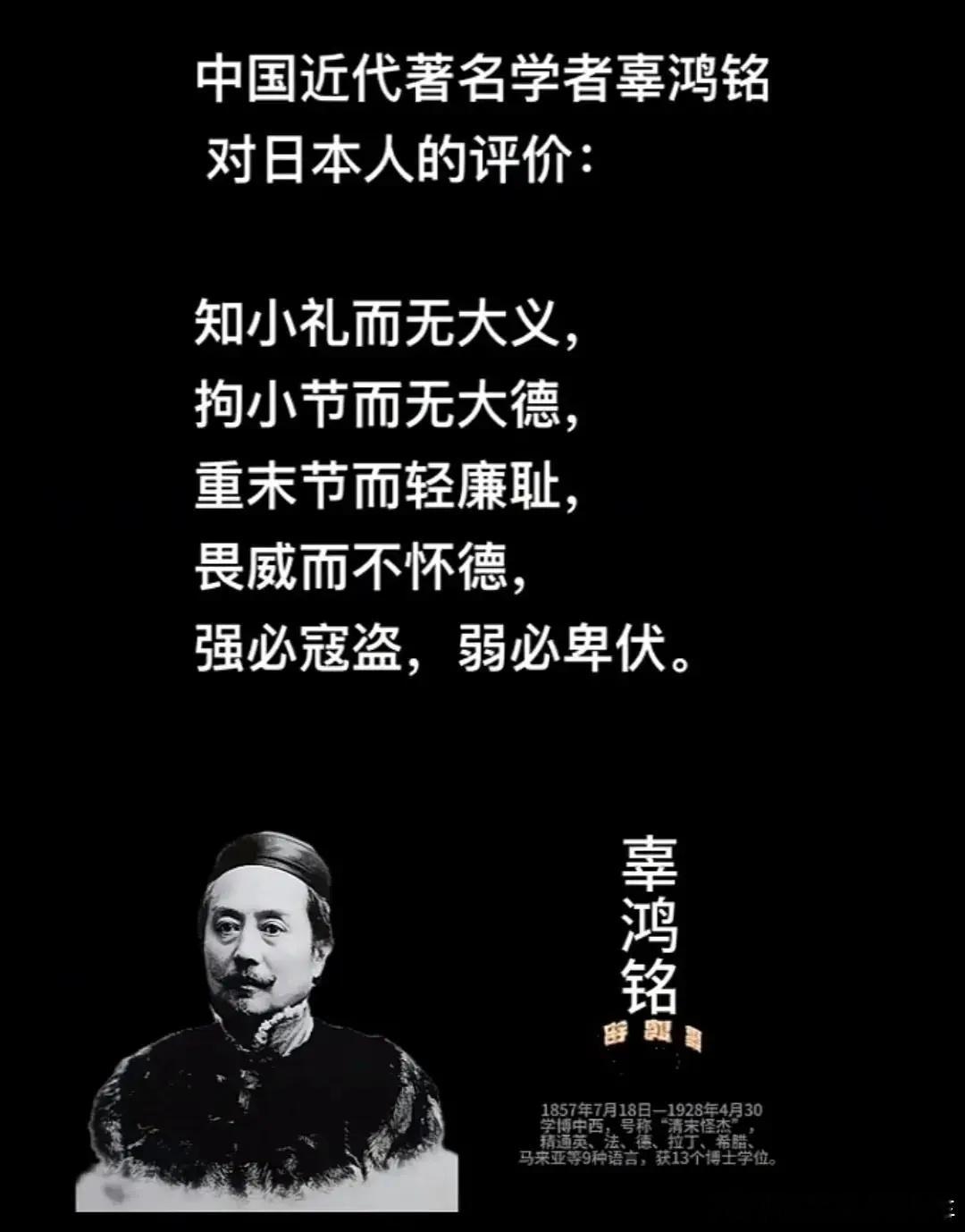 前阵子在东京听导游说。东京立着两个人的塑像。一个是李梅,就是轰炸东京、李梅烧烤的李梅。一个是麦克阿瑟,曾经的日本天皇的太上皇,指挥向日本扔原子弹的人。日本人对这两个征服者无比的崇拜。1964年,李梅还获得日本最高级别的勋一等旭日大绶章,李梅被日本认为是拯救了他们的英雄!相反,再看中国和日本,从唐朝到民国进行了4次战争。唐朝白江口之战,日本大败,然后开始派遣唐使来大唐学习。明朝丰臣秀吉侵略,明朝和日本发生了朝鲜战争。明朝惨胜。清朝甲午中日战争,清军大败。从1931年到1945年,日本全面侵华,直至抗日战争胜利。对比可以看出,日本人的本性和野心,就是学习中国,侵略中国。日本只服打败他的人。想以德服日本,做梦去吧。对日本,永远要保持警惕,永远要以打服之心去对待他们。否则就是东郭先生和狼。清朝辜鸿铭对日本总结得很精辟。知小礼而无大义。拘小节而无大德。重末节而轻廉耻。畏威而不怀德,强必寇盗,弱必卑伏。