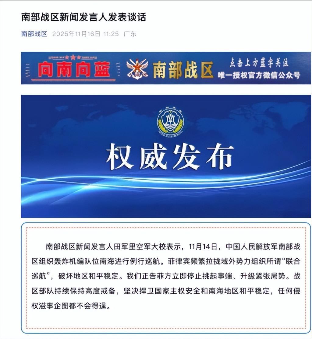 南海的风,突然变了味。美军航母跑了,而且是夹着尾巴跑的。解放军的轰炸机群来了,这次直接点名菲律宾。马尼拉这下,恐怕真的没有退路了。 多家外媒都在关注一个惊人的动向。11月14日,中国人民解放军南部战区组织了一次轰炸机编队的“例行巡航”。 但这次巡航极不寻常,官方罕见地打破了以往“不针对第三方”的惯例,明确指出这是针对菲律宾拉拢域外势力的“联合巡航”。 这无疑是一次毫不掩饰的硬核警告。 此次行动的主力是解放军的轰-6系列轰炸机,其中不仅有反舰专用的轰-6K,还有海军型轰-6J与具备战略打击能力的轰-6N。 这些战机可以挂载突防速度高达10马赫的鹰击-21反舰导弹。 军事观察家指出,这样的编队足以对任何大型水面舰艇发起饱和攻击。 南部战区发言人田军里空军大校表态,他正告菲方“立即停止挑衅”,直指其频繁拉拢美、日等国搞所谓“多边海上合作活动”,正在严重破坏地区稳定。 客观来看,解放军此次行动并非无的放矢。 就在同一天,菲律宾武装部队正联合美国印太司令部和日本海上自卫队,在黄岩岛东南海域进行所谓的第13次“多边海上合作活动”。 这已经是2025年以来,美日菲在南海举行的第8次联合演习。 马尼拉方面似乎铁了心要将域外势力这潭水搅入南海,并以此为筹码,强化与美日的军事捆绑。 然而,他们似乎打错了算盘,没料到北京的反应会如此直接和强烈。中国的耐心显然正在被快速消耗。 真正让局势出现戏剧性转折的,是美军的后续动作。 仅仅三天后,也就是11月17日,一直在南海为菲律宾“撑腰”的美海军“尼米兹”号航母打击群,被发现匆匆驶离了南海。 其撤离路线更是意味深长。这艘巨舰没有选择开阔海域,而是选择穿越狭窄且水文复杂的菲律宾佛得岛水道。 该水道最窄处仅10公里,布满海底断崖,通常被视为航母通行的险地。 有分析认为,美军此举是为了规避解放军轰炸机群及航母编队的锋芒。 面对解放军已经具备的强大区域拒止和饱和打击能力,美军显然不愿意拿自己宝贵的航母去冒险,选择了“避其锋芒”的务实态度。 值得注意的是,这艘“尼米兹”号航母本身也问题缠身。 它已服役长达50年,原定2025年退役,因接替舰“肯尼迪”号延迟交付而被迫超期服役。 就在10月26日,该舰在南海半小时内竟连续发生两起舰载机坠毁事故,舰体老化问题暴露无遗。 美军的收缩似乎是系统性的。几乎在同一时间,早前部署在日本的“堤丰”中程导弹系统也同步撤离。 这一系列动作被广泛解读为美国在“第一岛链”的一次重大战略性收缩,显示其正在重新评估与中国直接军事对抗的风险。 美国人虽然撤走了航母,却给菲律宾留下了一些“安慰奖”。 美国海军陆战队第1无人机联队的MQ-9A“死神”察打一体无人机,已经进驻菲律宾的巴萨空军基地,声称要为菲方提供“情报支援”。 马尼拉自身也在加速军事现代化,不仅采购了以色列的“赫尔墨斯”无人机,还计划斥资5亿美元建设无人艇基地。 然而,军事专家普遍认为,这些装备在解放军体系化作战能力面前,威慑力极为有限。 无论是“死神”无人机还是无人艇,都难以在解放军的055型万吨大驱和即将形成战斗力的福建舰航母面前生存。 美国的这种做法,更像是象征性地将菲律宾推向冲突前沿,自己则退到相对安全的位置。 菲律宾的处境因此变得异常尴尬。它在外交上正陷入前所未有的孤立。 在2025年的东盟外长会议上,包括印尼、新加坡在内的多个东盟国家,都曾批评菲律宾“引狼入室”,指责其违反了《东盟宪章》的“非军事化”原则。 与此同时,菲律宾国内的矛盾也日益尖锐。 根据2023年的数据,该国贫困率高达15.5%,但其2025年的国防预算却暴增至3151亿比索。 马科斯政府被指挪用教育、医疗等民生资源用于军事扩张。 不少评论指出,马科斯政府企图通过在南海的冒险挑衅,来转移国内民众对腐败丑闻和台风灾害等问题的视线。 但这种饮鸩止渴的做法,不仅未能换取美国的实质性安全保障,反而加剧了国内的民生危机。 反观中国,其在南海的布局则显得愈发沉稳和有力。 解放军在南海的战备巡航早已实现常态化,并且战术手段日益多样。 随着福建舰的即将入列,中国海军将正式进入“三航母时代”,对南海的控制力将得到质的飞跃。 国防部发言人蒋斌在11月7日的记者会上曾明确表示,菲方“拉拢域外势力挑衅是南海紧张的根源”,并强调中方“不纵容恶人告状、以小讹大”。 这番表态,如今看来,正是后续强硬行动的预告。