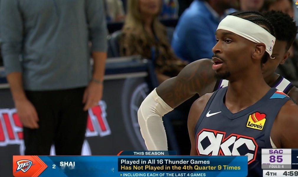 ▲亚历山大出战了本赛季16场比赛,没有缺席▲其中9场比赛,他没打第4节