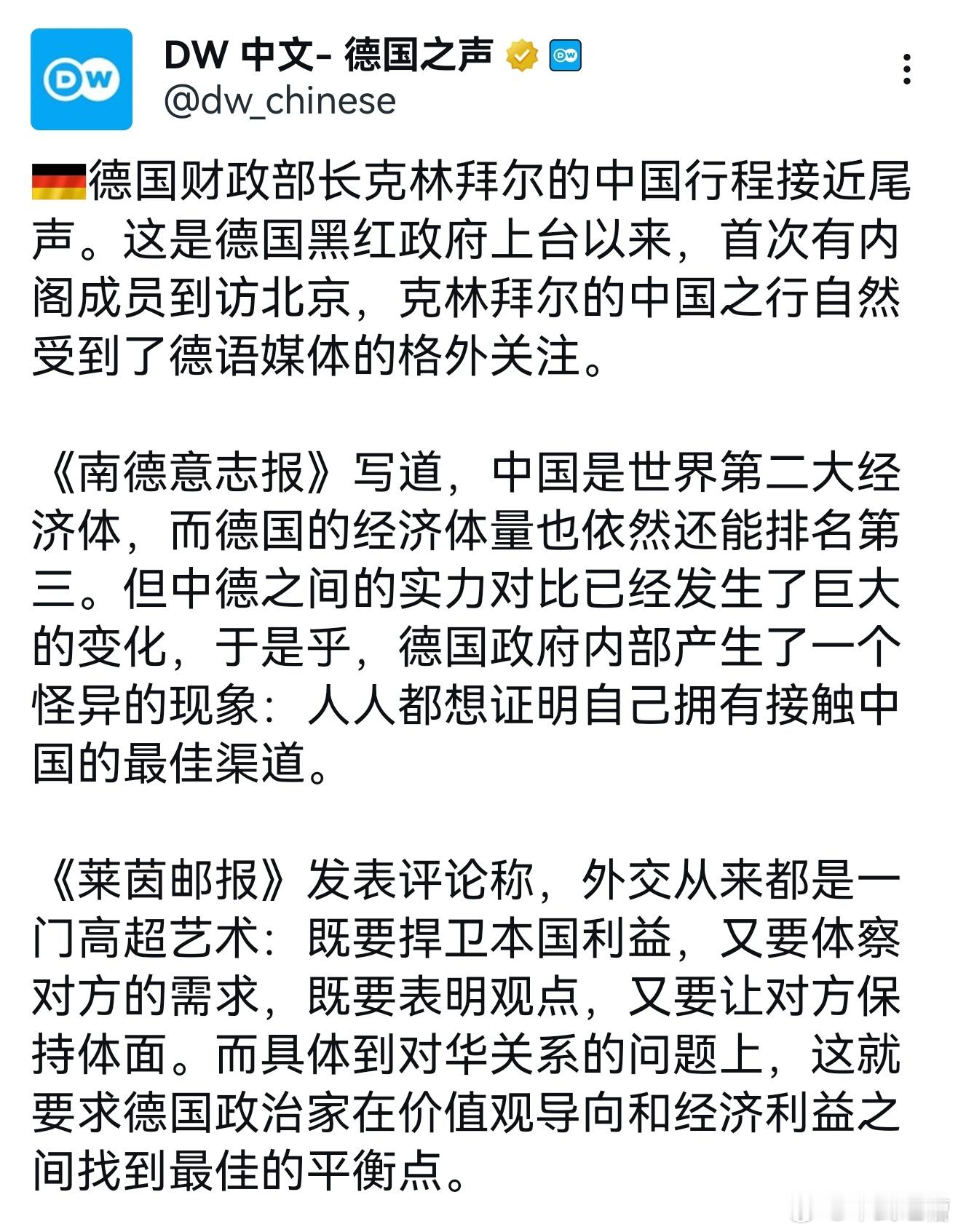 德国之声:现在德国政府内部,人人都在比,谁有接触中国的最佳渠道。虽然德国是世界第三经济体,但和中国相比,实力差距越来越大。