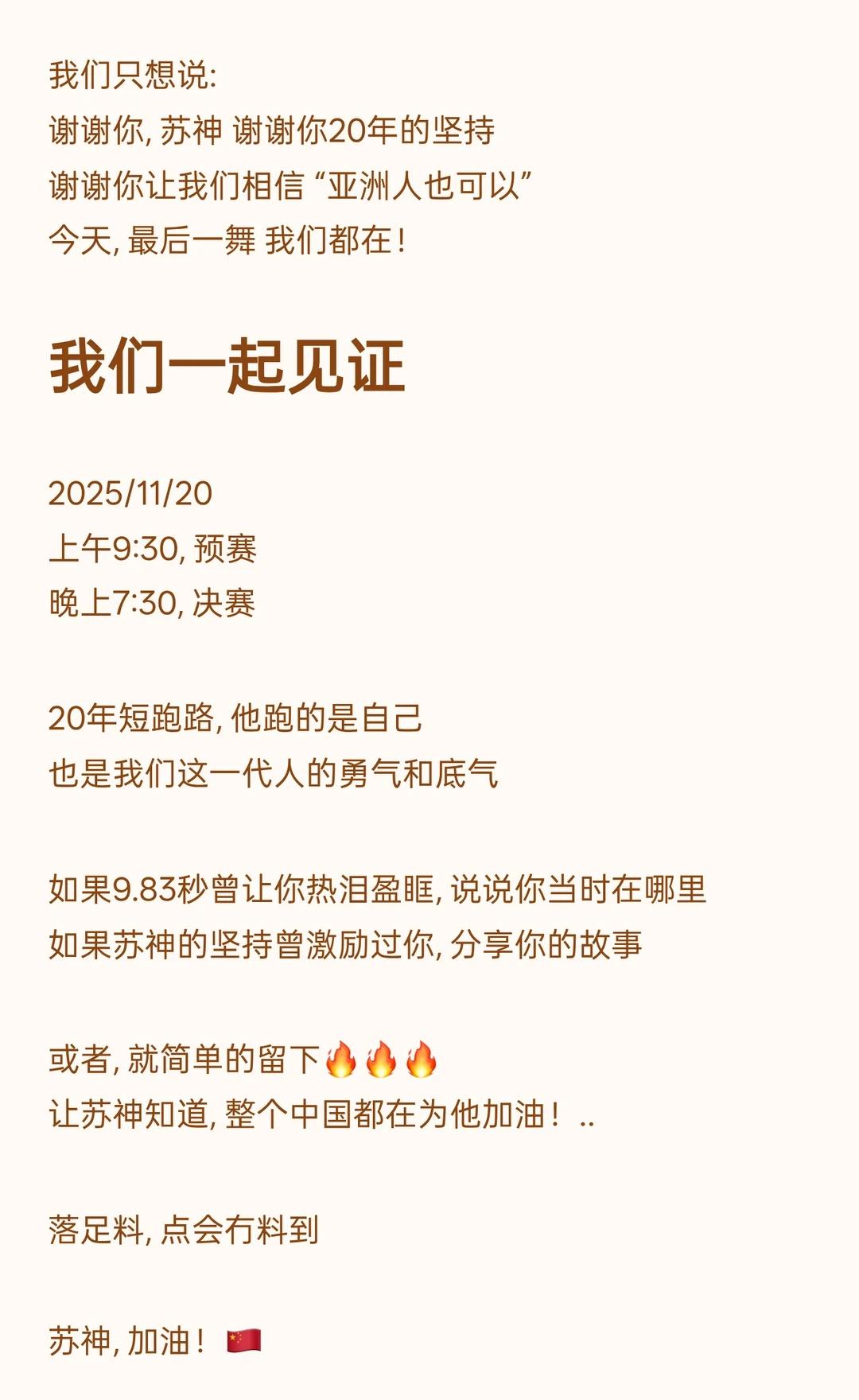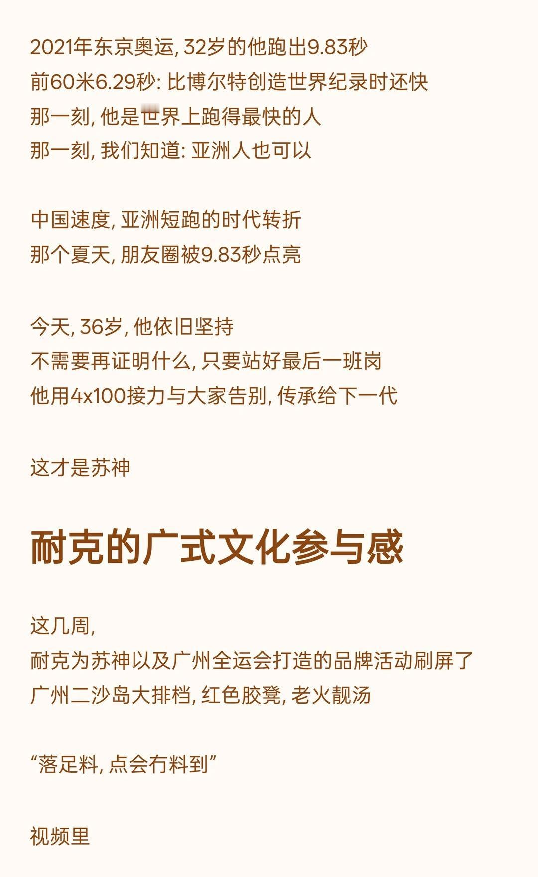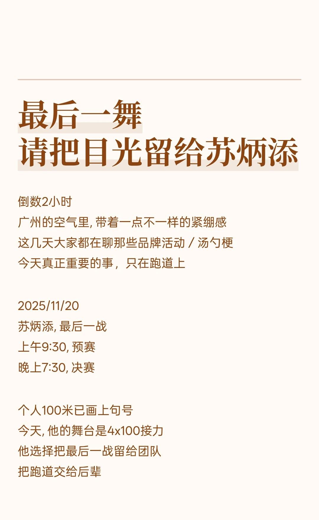 最后一舞, 请把目光留给苏炳添 今天,距离比赛只剩2小时。 广州的空气都紧了一点。 苏炳添,最后一战。 9:30 预赛 19:30 决赛 他不跑个人项目,把最后一棒留给团队,把舞台让给后辈。 我们记得的那一年: 2021 东京奥运 9.83 秒,亚洲纪录 前 60 米比博尔特还快 那一刻第一次意识到: 亚洲人也可以。 现在 36 岁,他仍然站上跑道。 不是为了证明,是为了坚持。 这,就是苏神。 过去几周,耐克的活动刷屏: 大排档、红色胶凳、靓汤、粤语文案、 “落足料,点会冇料到”。 创意好、本土化强、情绪到位。 但我看到讨论渐渐跑偏— 大家都在说汤勺、胶凳、文旅可以学。 很少人提起: 今天是 11 月 20 日 苏炳添最后一战 9.83 秒的意义 中国速度的精神 真正值得被看见的,是他身上那种: 换脚起跑的勇气、推翻肌肉记忆的决心、伤病后的坚持。 这才是“Just Do It”的本质。 今天,不聊品牌。 今天属于他。 从中山体校的少年,到奥运决赛的亚洲第一人, 20 年,跑过凌晨四点的操场、跑过伤病、跑到历史。 品牌会过去,创意也会过去。 但他让我们相信的那句话不会 - “中国人也可以。” 见证最后一舞 2025/11/20 9:30 预赛|19:30 决赛 地点:广东省奥体中心 谢谢你,苏神。 谢谢你让 9.83 秒成为一代人的底气。 谢谢你让亚洲速度被世界看见。 如果你曾被 9.83 秒点燃, 如果你也想和他说一句“谢谢” 留一个 🔥 让他知道: 整个中国都在为他加油。 苏炳添 最后一舞 中国速度 全运会 苏神 nike 广州 中国田径