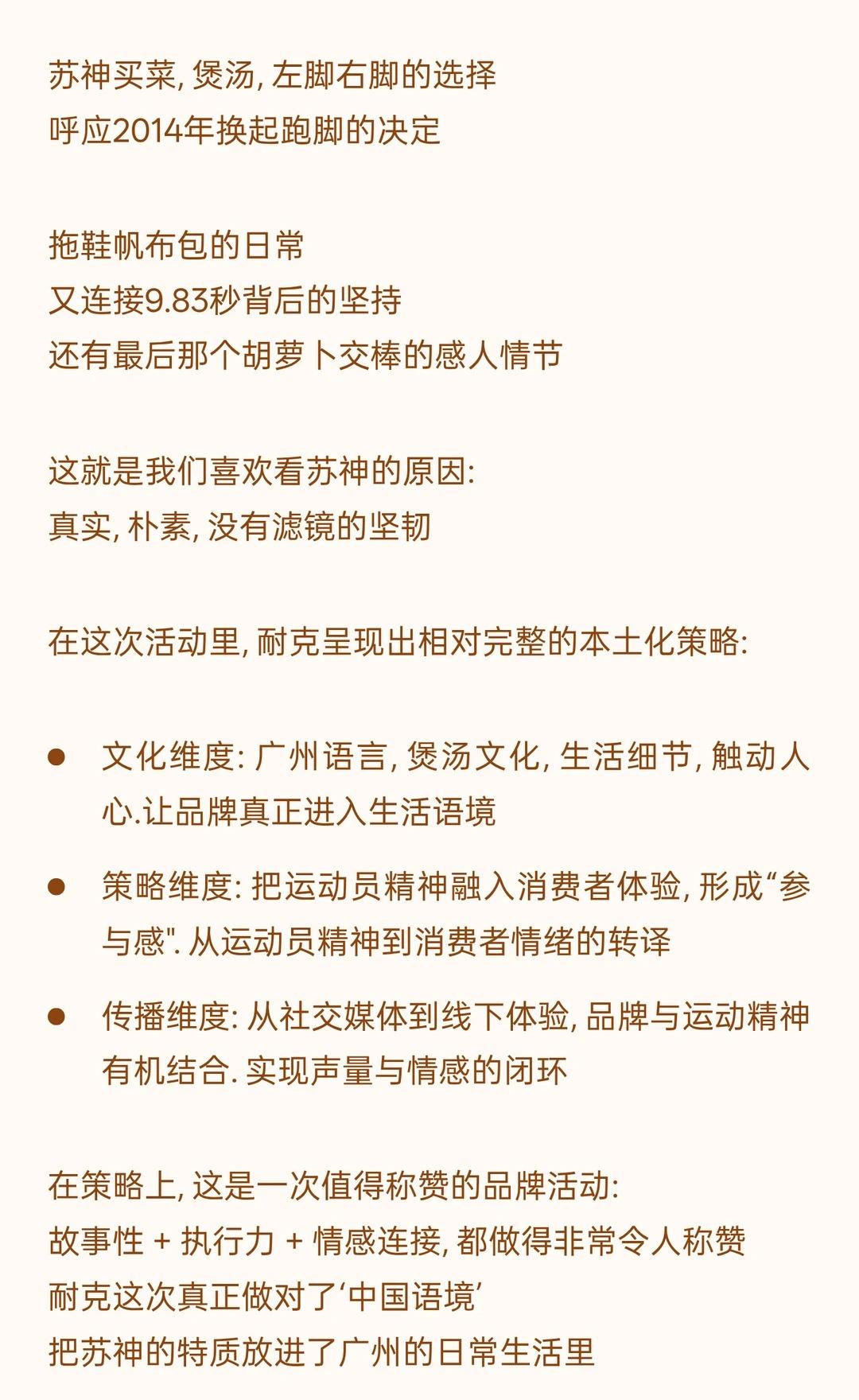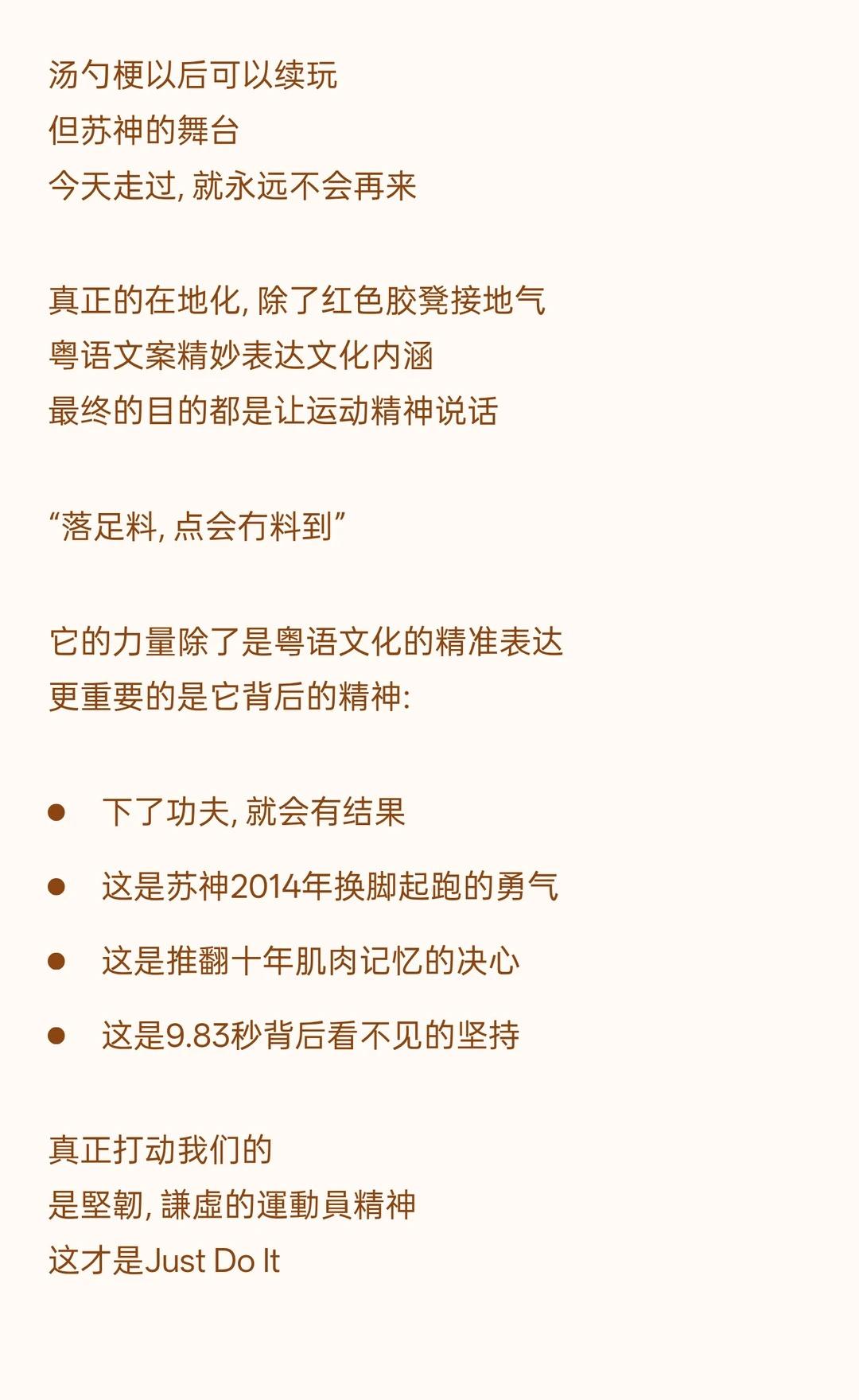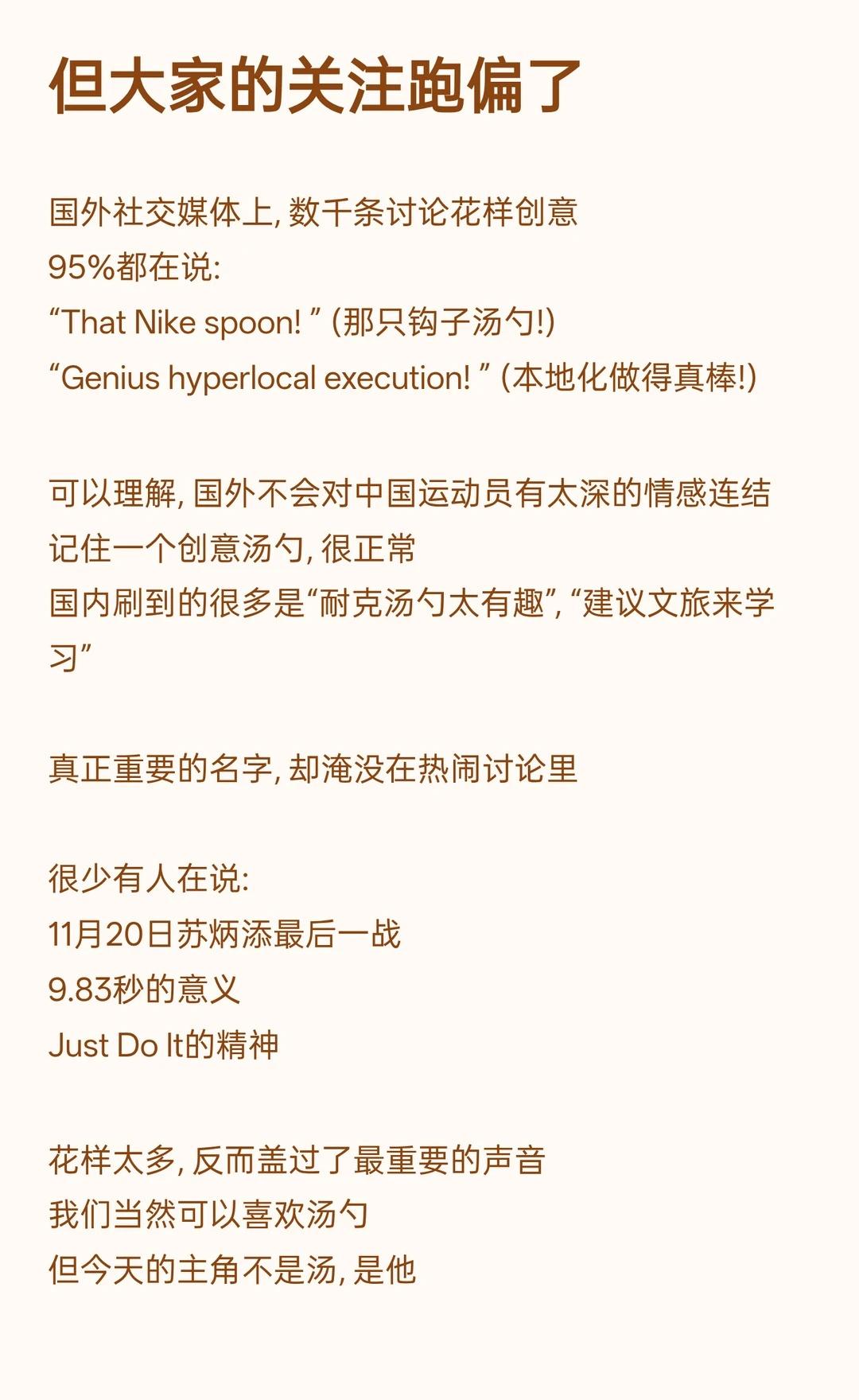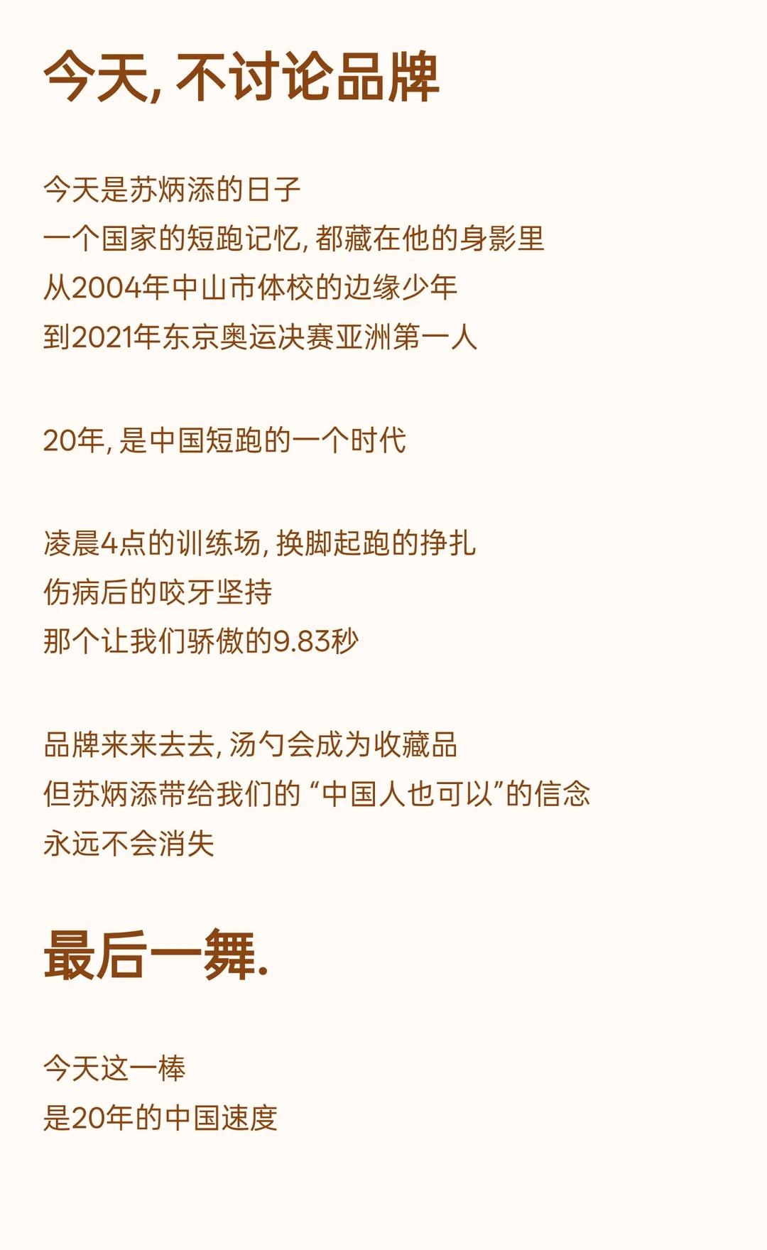 最后一舞, 请把目光留给苏炳添 今天,距离比赛只剩2小时。 广州的空气都紧了一点。 苏炳添,最后一战。 9:30 预赛 19:30 决赛 他不跑个人项目,把最后一棒留给团队,把舞台让给后辈。 我们记得的那一年: 2021 东京奥运 9.83 秒,亚洲纪录 前 60 米比博尔特还快 那一刻第一次意识到: 亚洲人也可以。 现在 36 岁,他仍然站上跑道。 不是为了证明,是为了坚持。 这,就是苏神。 过去几周,耐克的活动刷屏: 大排档、红色胶凳、靓汤、粤语文案、 “落足料,点会冇料到”。 创意好、本土化强、情绪到位。 但我看到讨论渐渐跑偏— 大家都在说汤勺、胶凳、文旅可以学。 很少人提起: 今天是 11 月 20 日 苏炳添最后一战 9.83 秒的意义 中国速度的精神 真正值得被看见的,是他身上那种: 换脚起跑的勇气、推翻肌肉记忆的决心、伤病后的坚持。 这才是“Just Do It”的本质。 今天,不聊品牌。 今天属于他。 从中山体校的少年,到奥运决赛的亚洲第一人, 20 年,跑过凌晨四点的操场、跑过伤病、跑到历史。 品牌会过去,创意也会过去。 但他让我们相信的那句话不会 - “中国人也可以。” 见证最后一舞 2025/11/20 9:30 预赛|19:30 决赛 地点:广东省奥体中心 谢谢你,苏神。 谢谢你让 9.83 秒成为一代人的底气。 谢谢你让亚洲速度被世界看见。 如果你曾被 9.83 秒点燃, 如果你也想和他说一句“谢谢” 留一个 🔥 让他知道: 整个中国都在为他加油。 苏炳添 最后一舞 中国速度 全运会 苏神 nike 广州 中国田径