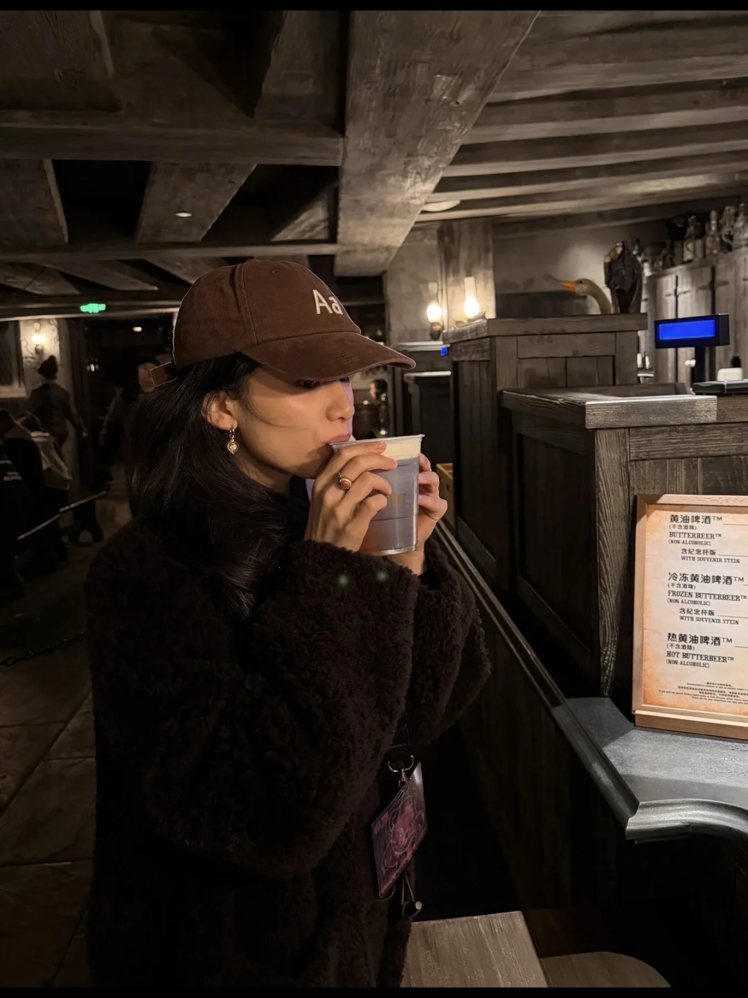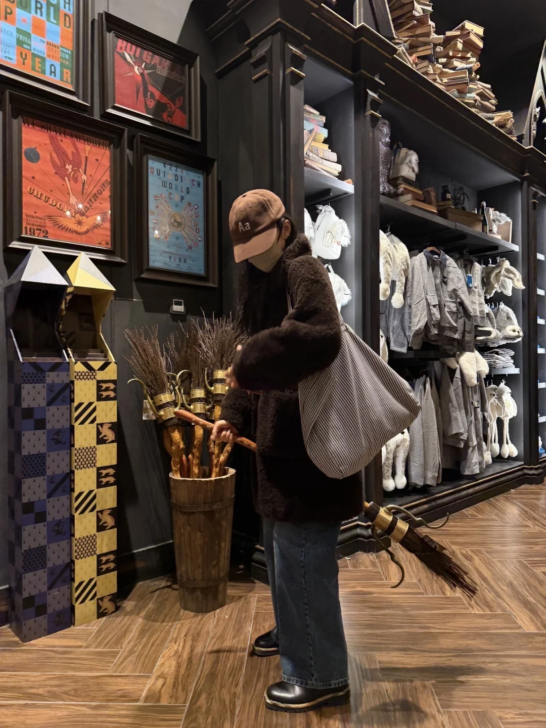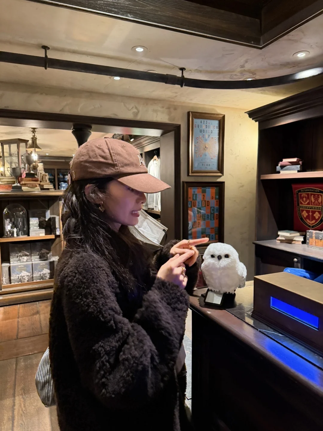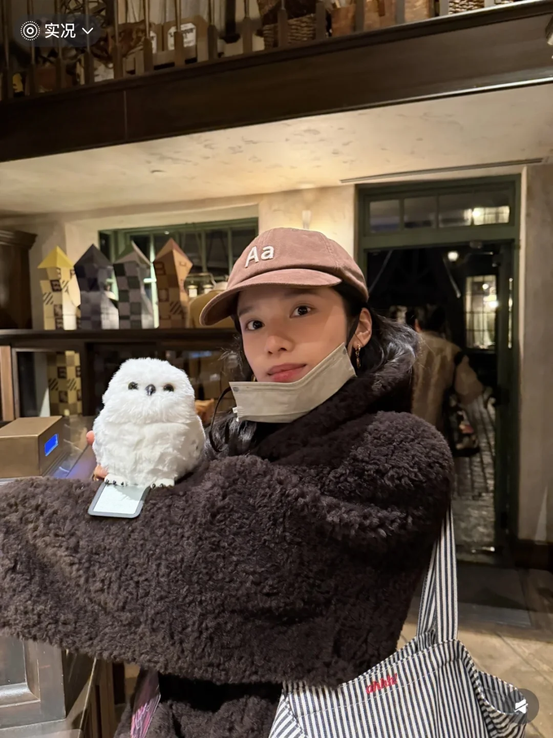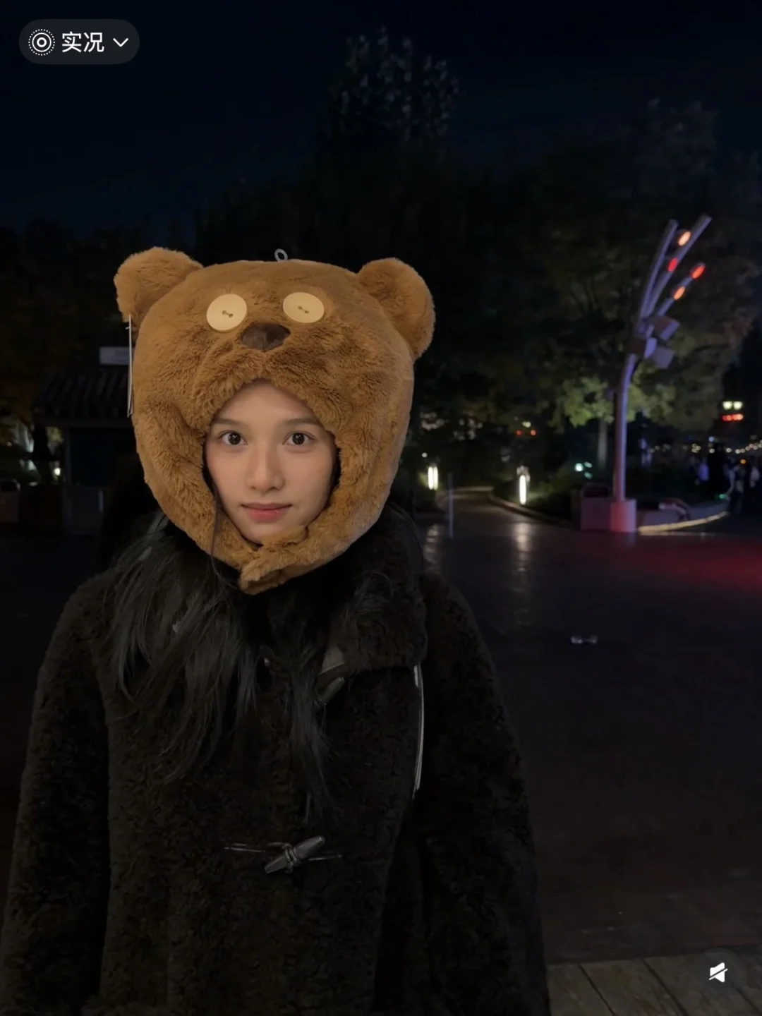 婧仪的环球打卡照也太有氛围了! 深棕毛绒外套裹得像颗软糯栗子,熊头套一戴可爱值翻倍,白天逛魔法商店摸扫帚、晚上在暖光下露笑,随性又甜,完全是“不费力的可爱”~ 原来环球影城的正确打开方式是和甜妹适配的毛绒穿搭!
