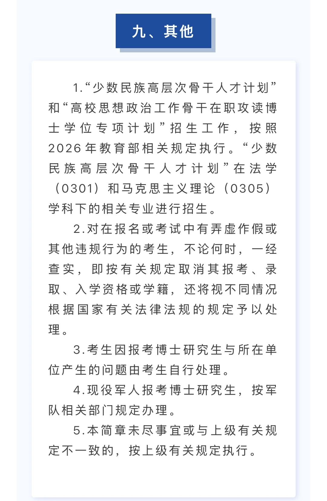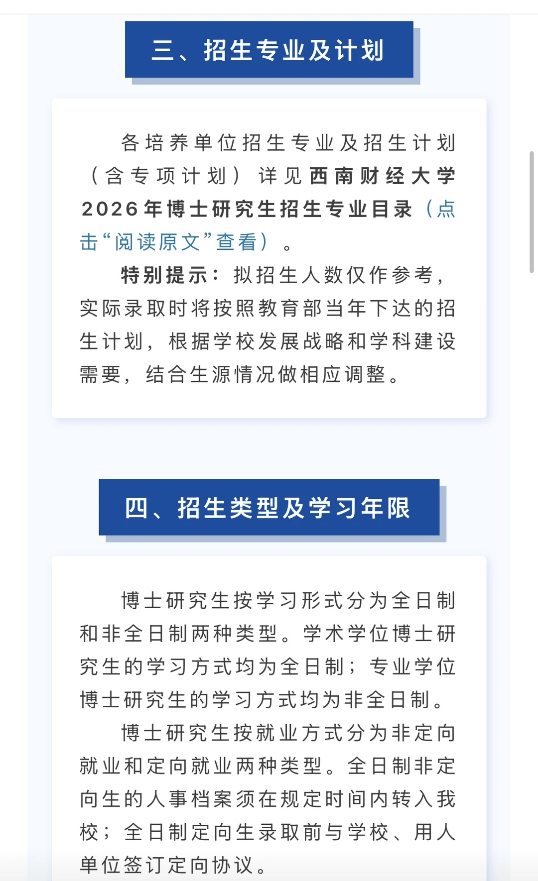 各培养单位招生专业及招生计划(含专项计划)详见西南财经大学2026年博士研究生招生专业目录(点击“阅读原文”查看)。特别提示:拟招生人数仅作参考,实际录取时将按照教育部当年下达的招生计划,根据学校发展战略和学科建设需要,结合生源情况做相应调整。