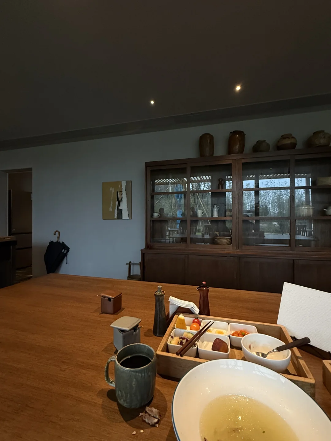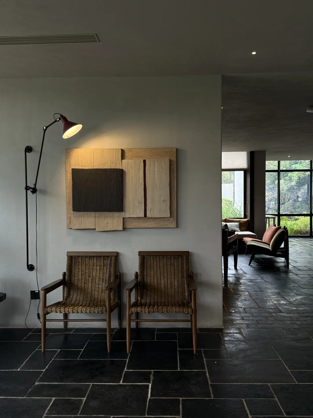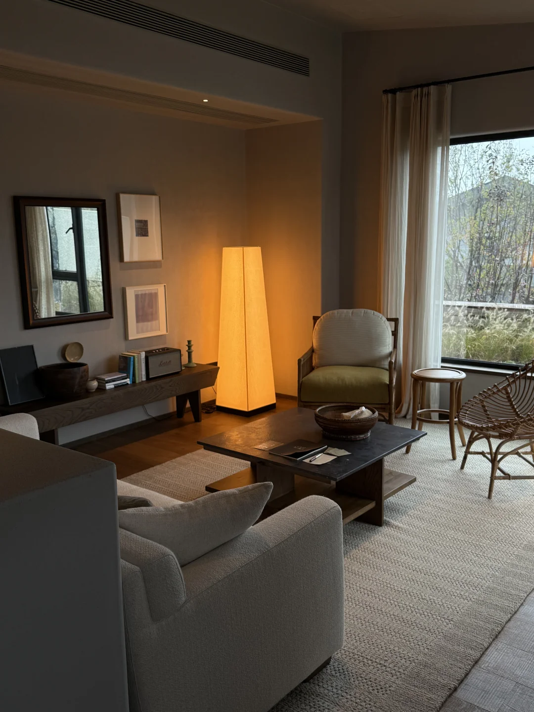 小众度假~逃离城市了两天 回来逢⼈必夸! 质感侘寂⻛ 可以永远相信谢柯的设计 公区布局很惊艳!房间温暖舒适 还有客厅 武汉⻋程1⼩时 整个民宿安静舒服 ⼼完全静下来了 下午喝喝咖啡 有手工活动能参加 很适合一家人来 旁边有⼀个类似艺术园区 可以逛有画展~ 我的5号房有个露台 晚上⼯作⼀会 在露台上听蝉鸣 跟家属聊天 全是泥⼟ ⾬⽔的⽓味 屋里音乐放着 简直五感洗礼!! 啊啊啊不开⼼就进⼭吧⛰️