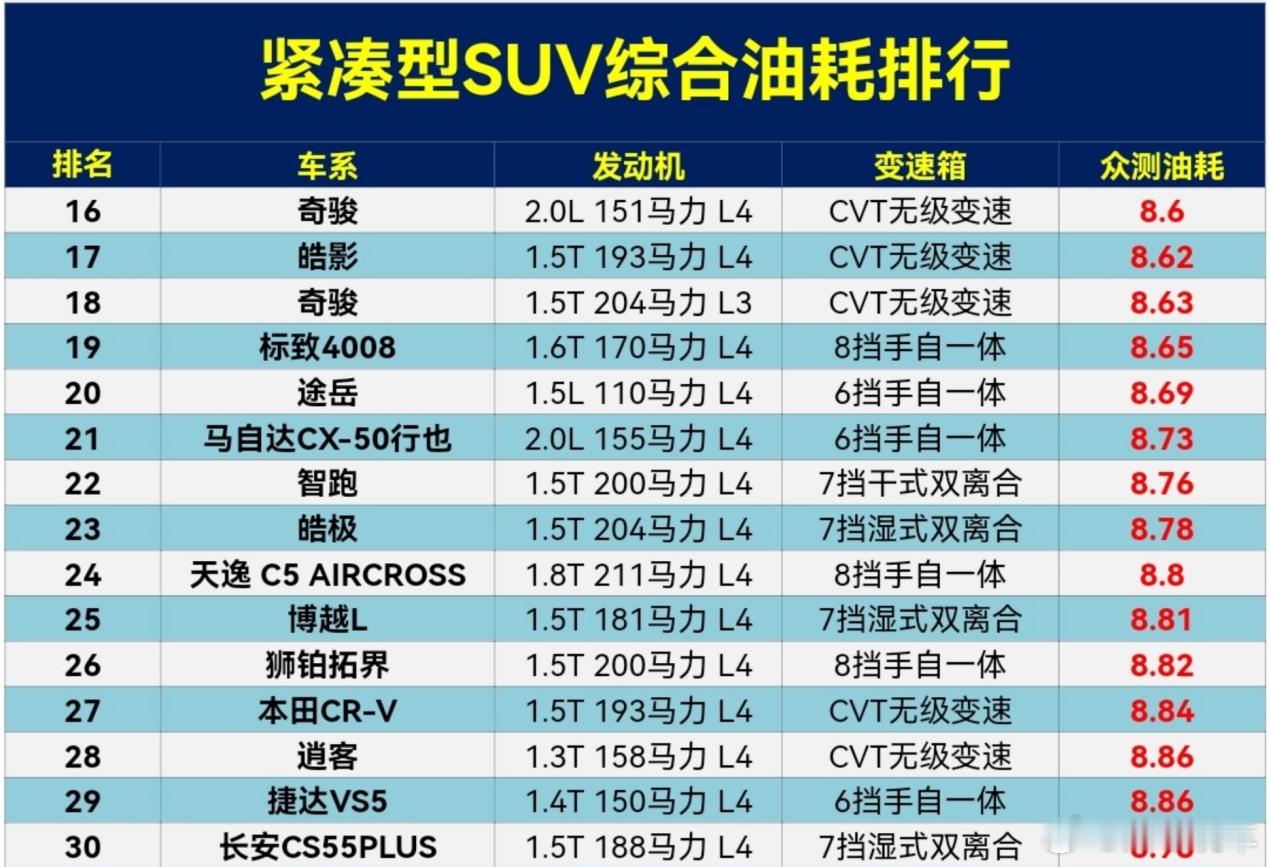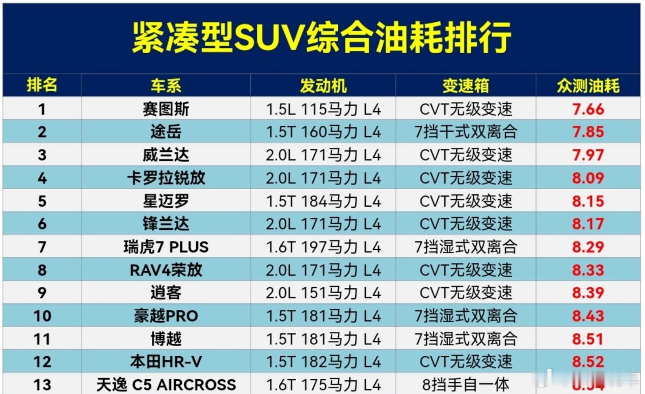 紧凑型SUV油耗排行:前10只有2款国产,倒数前3毫无意外油价涨多跌少,钱包越来越瘪,精明的车主们开始把油耗当作选车的“头号指标”。紧凑型SUV作为家用车市场的顶梁柱,谁能既省油又不失体面?一份来自真实车主众测的油耗榜单,或许能给出答案,不过结果可能出乎你的意料。这份涵盖88款车型的榜单中,仅有3款车的综合油耗成功控制在8升以内。起亚赛图斯以7.66升的百公里油耗拔得头筹,成为当之无愧的“省油王者”。大众途岳紧随其后,7.85升的成绩让它稳坐亚军宝座。而丰田威兰达则以8升的油耗勉强挤进前三,日系车的省油神话似乎遭遇了挑战。不过,省油的惊喜远不止于此。卡罗拉锐放和雪佛兰星迈罗双双杀入前五,油耗都稳定在8.1升左右。同样取得8.1升成绩的丰田锋兰达虽与前五失之交臂,却依然证明了自己实力。看来省油这事儿,早已不是某个品牌的独家绝活。日系阵营中,丰田RAV4荣放以8.5升以下的油耗排在第八位,日产逍客则成功跻身前十。令人惊讶的是,奇骏仅排名第十六,8.6升的油耗表现中规中矩。法系和美系车这次也让人刮目相看——雪铁龙天逸C5 AIRCROSS、启辰大V和本田HR-V集体冲进前十五,油耗均未突破8.6升,彻底打破了“美系法系都是油老虎”的刻板印象。同样让人意外的,是本田CR-V,百公里8.84L的油耗甚至比动力见长的马自达CX-50行也还高,勉强排在了日产逍客之前,排名位列第27。国产车的表现同样可圈可点。奇瑞瑞虎7 PLUS一举杀入油耗榜前三甲,吉利博越也稳居前十五。这些国产车型用实力证明:在省油这条赛道上,国产与合资的差距正在快速缩小。不过,别急着被低油耗冲昏头脑。油耗固然重要,但绝不是选车的唯一标准。当你为省下几个油钱沾沾自喜时,是否考虑过安全配置是否缩水?动力表现能否满足需求?空间布局是否合理?要知道,车企可不会做亏本买卖,羊毛终究出在羊身上。对城市通勤族来说,低油耗确实是实打实的省钱利器。但如果你经常跑长途、载重物,那么动力与油耗的平衡才是更需要关注的重点。毕竟买车不是一锤子买卖,后期的使用成本、维护费用都该纳入考量。这份油耗榜单犹如是一面镜子,既照出了各家的技术实力,也折射出车企在节能技术上“军备竞赛”的本领。但聪明的消费者应该明白:没有完美的车,只有最适合自己的选择。在油价起伏不定的今天,你会为省油牺牲多少驾驶乐趣?这笔账,可得好好算清楚。