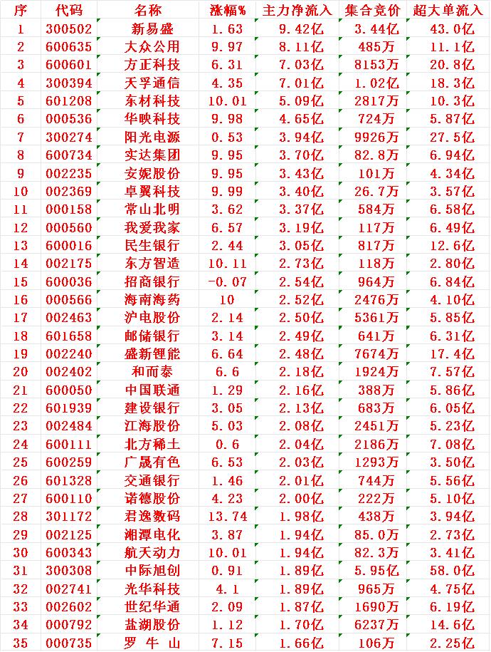 11月20日收盘,主力趁冲高,已经大幅卖出的35名单: 多氟多:净流入 -13.8亿元 香农芯创:净流入 -13.7亿元 宁德时代:净流入 -8.25亿元 航天发展:净流入 -7.12亿元 比亚迪:净流入 -6.90亿元 三花智控:净流入 -6.44亿元 赛力斯:净流入 -6.26亿元 隆基绿能:净流入 -5.33亿元 国联水产:净流入 -5.13亿元 永鼎股份:净流入 -4.81亿元 三六零:净流入 -4.79亿元 兆易创新:净流入 -4.78亿元 浪潮软件:净流入 -4.69亿元 亿纬锂能:净流入 -4.48亿元 长城军工:净流入 -4.19亿元 11月20日收盘,主力资金“大幅买入”的35名单: 新易盛:净流入 9.42亿元 大众公用:净流入 8.11亿元 方正科技:净流入 7.03亿元 天孚通信:净流入 7.01亿元 东材科技:净流入 5.09亿元 华映科技:净流入 4.65亿元 阳光电源:净流入 3.94亿元 实达集团:净流入 3.70亿元 安妮股份:净流入 3.43亿元 卓翼科技:净流入 3.40亿元 常山北明:净流入 3.37亿元 我爱我家:净流入 3.19亿元 民生银行:净流入 3.05亿元 东方智造:净流入 2.73亿元 招商银行:净流入 2.54亿元