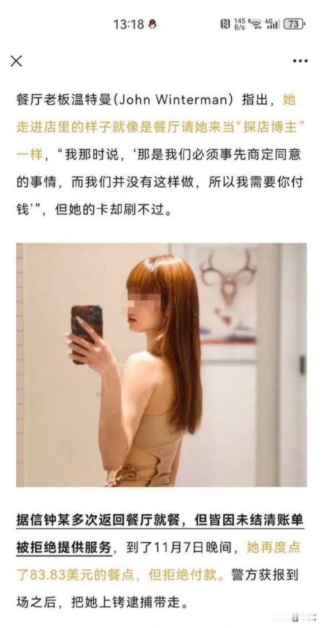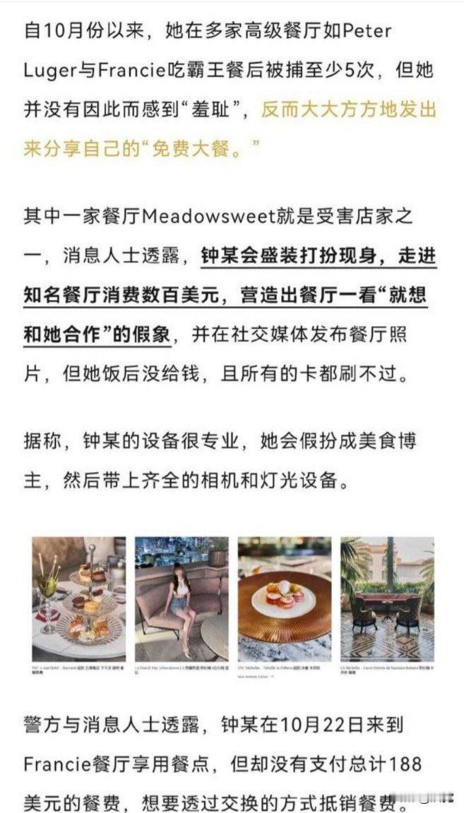 台湾网红美食博主钟某某 桃色黑料爆出利用美色换取免费用餐 台湾的网红美食博主钟某某 在纽约高端餐饮圈掀起巨“浪” 她以甜美外表和精致打扮闻名 经常进入米其林级别餐厅就餐 去过Peter Luger牛排馆 Francie意大利餐厅 Meadowsweet高端酒吧这些高档高奢场所 起初,她通过社交媒体 分享诱人美食照和自拍照片 获得很多粉丝追捧 后续知情人爆料 她多次利用自身魅力凭借自身美貌 钟乐伟精心打扮成各种性感造型 对着镜子自拍 展示出豹纹裙的野性魅力 裸背裙的曲线美 她通过这些姿势突出身体的魅力 游说餐厅负责人或者服务员私下达成交易 用身体的方式换取免费大餐 甚至在餐后直接逃单 留下巨额账单 警方调查显示 她从去年开始作案 至少涉及十多家餐厅 累计金额高达数万美元 更令人吃惊的是 她曾试图贿赂服务员销毁监控视频 以掩盖行踪 纽约警方已发出逮捕令 她匆忙删除所有社交账号 至今下落不明