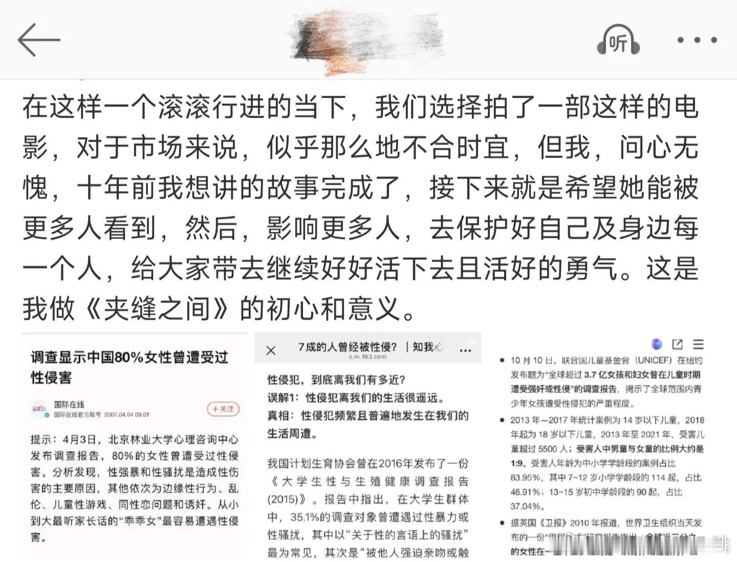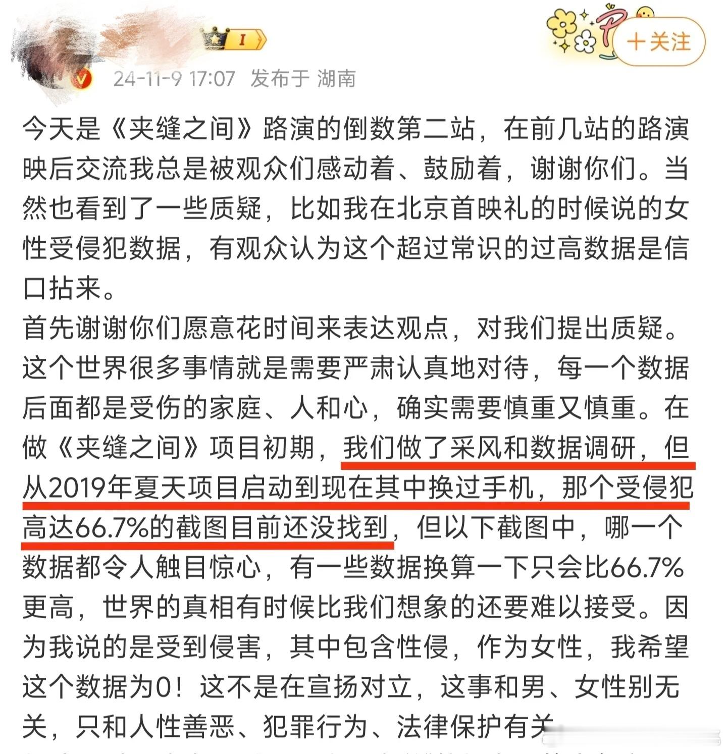 在电影《不该停止的追问》超前观影现场有位女观众声称“在全球有近35%的女性遭受过性暴力,也就是说10个人里面就有4个人遭受过,这样的一个概率”。我倒是真想问问这份数据具体出处在哪儿呀?调查范围、调查样本、调查时间、调查方式统统不提,单单只抛出来一个35%的数据,这能有啥可信度?还有35%对应的难道不是“10个人里面有3.5个人”吗?“10个人里面有4个人”难道不是40%吗?这波概率口述愣是虚空拉升5个百分点啊!大家别觉得这数据高得离谱,之前电影《夹缝之间》首映时还有位女演员抛出数据“女性被性侵和猥亵的比例数据是66.7%”,结果同样遭遇质疑。当大家询问数据出处时,这位女演员竟然表示“数据调研至今已经更换手机,截图目前没找到”,合着影视圈的数据调研就是上网搜索再截个图片是吧?这66.7%的数据确定不是反串吗?我听着咋那么像6.6666……无限循环后的四舍五入?是不是样本一共取了3个,其中2个样本都表示曾经遭受过性侵或猥亵?大家还是别觉得这数据高得离谱,这位女演员还在博文中贴出一张截图,截图显示“中国80%女性遭受过性侵害”。我查了一下这张截图中的四月天少女问题咨询热线,结果显示四月天热线负责人曾表示“一句话、一个动作、甚至一个眼神,都有可能伤害到一个女孩”……坦白讲,这年头的统计标准已经乱套了,你要是说男性看一眼也算性暴力的话,那么之前这些数据全都太保守了,努努力提升到100%也是可以做到的。如果这么无限延伸下去,到后面唯一没有受害经历的可能只会剩下刚刚降生的婴儿。在超前观影现场甚至还有观众携带多瓶辣椒水向其他人发放,这到底是认真的吗?你们到底是来品鉴电影的,还是借题发挥搞话题的?“影视寒冬”在这一刻突然具象化了!