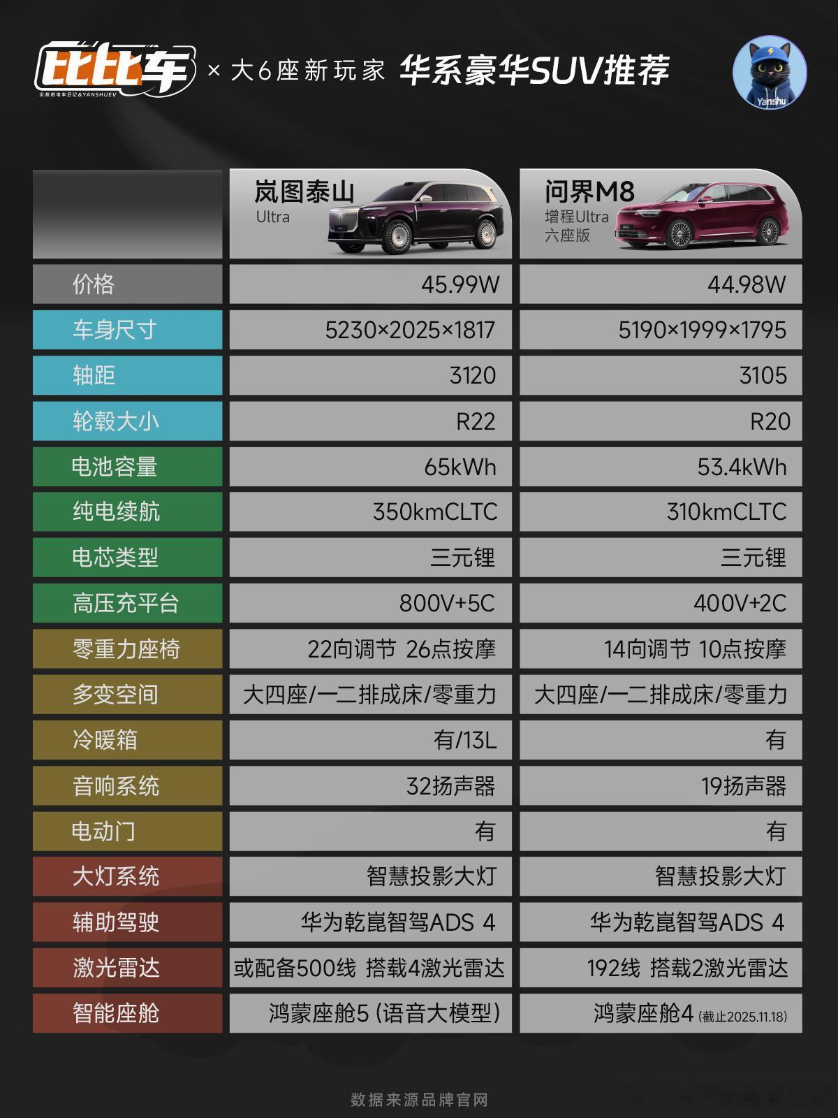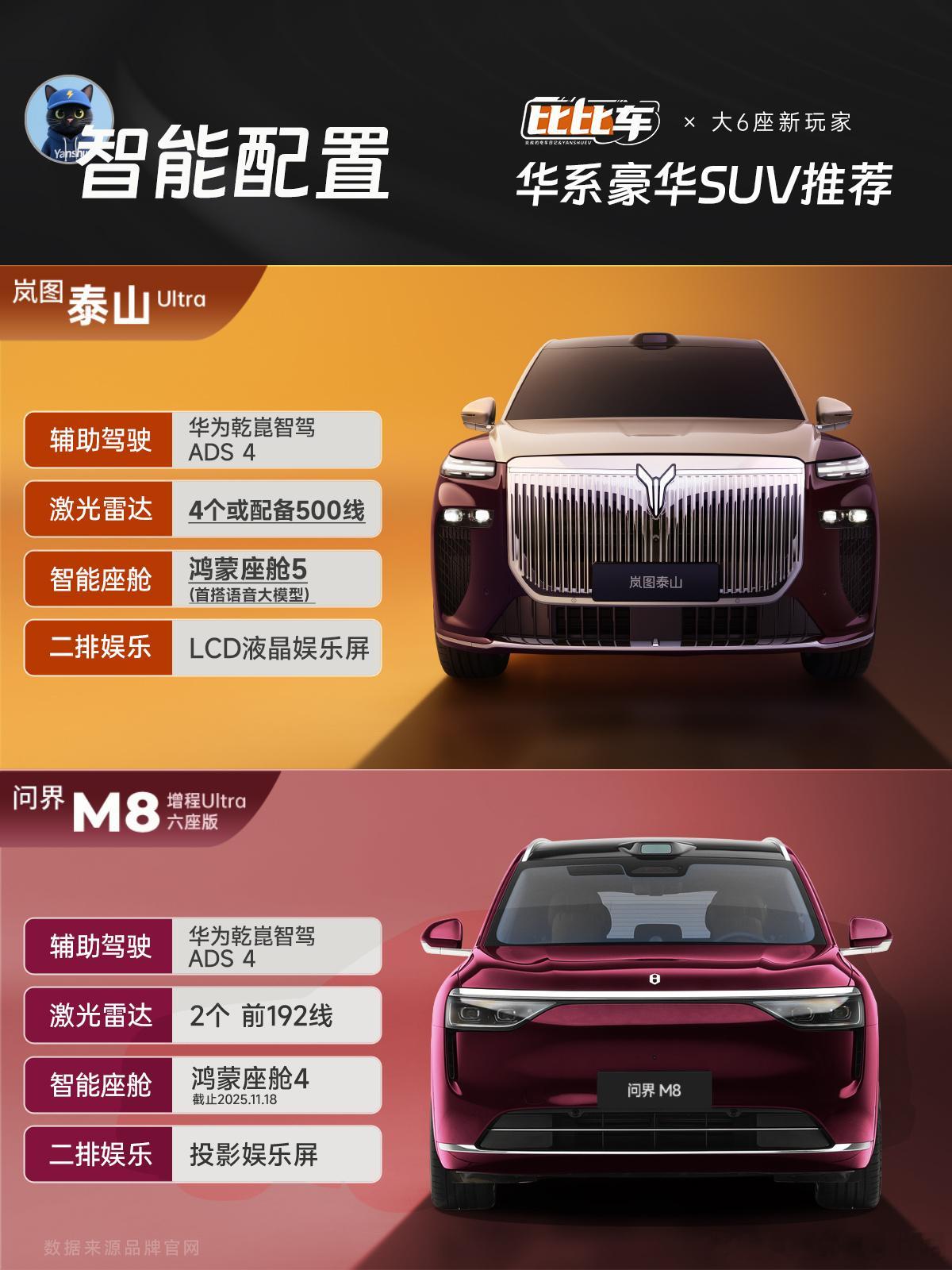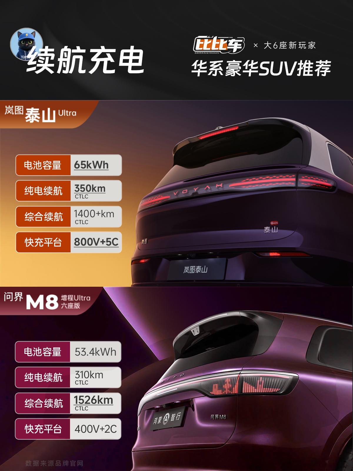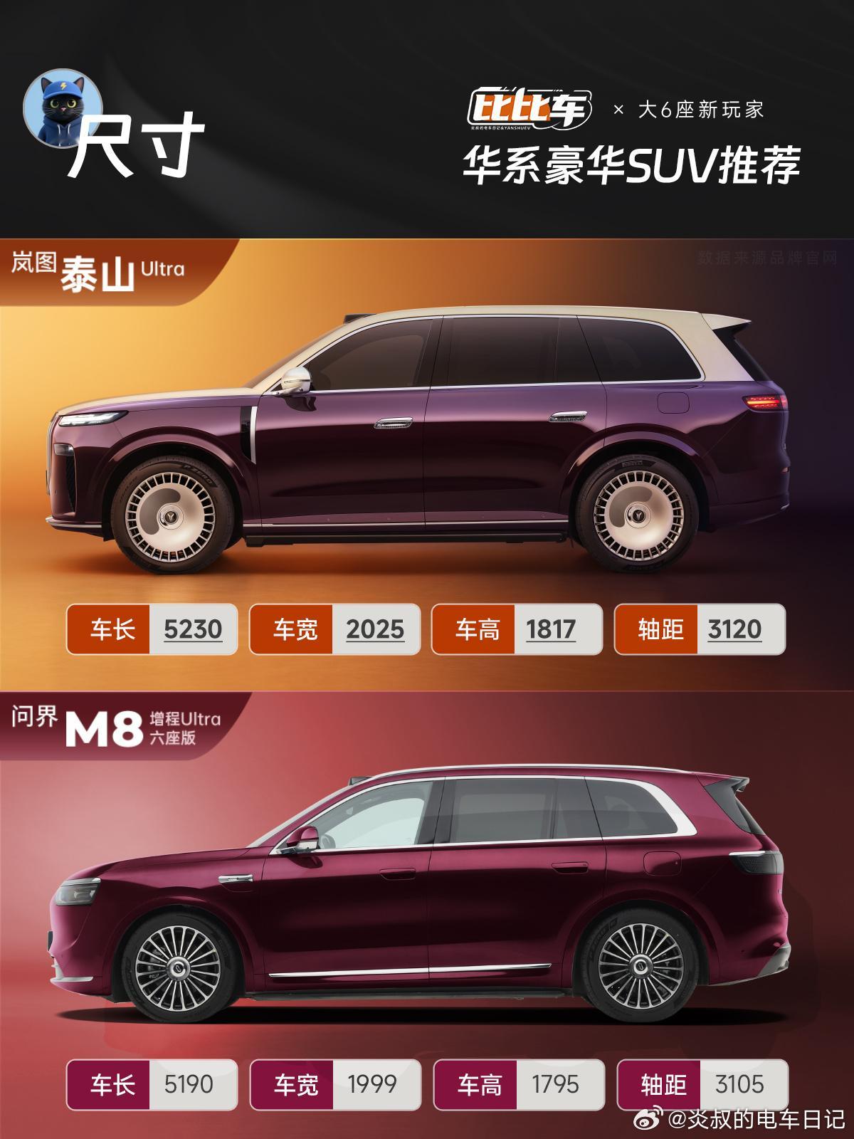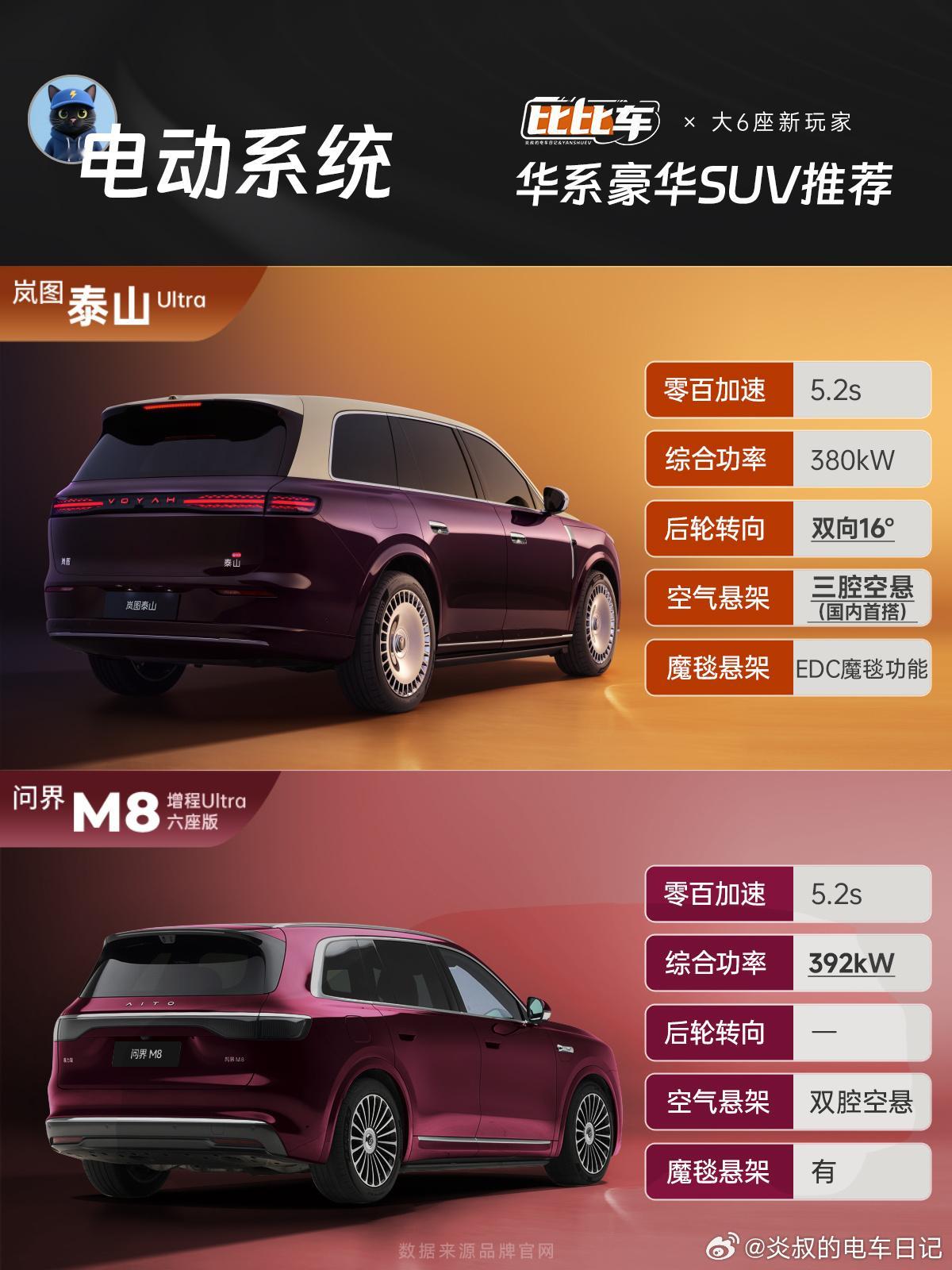 又掀桌了啊?华系大6座SUV变天岚图泰山发布后,很多朋友拿它和问界M8 增程Ultra六座版对比。这确实是同级很有代表的两个选项。今天从3个核心维度,帮大家做个客观梳理。🤗1️⃣续航和平台岚图泰山搭载岚海智能超混技术和800V+5C超充。标配65度大电池,CLTC纯电续航350km,综合续航超1400+。纯电续航基本做到市区周充,5C超充含金量很高,大大缩短补能用时。问界M8 增程ultra是增程式,53.4kWh电池,CLTC纯电续航310km,综合续航1526km。纯电续航也基本够用,400V架构充电稍慢,综合长途出行用油也没有里程焦虑。2️⃣底盘配置岚图泰山搭载三腔空气悬架,配合EDC魔毯功能。这在国内头一回见。实际表现值得期待。配备双向16°后轮转向,转弯半径仅5.4米。泰山在窄路掉头和进出小车位时相当灵活。问界M8搭载双腔空气悬架。配备的道路预瞄系统,提前感知和调整悬架,悬架高低和软硬解耦。既保证过颠簸路面时的舒适性;高速行驶时,保证操控和车身的稳定性。3️⃣座舱体验岚图泰山搭载鸿蒙座舱 5(首搭语音大模型)。亮点是AI云舒座椅,内置66颗传感器,自适应调节,带26点按摩。炎叔体验过很多座椅按摩车型,大都隔靴搔痒。泰山确实有让我秒睡的实力。配合13L智能冷暖箱和32个扬声器的影音体验,老板们通勤出行照顾到位了。问界M8搭载鸿蒙座舱4,车机大屏交互非常流畅。前排和二排标配通风、加热、按摩。配备车载冷暖箱、后排投影屏和19个HUAWEI SOUND扬声器。M8的后排也支持多种一键切换模式,4/5座模式特别适合大量行李的装载需求。 第三排坐姿观看投影屏也很舒服总的来看,两台车都是六座华系SUV里的实力派。岚图泰山配置诚意十足,鸿蒙座舱和华为乾崑智驾ADS 4基础上,800V平台、三腔空悬、后轮转向及AI云舒座椅配置拉满了。问界M8增程Ultra六座版表现均衡,气场沉稳,鸿蒙座舱和辅助驾驶能力也在国内一梯队,整车竞争力得到市场验证。欢迎在评论区聊聊你的看法我是只讲干货的炎叔。带你秒懂电车😉