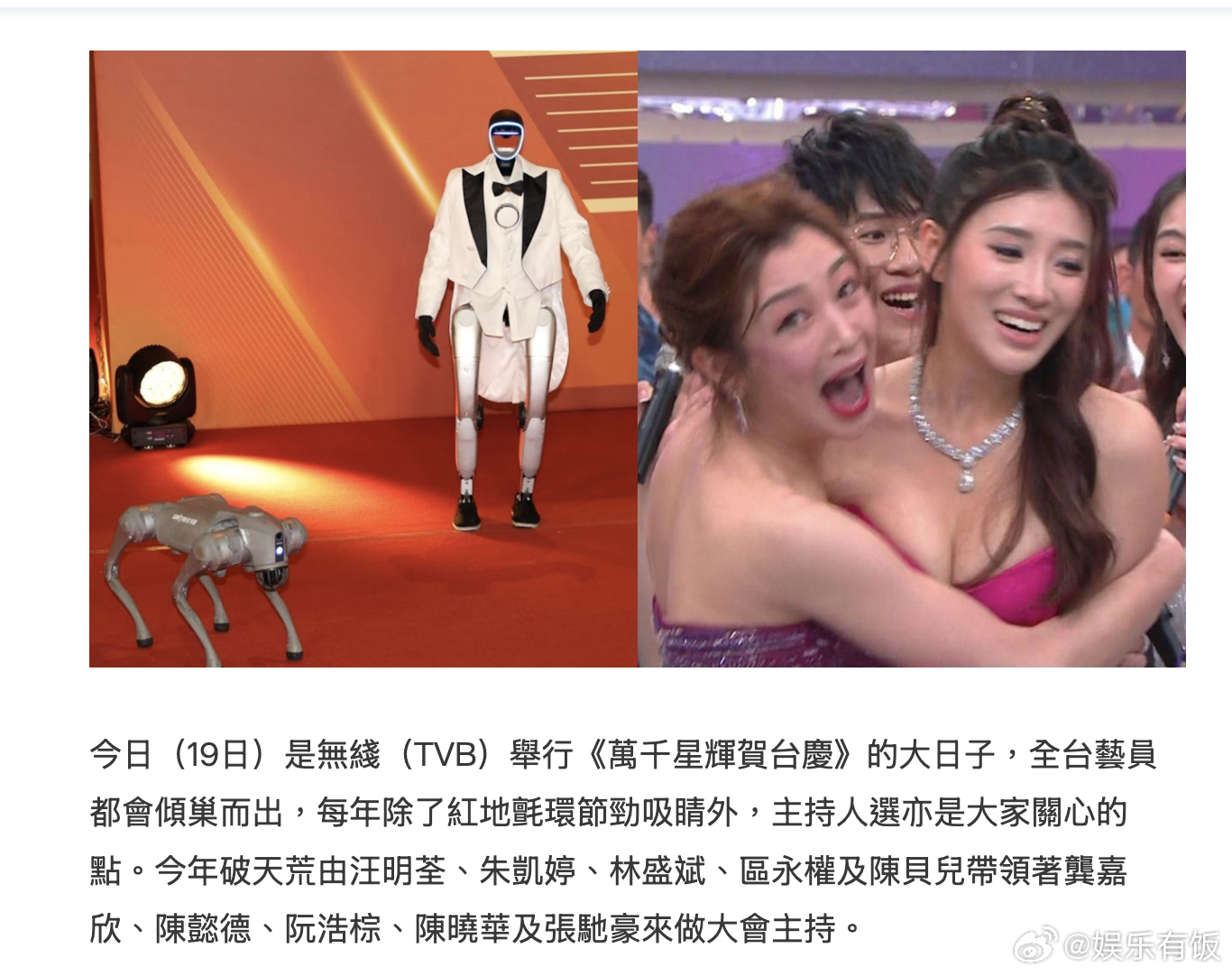 19 日,无线电视(TVB)年度盛事《万千星辉贺台庆》举行,相较于往年的主持阵容,今年台庆在主持配置上大胆创新,不仅精简人数至 10 人,更首次引入一位机器人及一只机械狗客串主持,取代部分传统主持人。