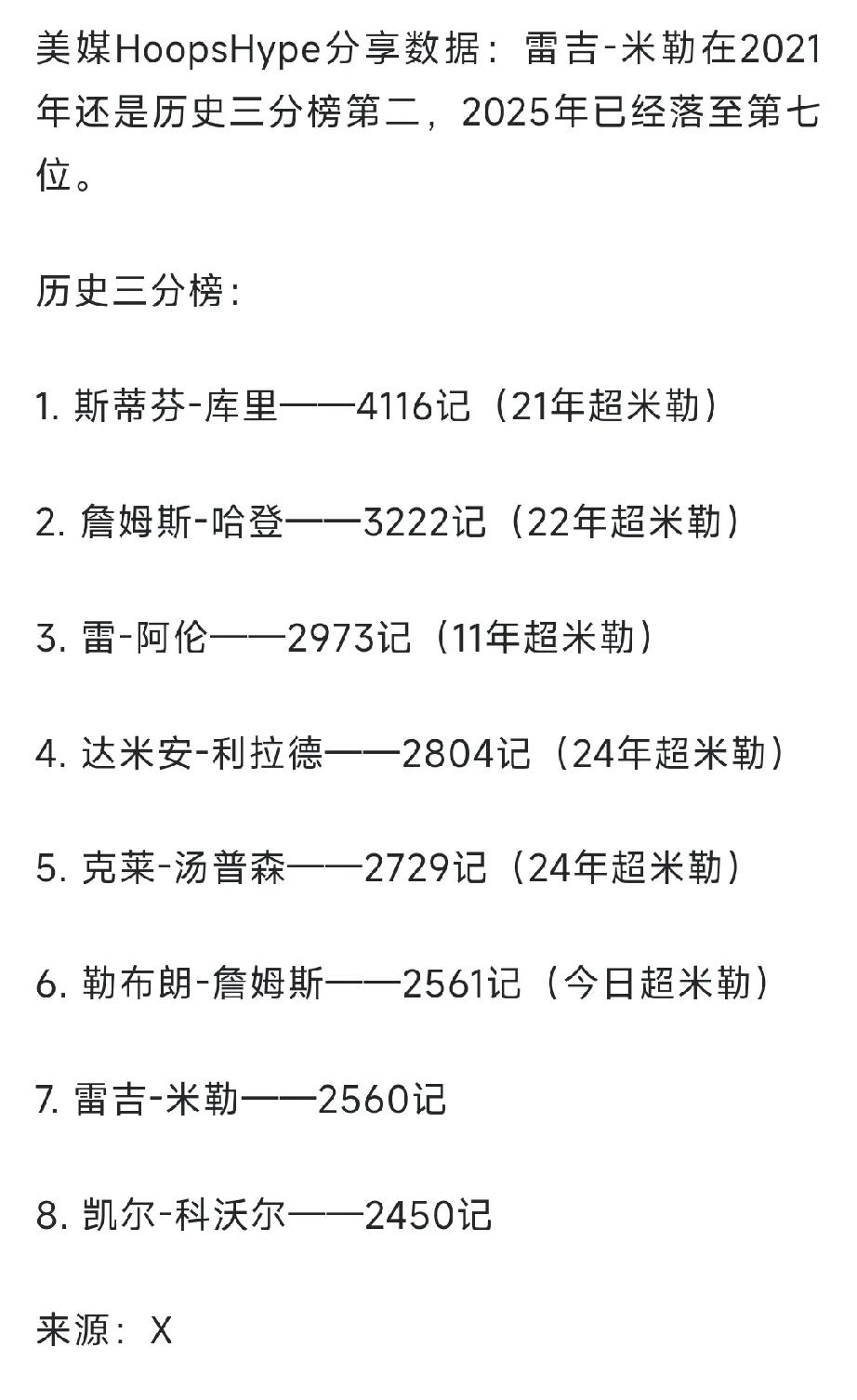 又完成一次超越,詹姆斯昨天的首秀投进2个三分,三分排行榜超越伟大的雷吉米勒排历史第六,雷吉米勒也是够倒霉的,4年前排历史第二,如今只能排历史第七了,不得不说这些后辈是真能投三分啊!那么问题来了,詹姆斯职业生涯结束后三分榜还能再进一步吗?