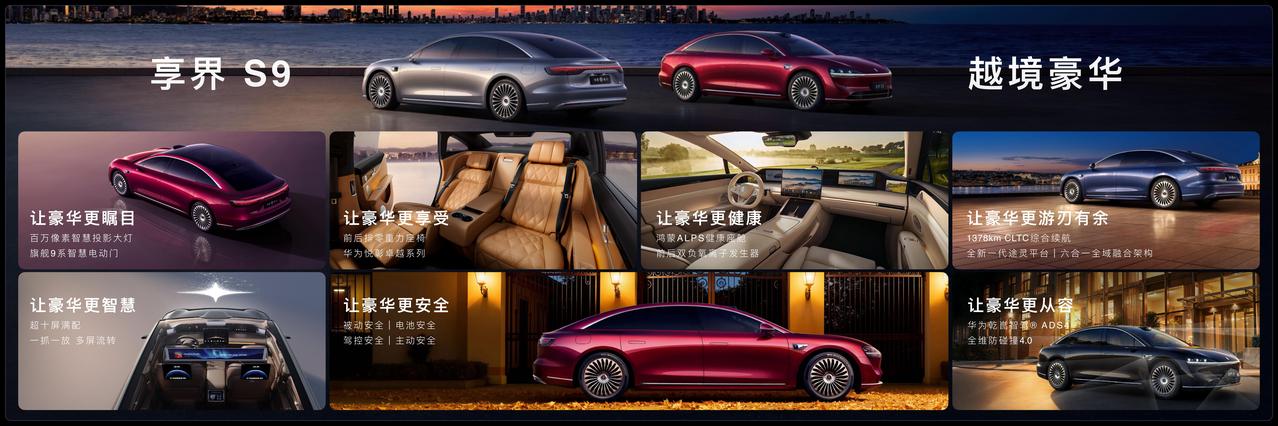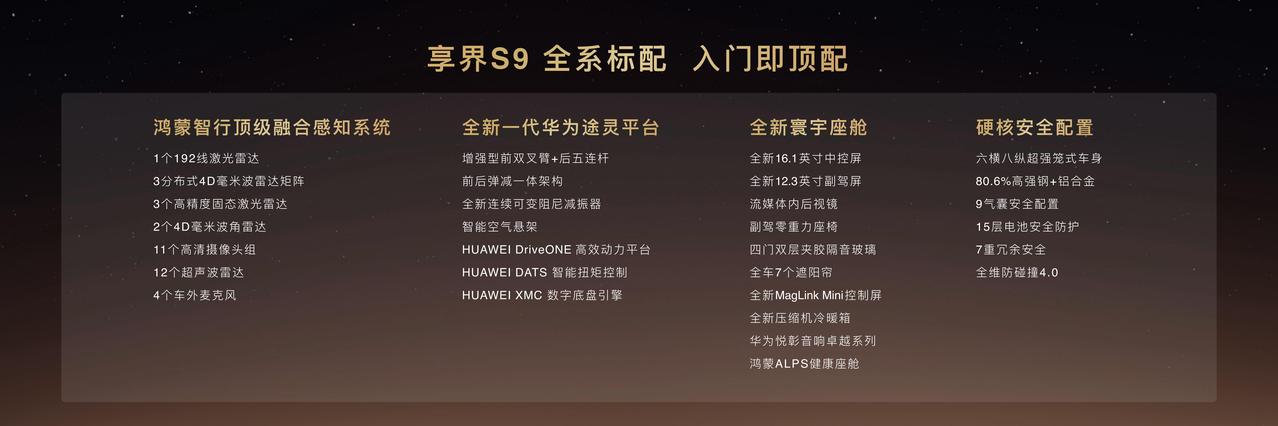 新款享界S9正式上市,内内外外都是亮点! 新款享界S9正式上市,新车共推出4个版本,其中享界S9增程版Max售价30.98万元,享界S9增程版Ultra售价34.98万元,享界S9纯电版Max售价32.98万元,享界S9纯电版Ultra售价36.98万元。下面就跟大家说说这款车到底有哪些亮点。 1.在外观设计上,新款享界S9采用了尊界S800同款全新星云尾灯、全新轮毂等,并且换装了寰宇之星车标、璀璨星河大灯,凸显出“旗舰9系”的配置亮点。 2.内饰设计变化不大,主要加入了副驾/后排零重力套装,以及32 英寸巨幕投影幕布、华为悦彰音响卓越系列。目的就是为了让车上的每一位乘客,都能享受到旗舰级车型所带来的豪华享受。 3.智能配置方面,新款享界S9搭载华为乾崑智驾ADS 4(全系标配36个高精度传感器),还有全新MagLink Mini控制屏,以及5个智慧电动门(隔空开门)。科技仪式感直接给你拉满。 4.动力方面,新款享界S9没有变化,依然提供增程版和纯电版,满足不用人群的出行需求。 5.最后就是购车权益了,新款享界S9首销期下定,更有至高60000元权益可享。感兴趣的朋友要捉紧时间下定了。【来自懂车帝车友圈】